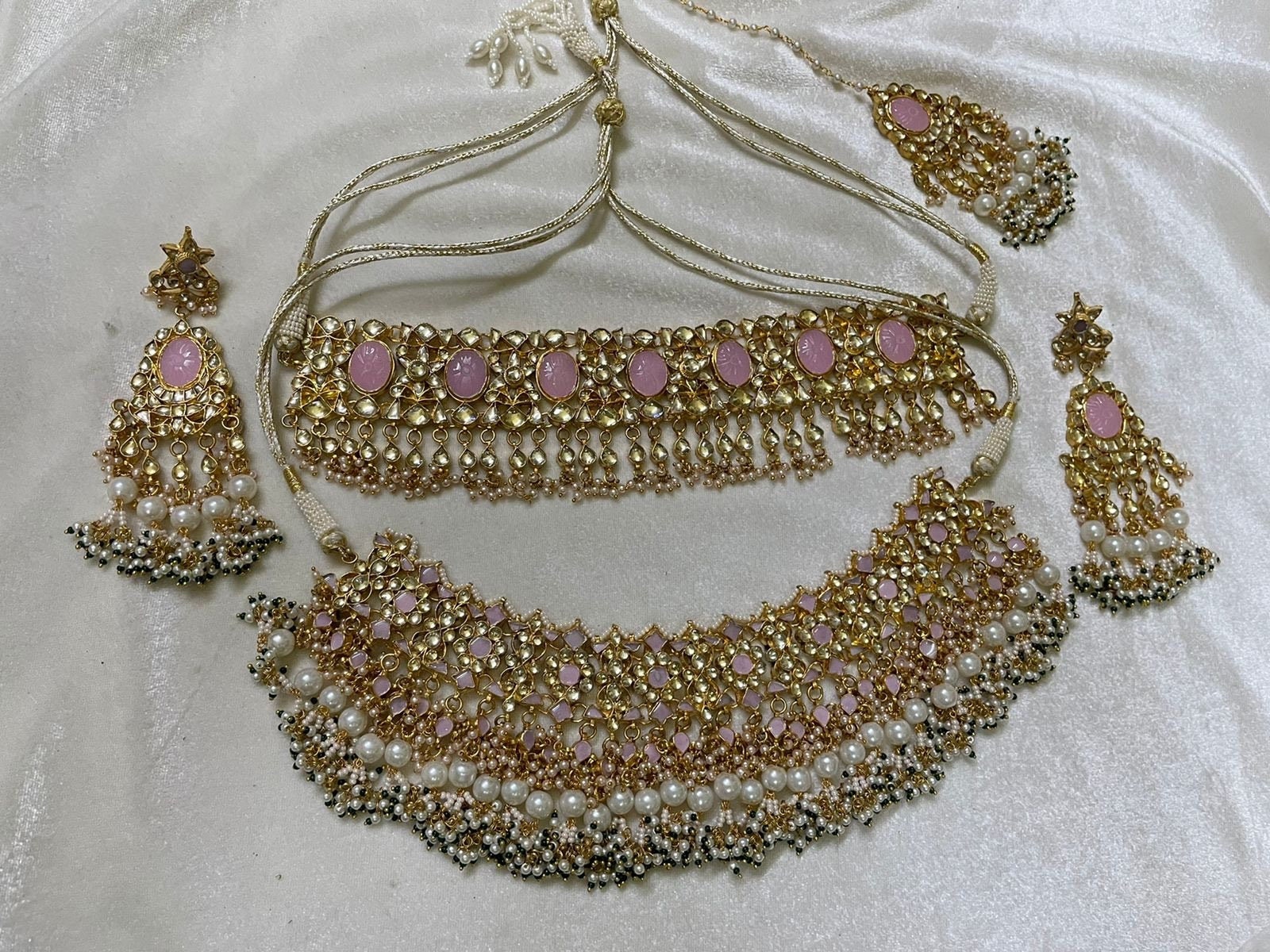 • It’s Handmade Gold Plated Indian Kundan Jewelry long bridal Necklace with choker and Earrings with matching mang tikka.