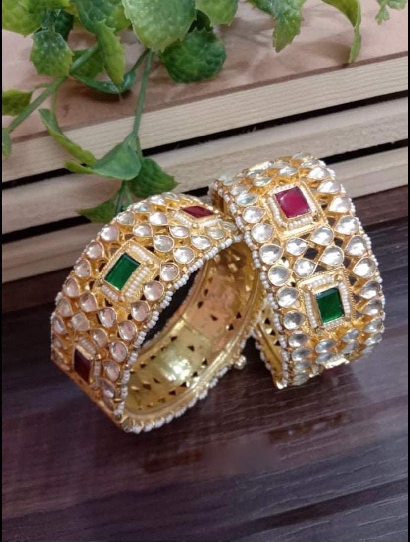 • This is 22k Gold Plated Kundan Bangles.Its perfect for Wedding Occasion as well as Gift and Bridal wear to match with Wedding Outfits.