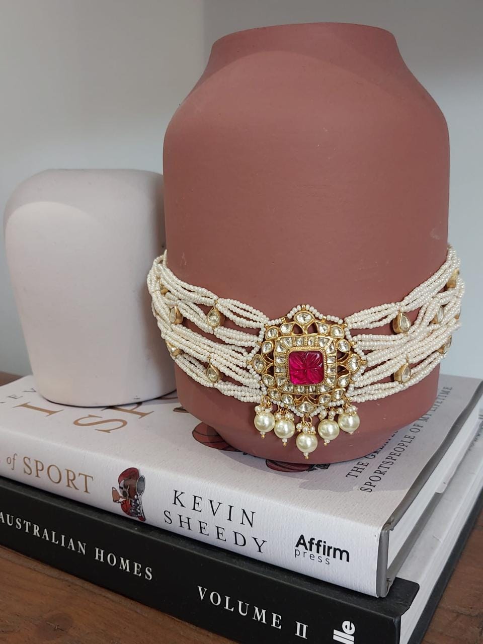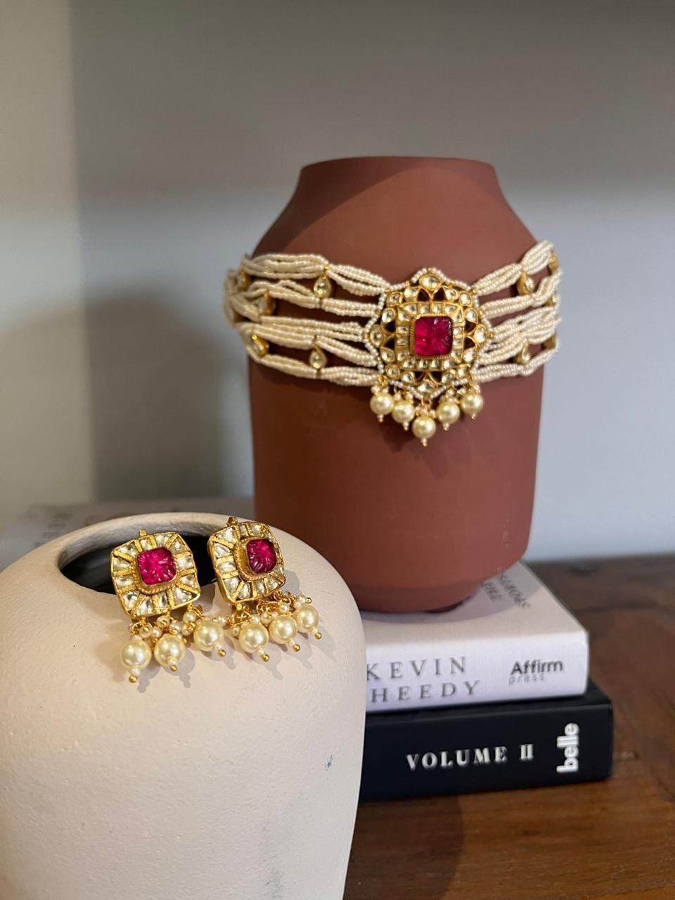 Beautiful Indian Traditional Handmade Kundan Choker Necklace with Pearl Hanging Earrings.