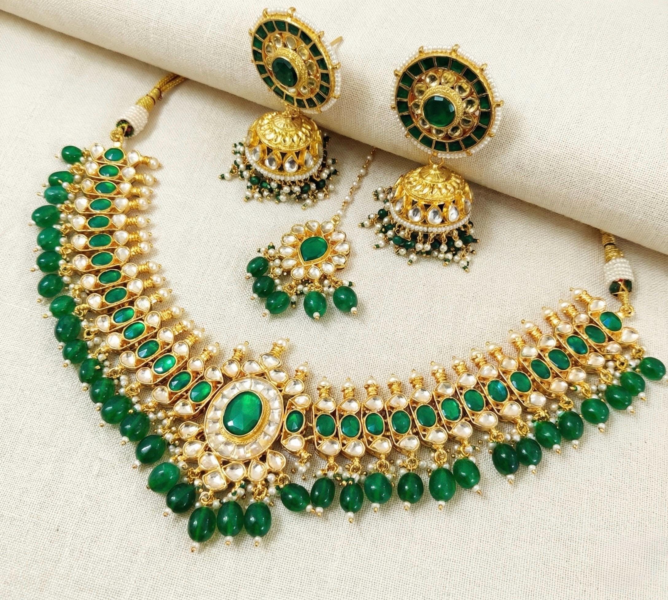 Beautiful Indian Traditional Handmade Kundan Choker Necklace with Jhumkhi Hanging Earrings and matching Maang Tikka.