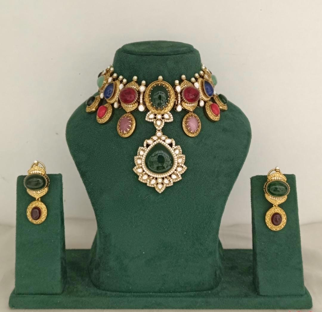 Add a touch of timeless elegance to your jewelry collection with this stunning gold-finished multicolor choker necklace set. Handcrafted with intricate detailing, this vibrant choker features dazzling stones in a rainbow of hues, beautifully contrasted against a rich gold-tone finish. The matching earrings complete the set, making it perfect for weddings, festivals, parties, or statement everyday wear.
