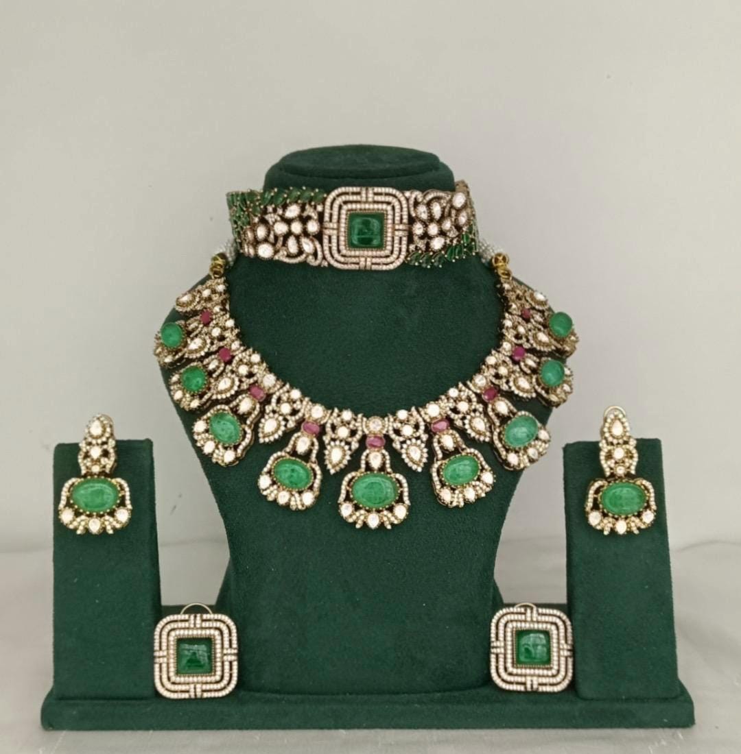 Handmade Kundan choker necklace with Green and Polki Clear stones