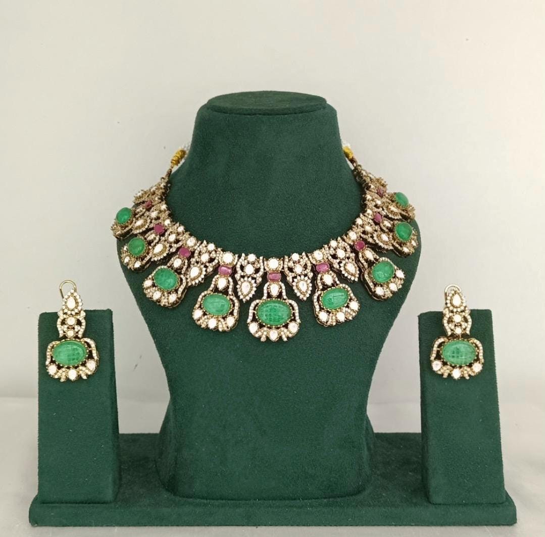 🌿 **Handcrafted Kundan Jewelry Set – aemerald green and Ruby Red Choker Necklace & Earrings.