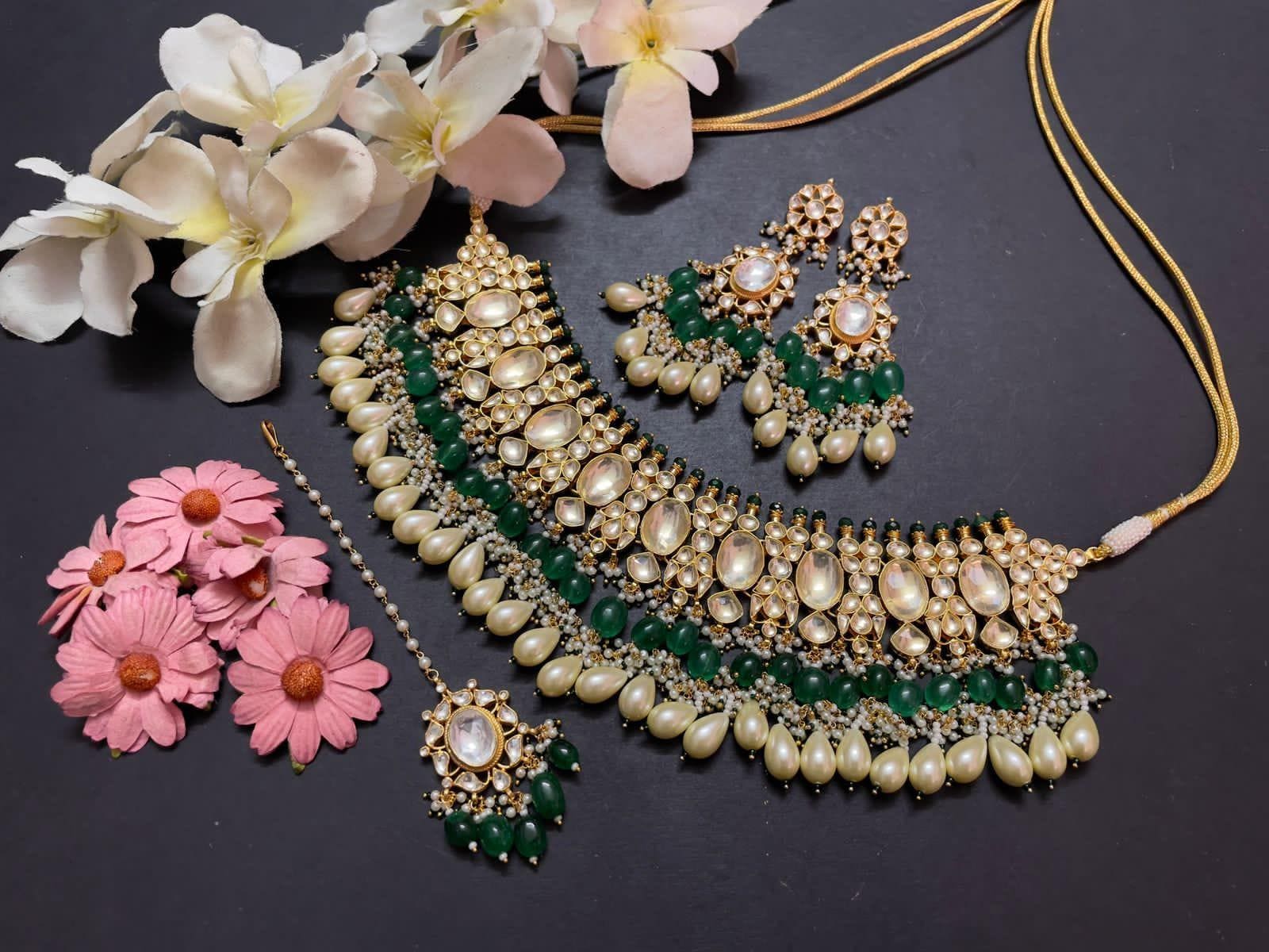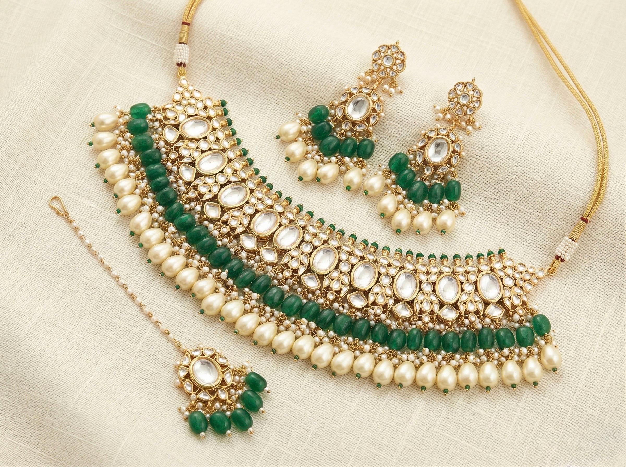 White Kundan & Green Stone Choker Necklace Set – Handmade Indian Wedding Jewelry with Earrings & Maang Tikka | Gold Plated Bridal Set