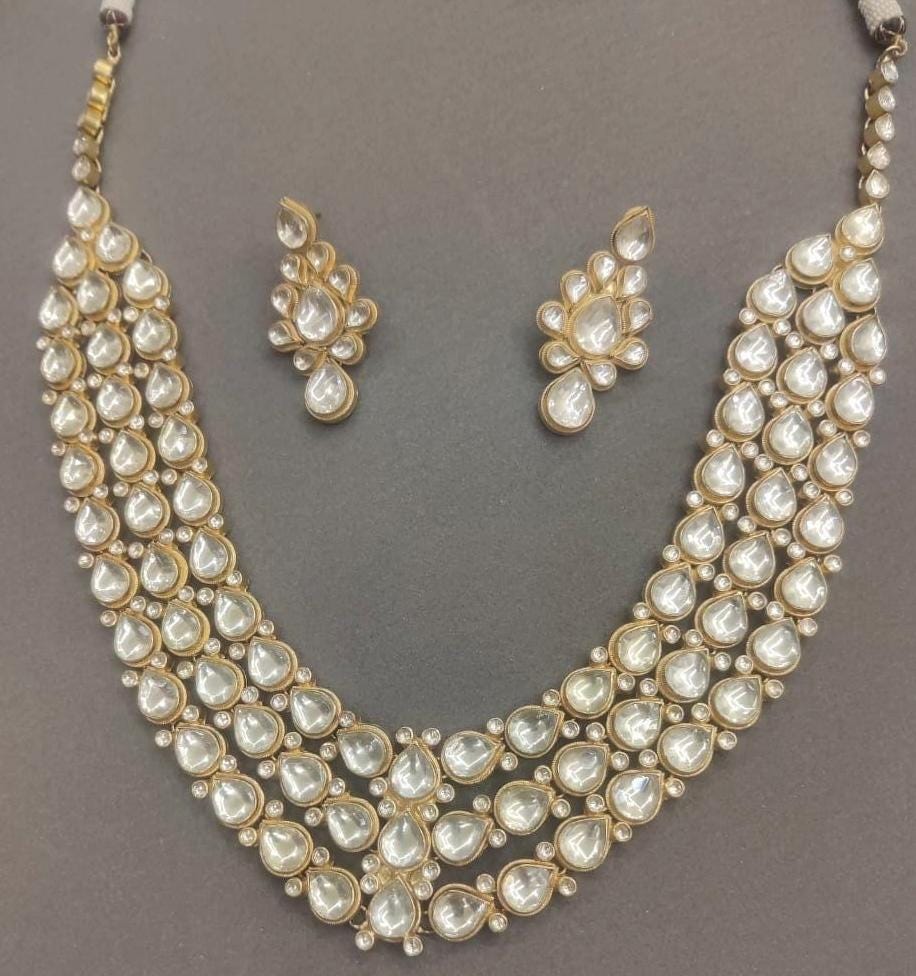 Elevate your bridal look with this stunning handcrafted multi-layered Kundan necklace set, designed to reflect the richness of traditional Indian jewelry with a modern, customizable twist. Measuring 18 inches in length, this statement piece features authentic-looking Kundan stones meticulously set in a layered design, finished with luxurious 22K gold plating for a true-to-real, regal glow.