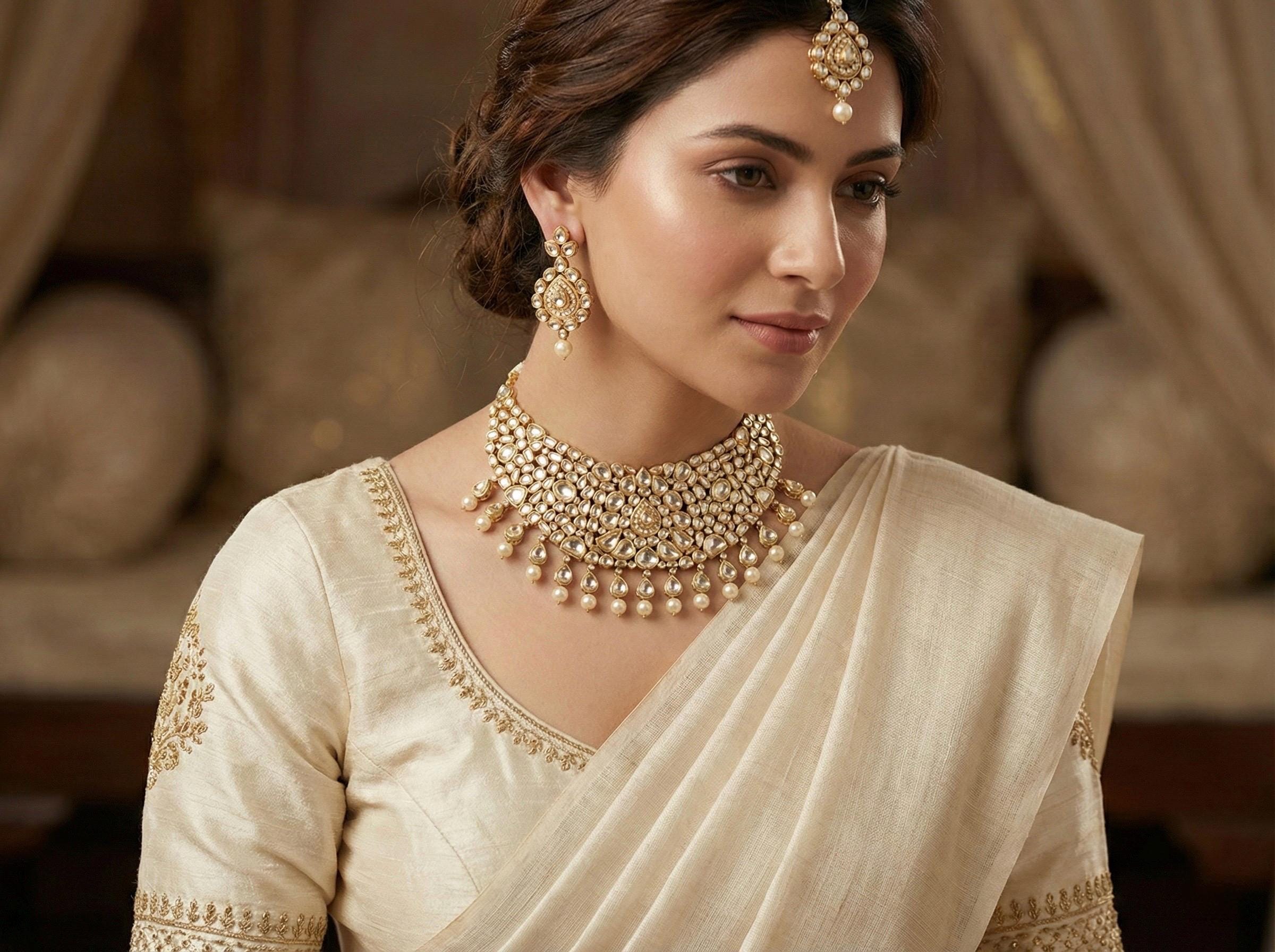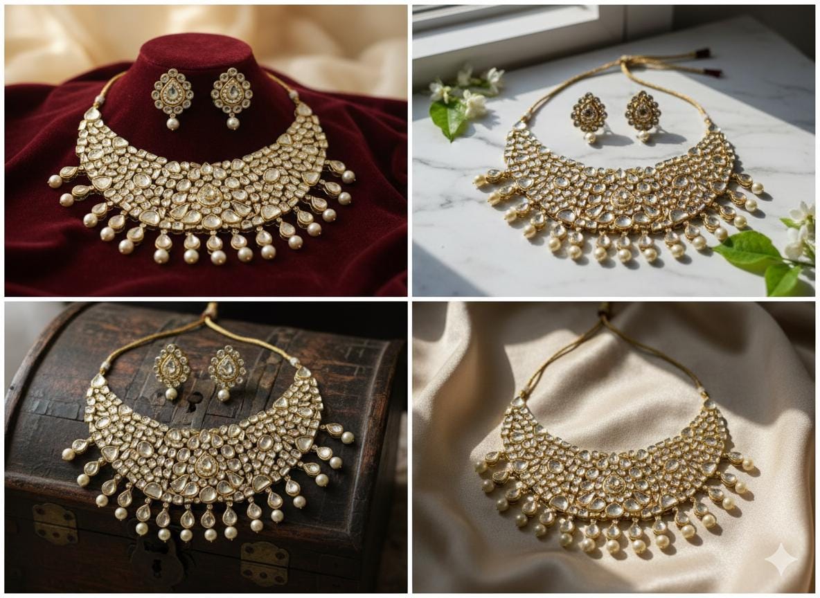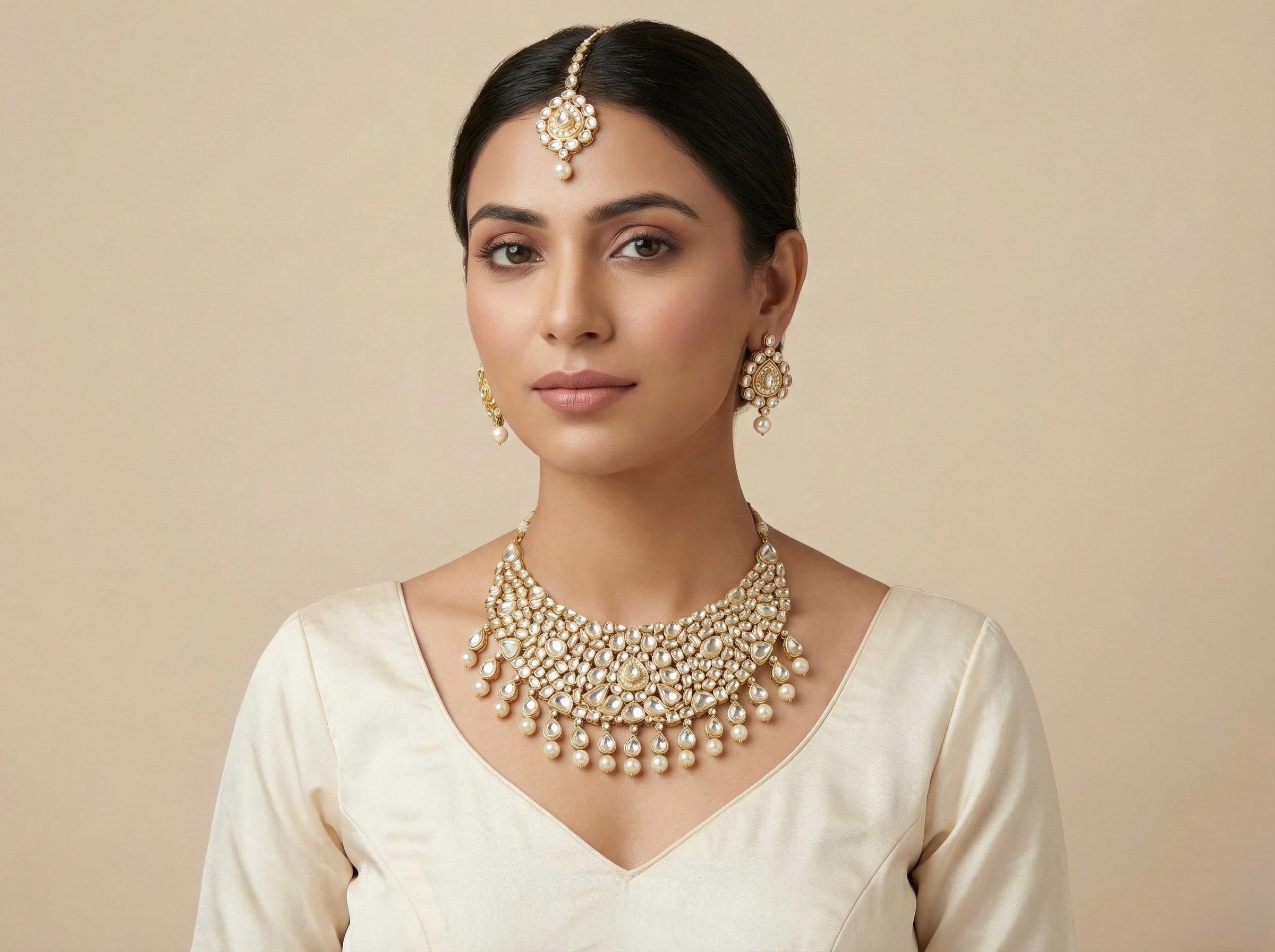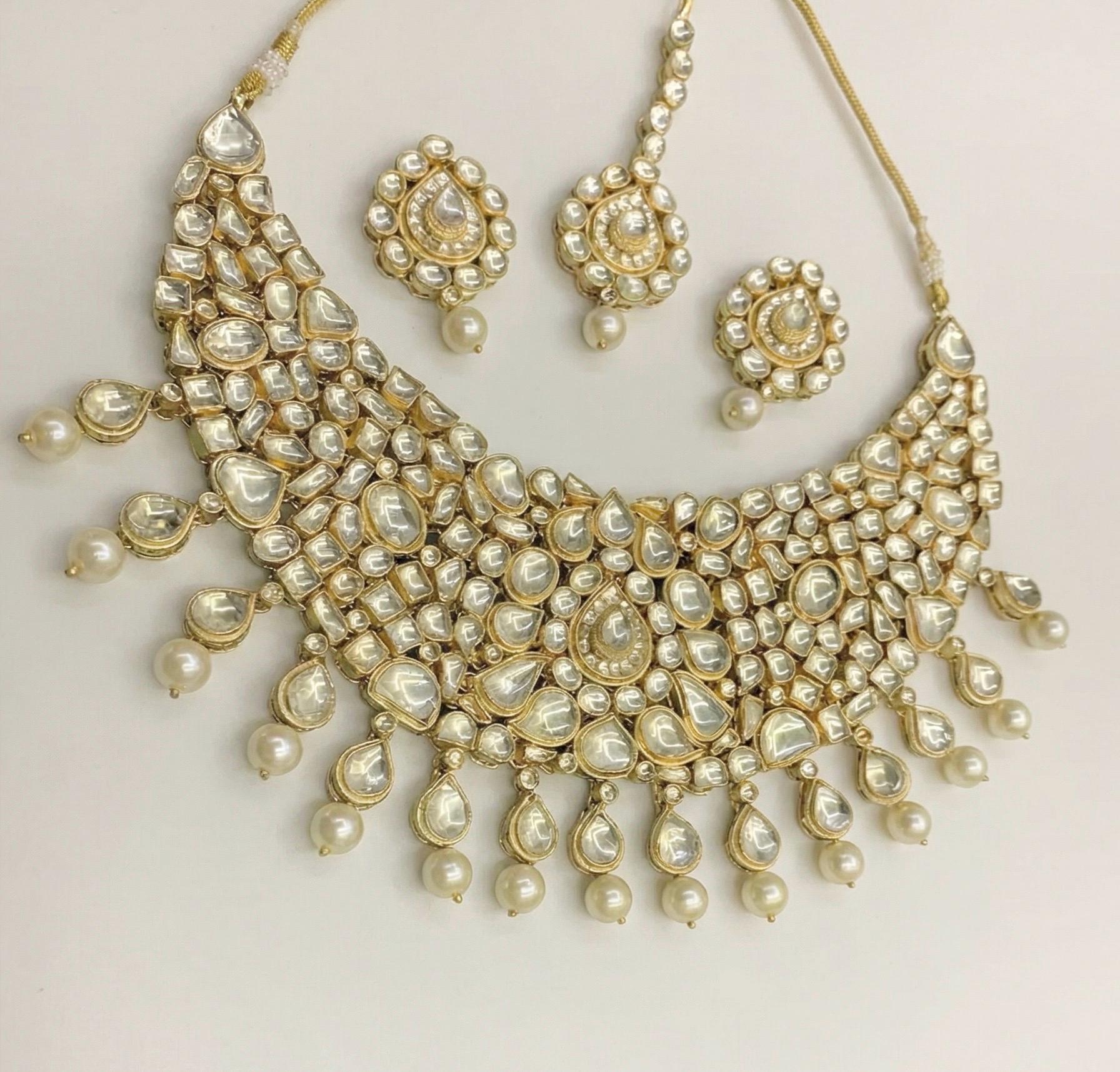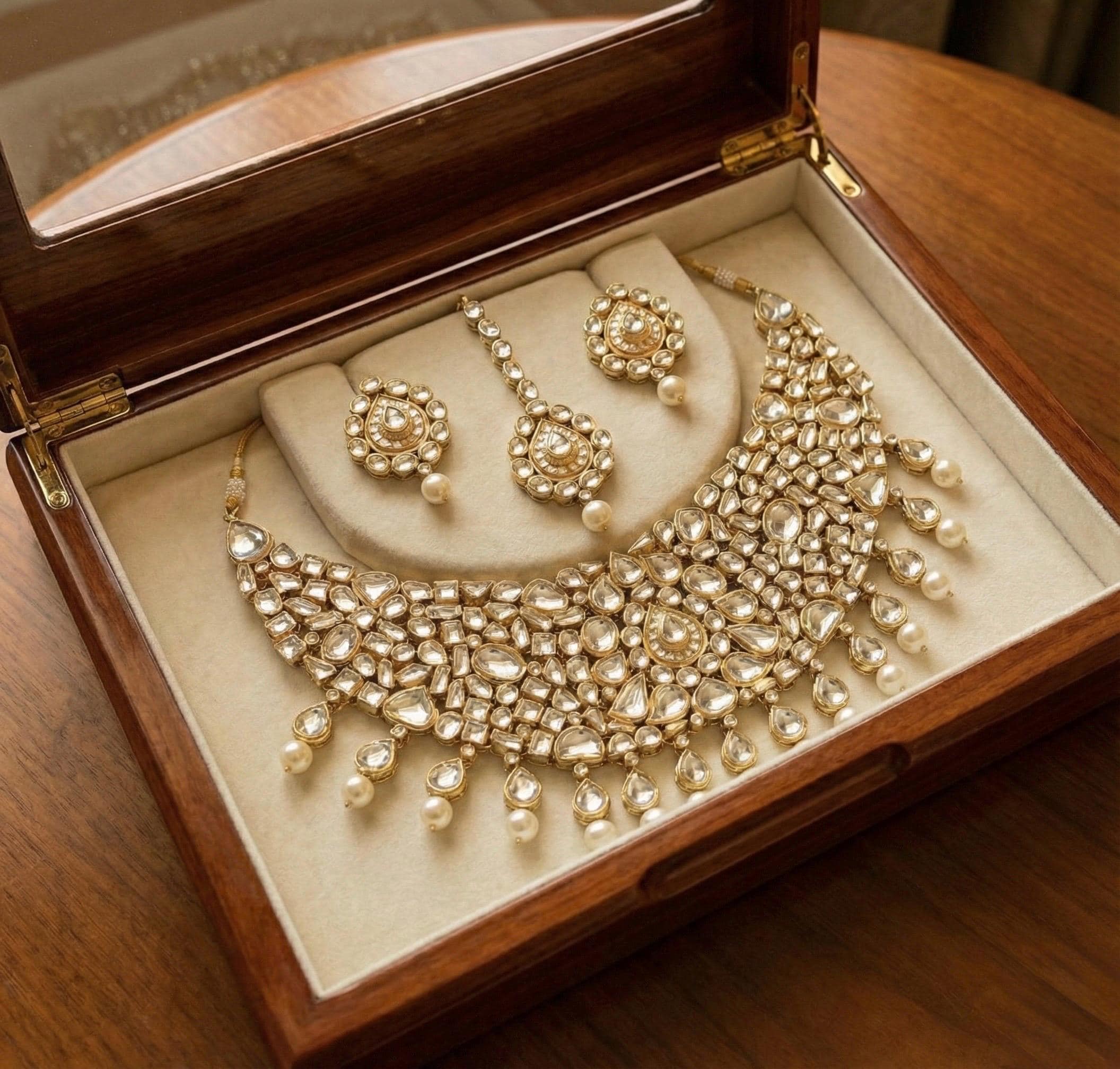Make a grand statement on your special day with this exquisitely handcrafted traditional Kundan necklace, designed to capture the richness of heritage and the elegance of real bridal jewellery. Featuring large uncut Kundan stones meticulously set in a regal design, this necklace mirrors the intricate craftsmanship of royal Indian weddings. The bold, layered structure beautifully complements bridal attire, while the real-look gold polish and pearled detailing give it the timeless appeal of heirloom pieces.