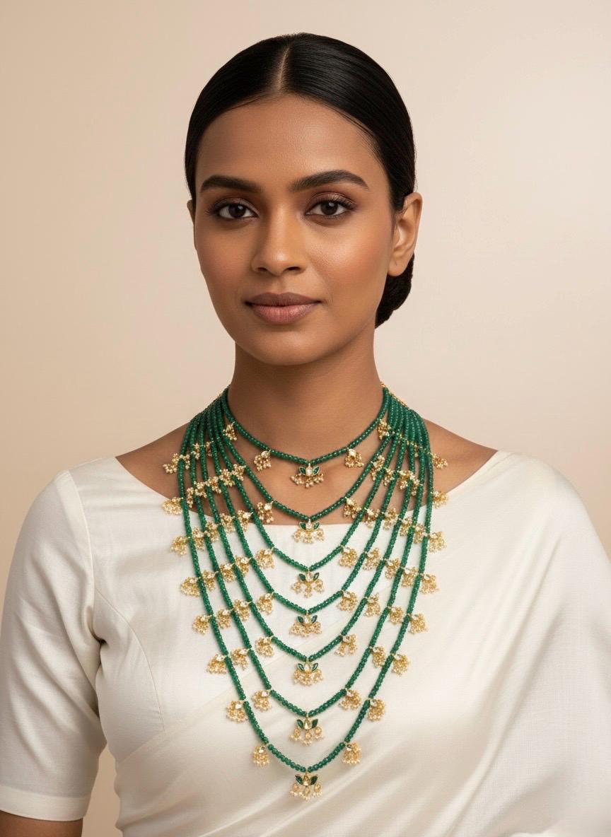 Add a touch of timeless elegance to your special occasions with this exquisite Multi-Layered Satlada Kundan Mala Necklace Set. Designed with intricate craftsmanship, this stunning piece features multiple layers of traditional Kundan stones paired beautifully with delicate green beads, creating a luxurious and regal look.