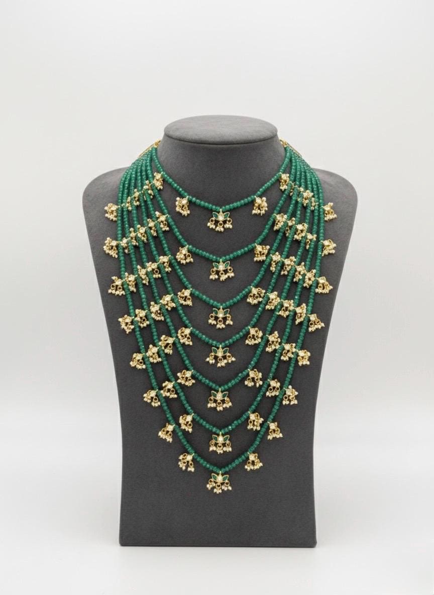 Multi-layered 22k Gold Plated design with Kundan stones and green beads NECKLACE ONLY.