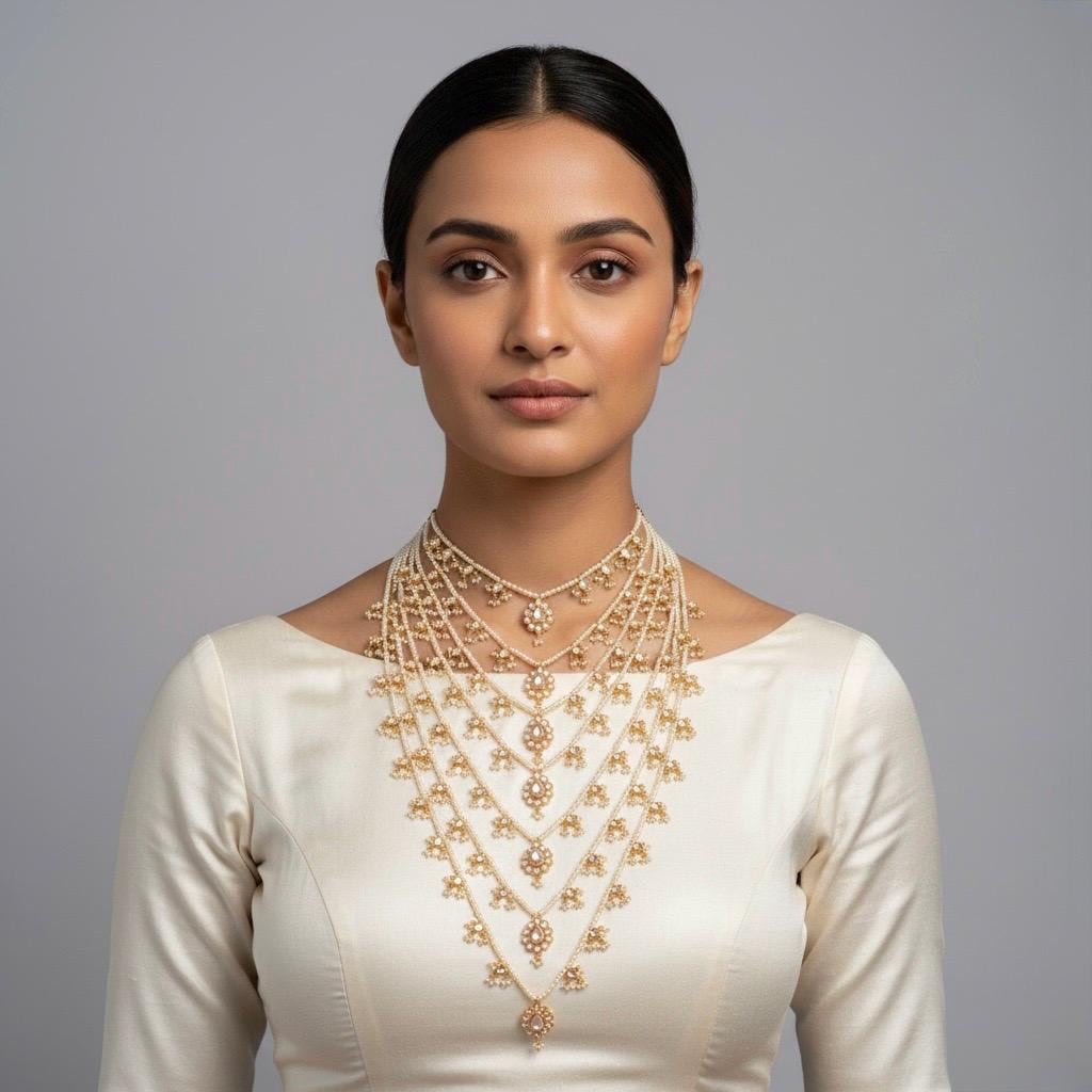 Add a touch of timeless elegance to your special occasions with this exquisite Multi-Layered Kundan Necklace Set. Designed with intricate craftsmanship, this stunning piece features multiple layers of traditional Kundan stones paired beautifully with delicate pearls, creating a luxurious and regal look.
