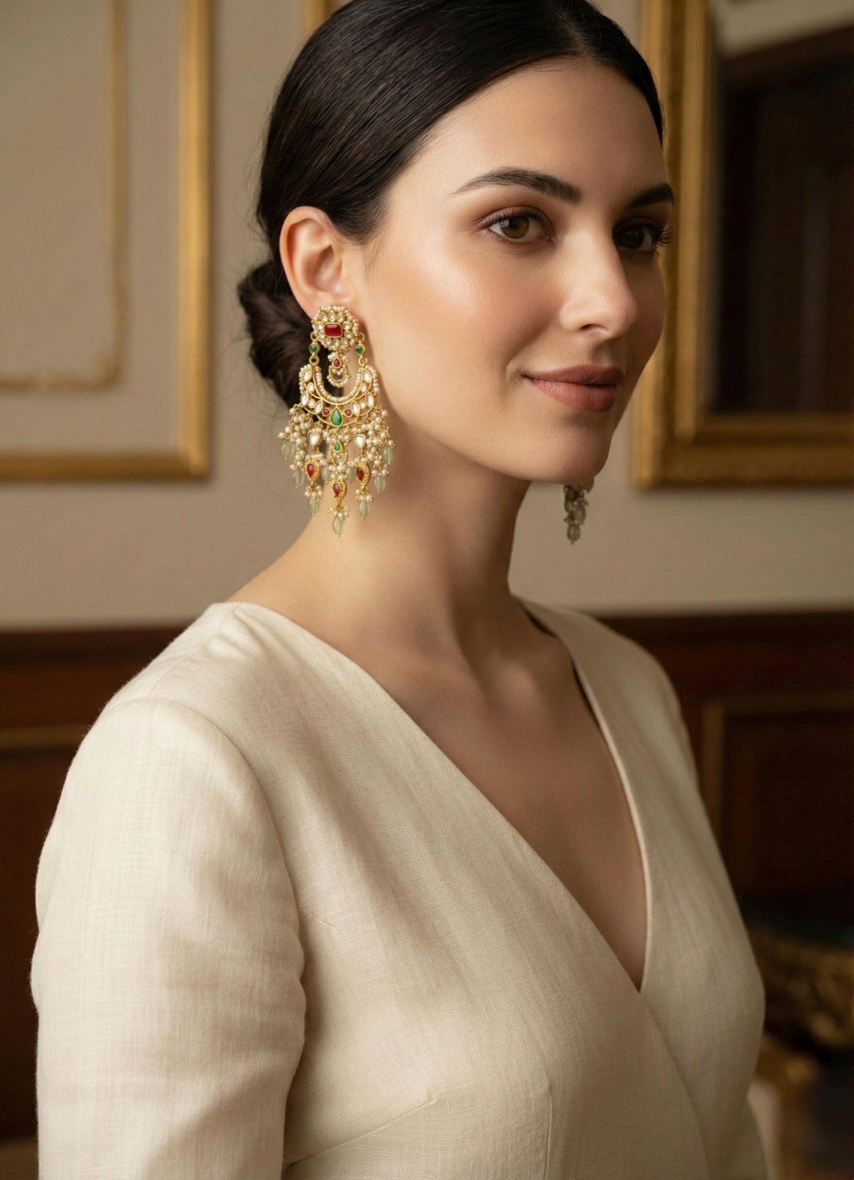 Measuring approximately 3 inches in length, these chandbalis offer a graceful drop that frames the face perfectly while adding royal charm to your wedding or festive look. Each pair is meticulously handcrafted, showcasing intricate detailing and classic craftsmanship inspired by heritage Indian jewellery.