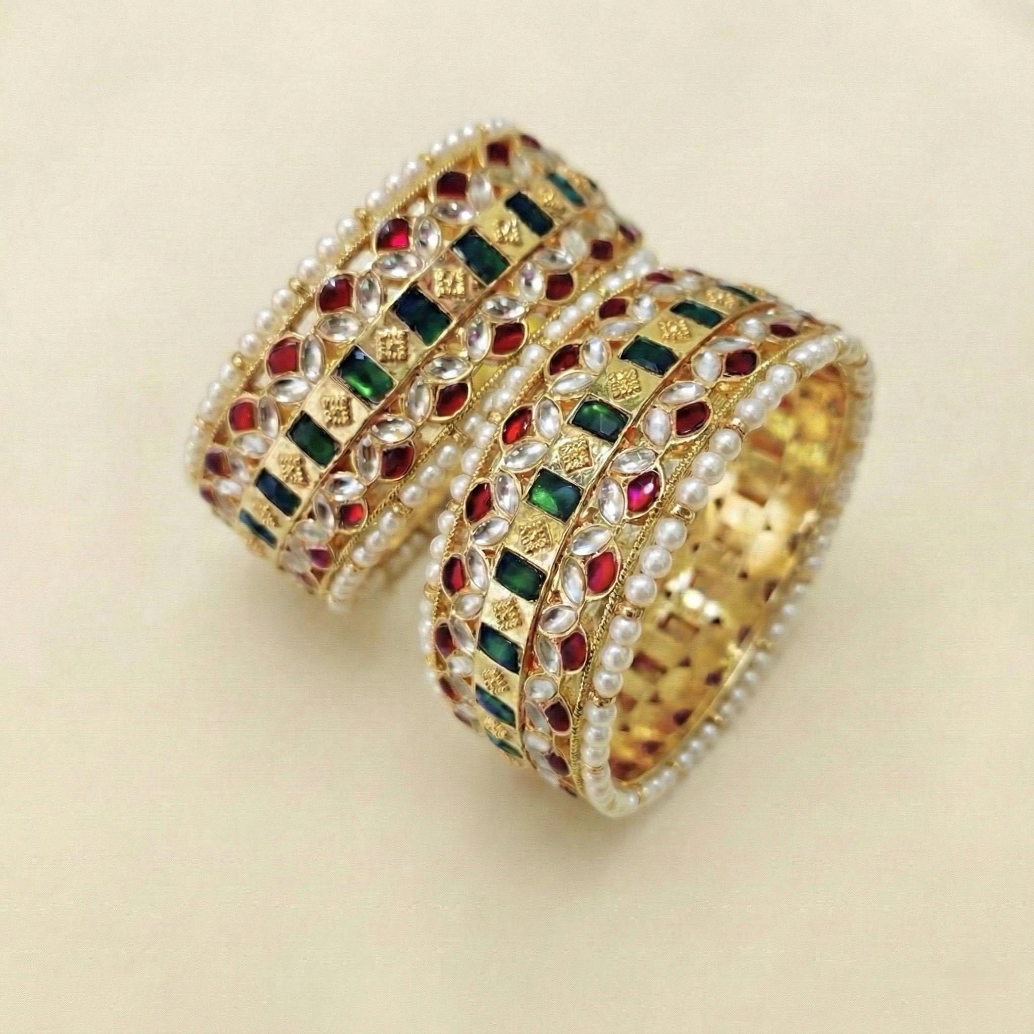 Celebrate your special day with these exquisite 22K Gold Plated Kundan Bangles, handcrafted for brides who desire regal sophistication. Featuring radiant red, green, and clear Kundan stones, each piece is delicately detailed with luminous pearl accents to create a rich, heirloom-inspired look.