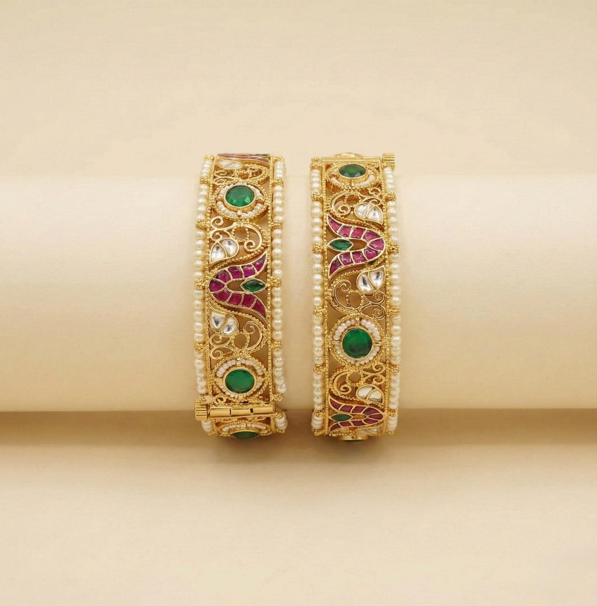 Celebrate your special day with these exquisite 22K Gold Plated Kundan Bangles, handcrafted for brides who desire regal sophistication. Featuring radiant red, green, and clear Kundan stones, each piece is delicately detailed with luminous pearl accents to create a rich, heirloom-inspired look.