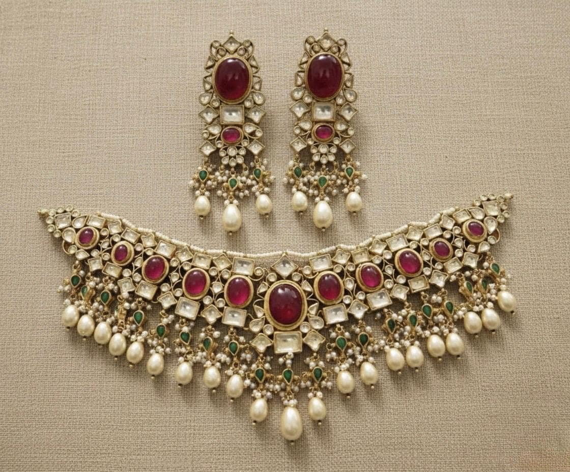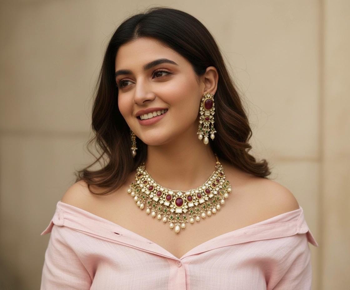 The choker necklace sits gracefully along the neckline, creating a regal and sophisticated look, while the matching pieces complete the ensemble with perfect balance. Ideal for weddings, bridal ceremonies, receptions, and festive celebrations, this jewelry set pairs beautifully with sarees, lehengas, and classic Indian attire.
