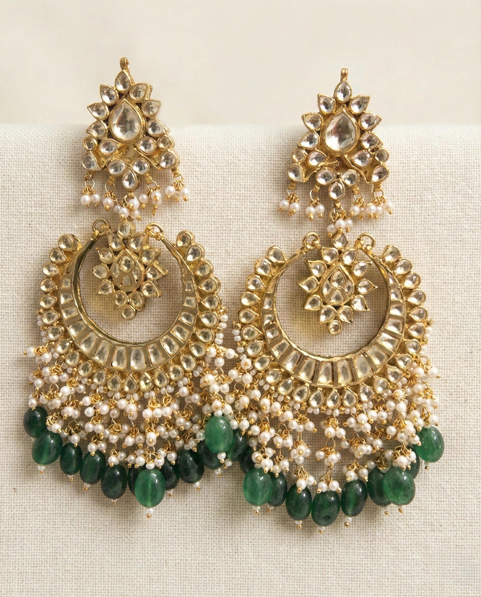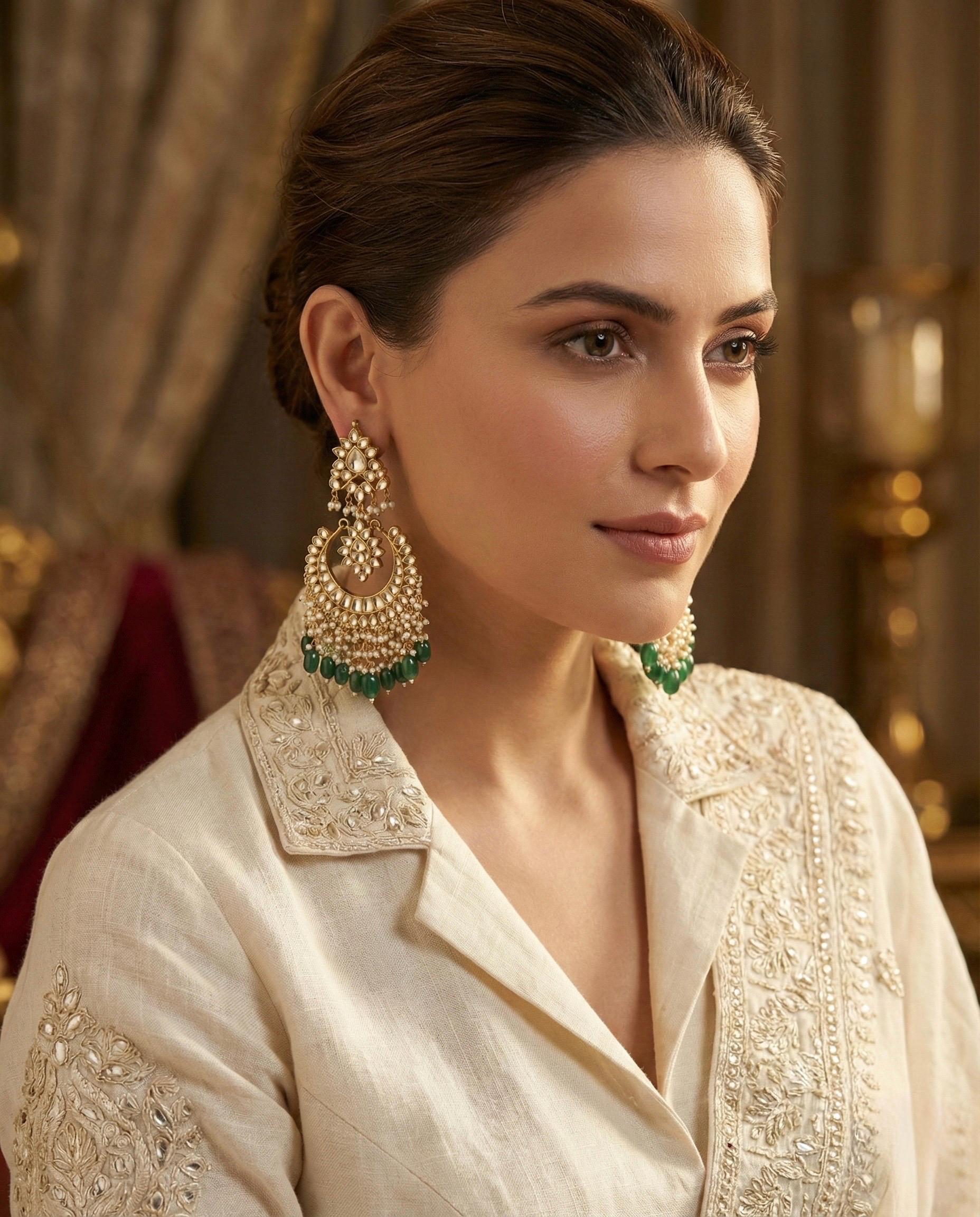 Handmade Kundan Chandbali Earrings in emerald green, beautifully crafted with 22K gold plating, showcasing timeless Indian craftsmanship and elegant ethnic charm for weddings and festive occasions. Experience the allure of ancient Indian craftsmanship with our Designer Handmade Ethnic Gold Kundan Earrings Set!