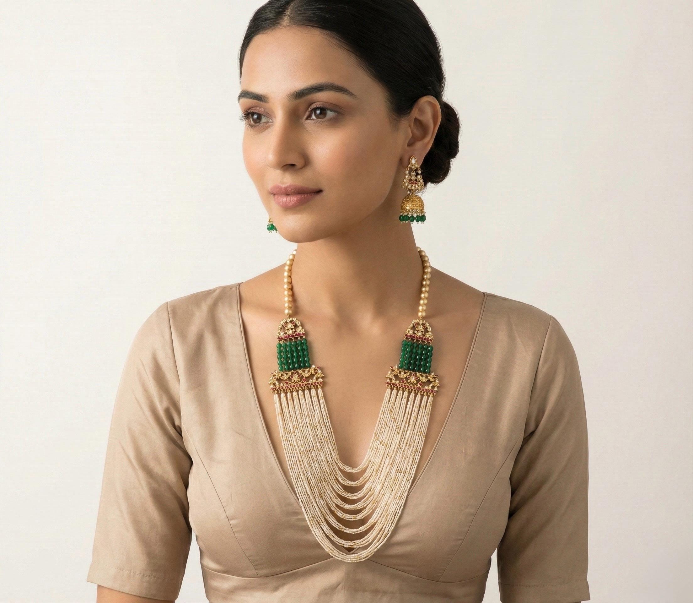 • It’s beautiful Ethnic Indian Wedding Long Ranihaar Necklace with Green Enameled and Statement Earrings.