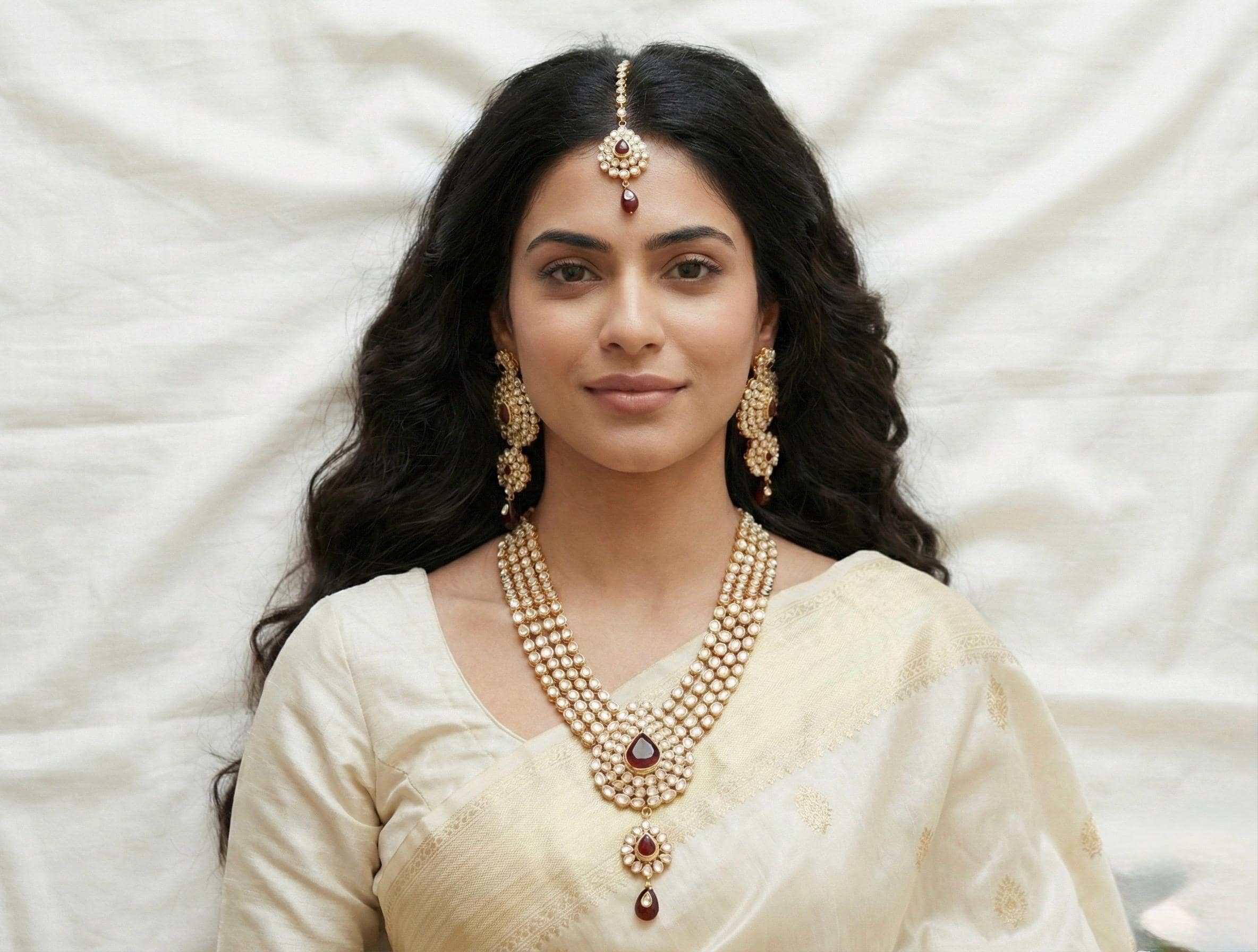 The layered necklace drapes gracefully over bridal attire, creating a majestic, full-coverage look that pairs flawlessly with lehengas, sarees, and anarkalis.