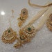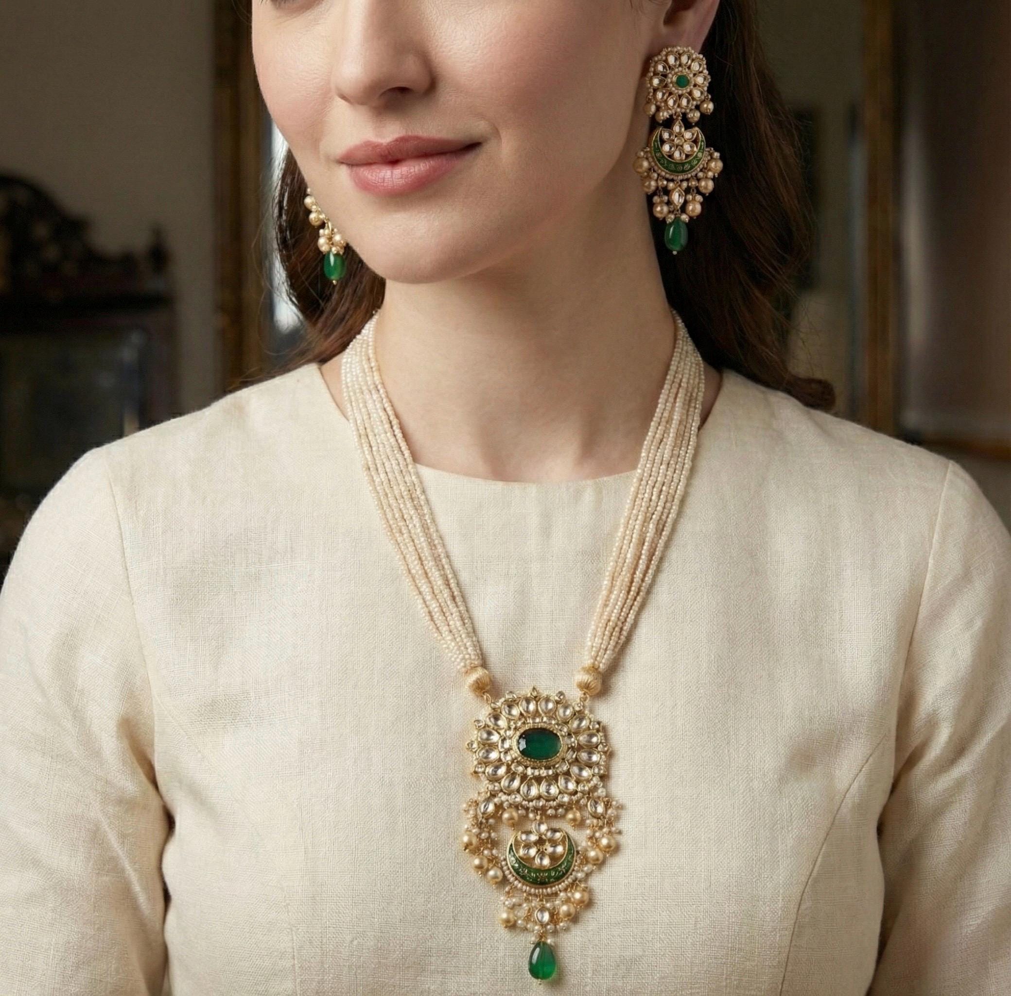 A stunning handmade gold-plated Kundan jewelry set, featuring a delicately beaded pearl necklace and intricate Kundan detailing, perfect for Indian weddings and festive occasions.
