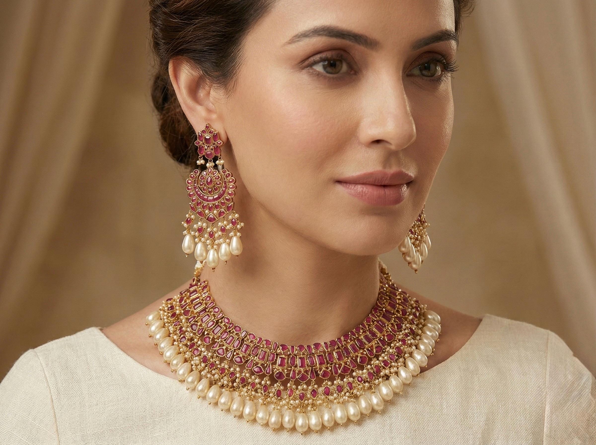 • 22 K Gold Plated made from Silver and Copper Mix material and handcut Ruby Pink Kundan stones.