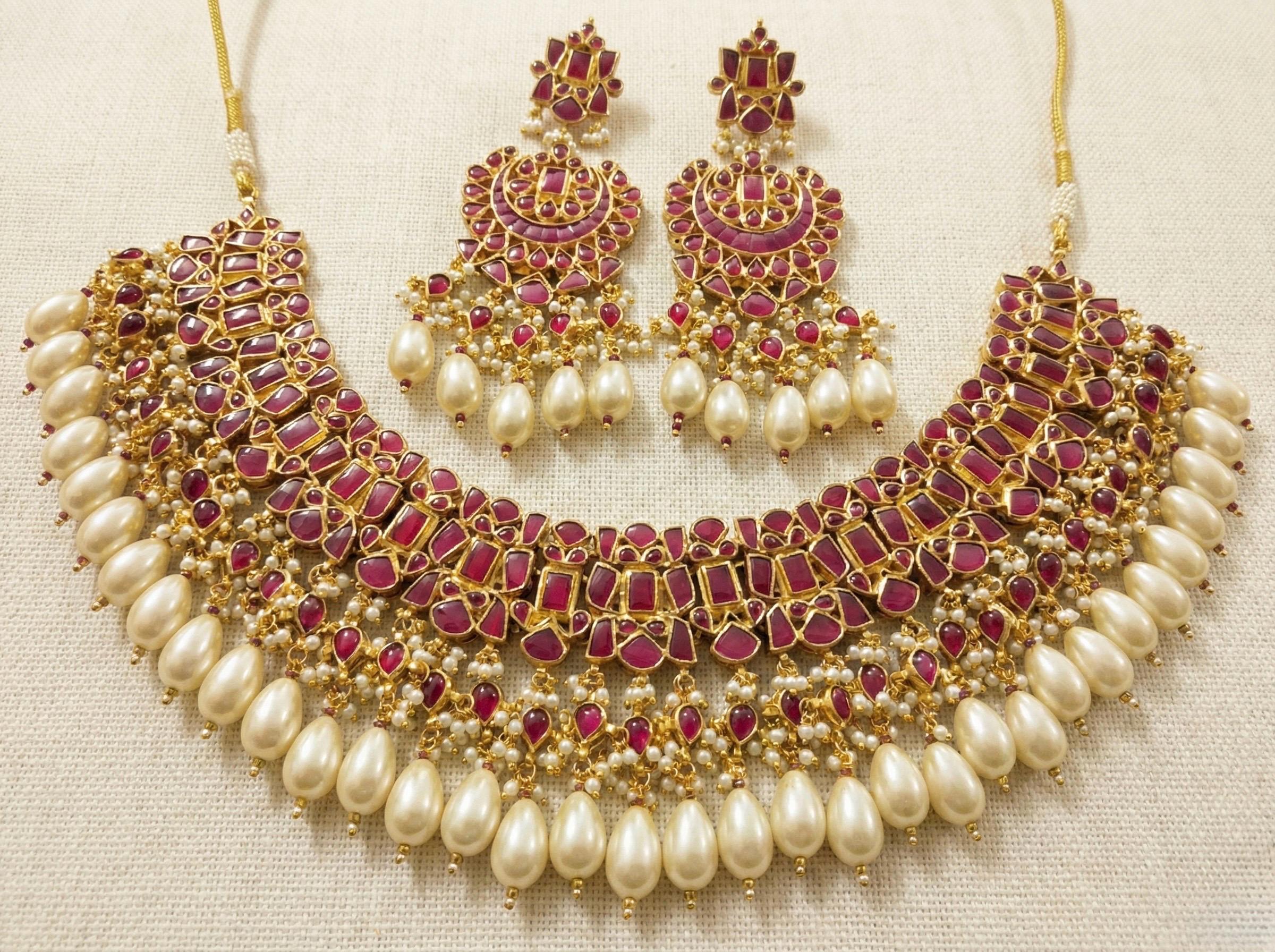 •South Indian wedding Jewelry Indian Traditional Handmade Gold Plated Kundan Jewelry Necklace and Earrings Set.