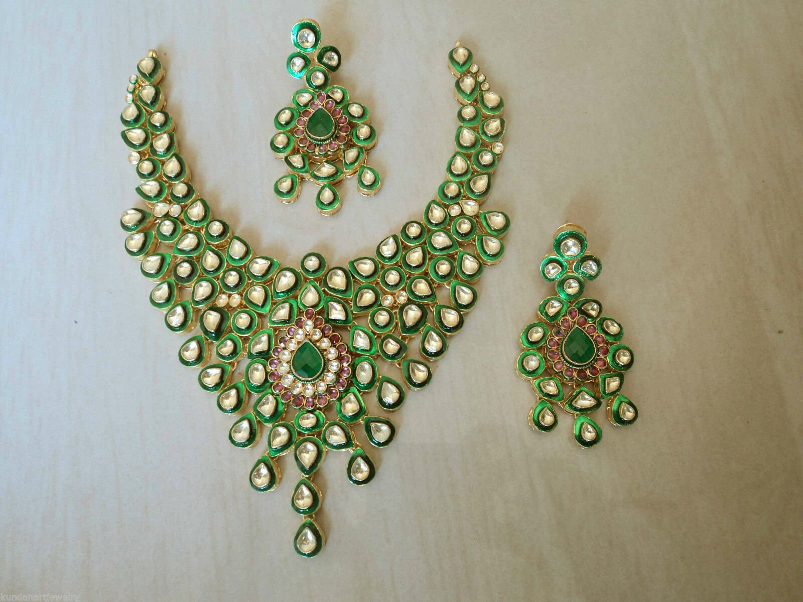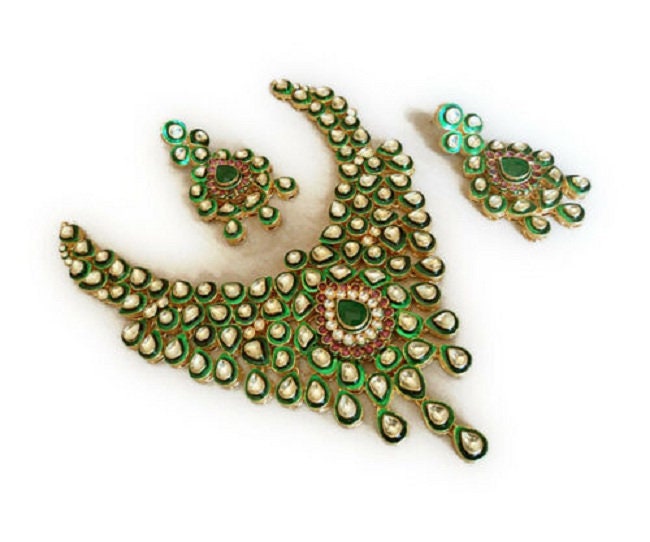 This beautiful Kundan jewelry set has been cherished for decades and continues to remain a favorite in Indian and Asian ethnic fashion. Add this royal green enamel Kundan choker set to your collection and make a graceful statement on your special day.