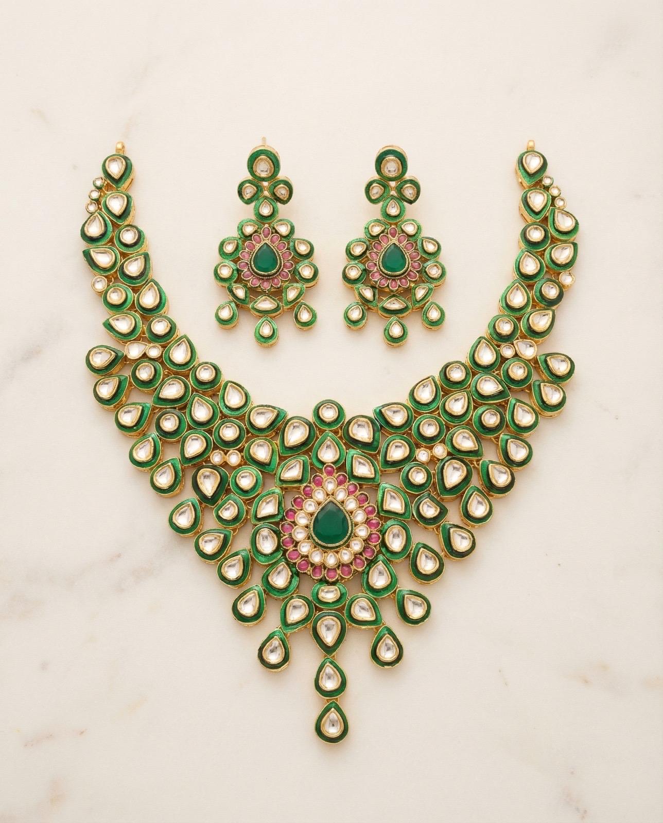 Handcrafted Green Enamel Kundan Jewelry Choker Necklace Set with Earrings.