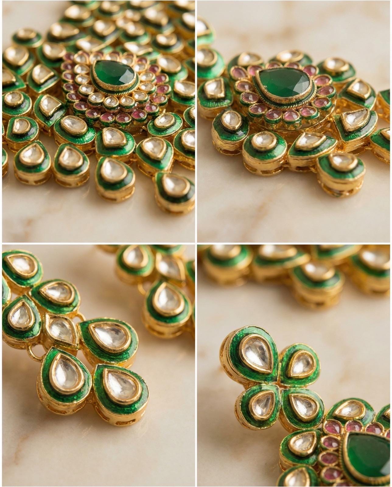 All our Kundan jewelry is 100% handmade by skilled artisans using age-old techniques passed down through generations. The intricate stone setting and enamel work showcase authentic Indian heritage and craftsmanship.