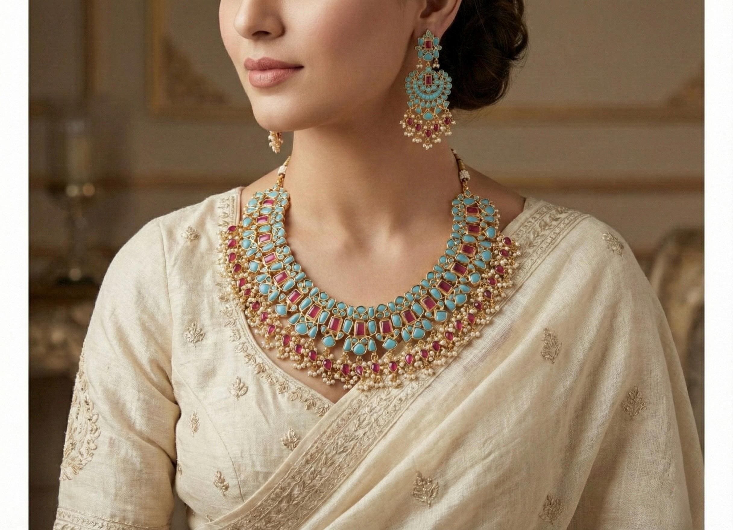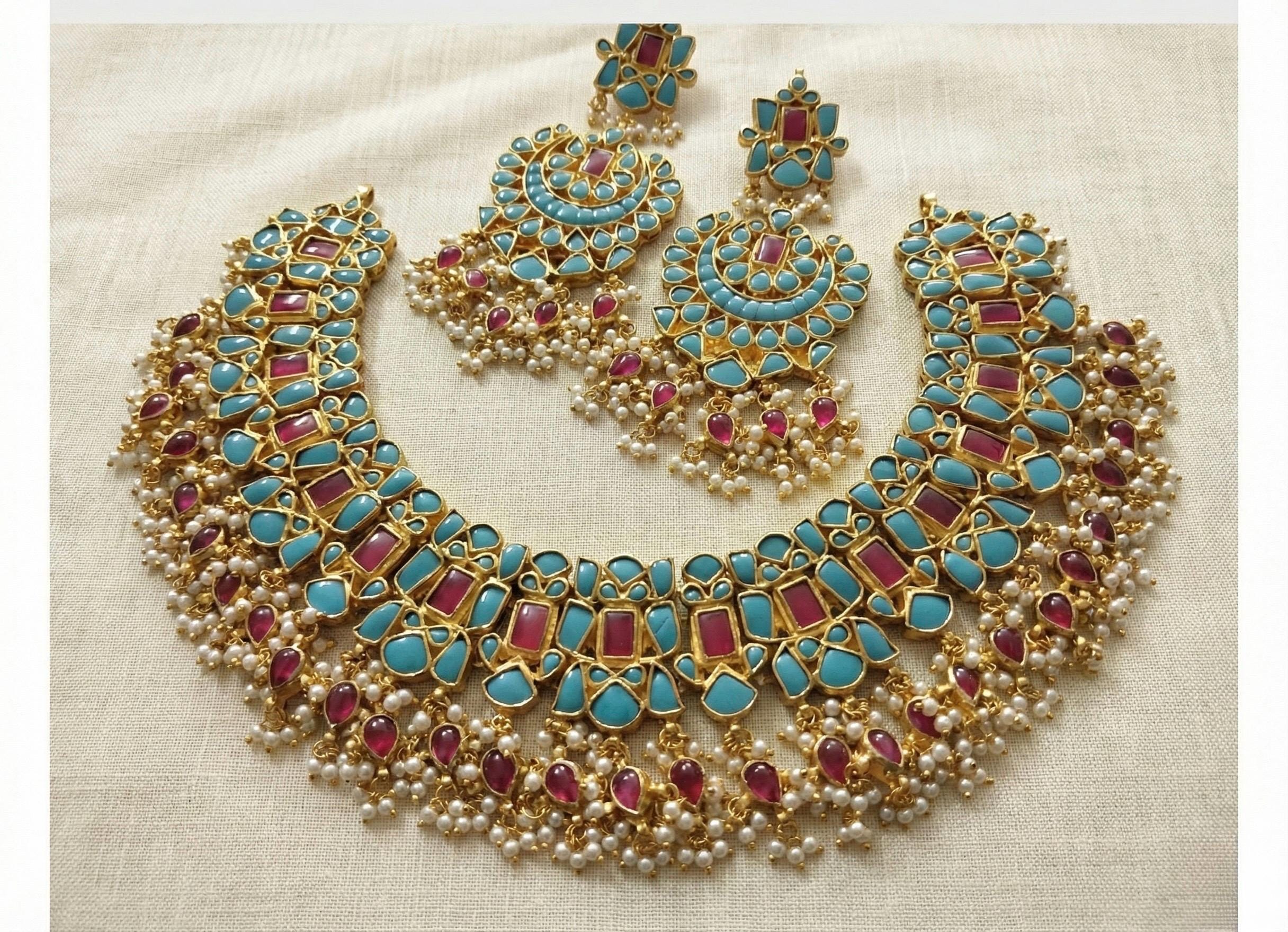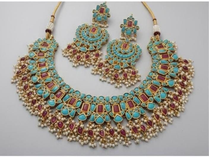Handmade Kundan Choker Necklace & Chandbali Earrings | Turquoise, Ruby, Gold Plated Jewelry is a timeless Indian jewelry set featuring intricate handcrafted detailing, vibrant turquoise and ruby stones, and elegant gold plating, perfect for weddings and festive occasions.