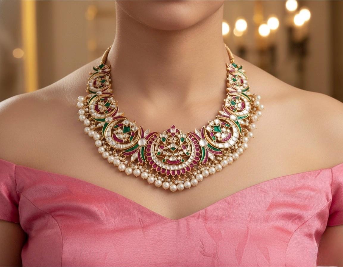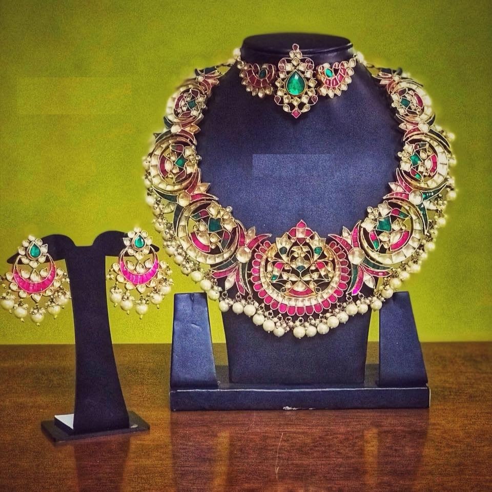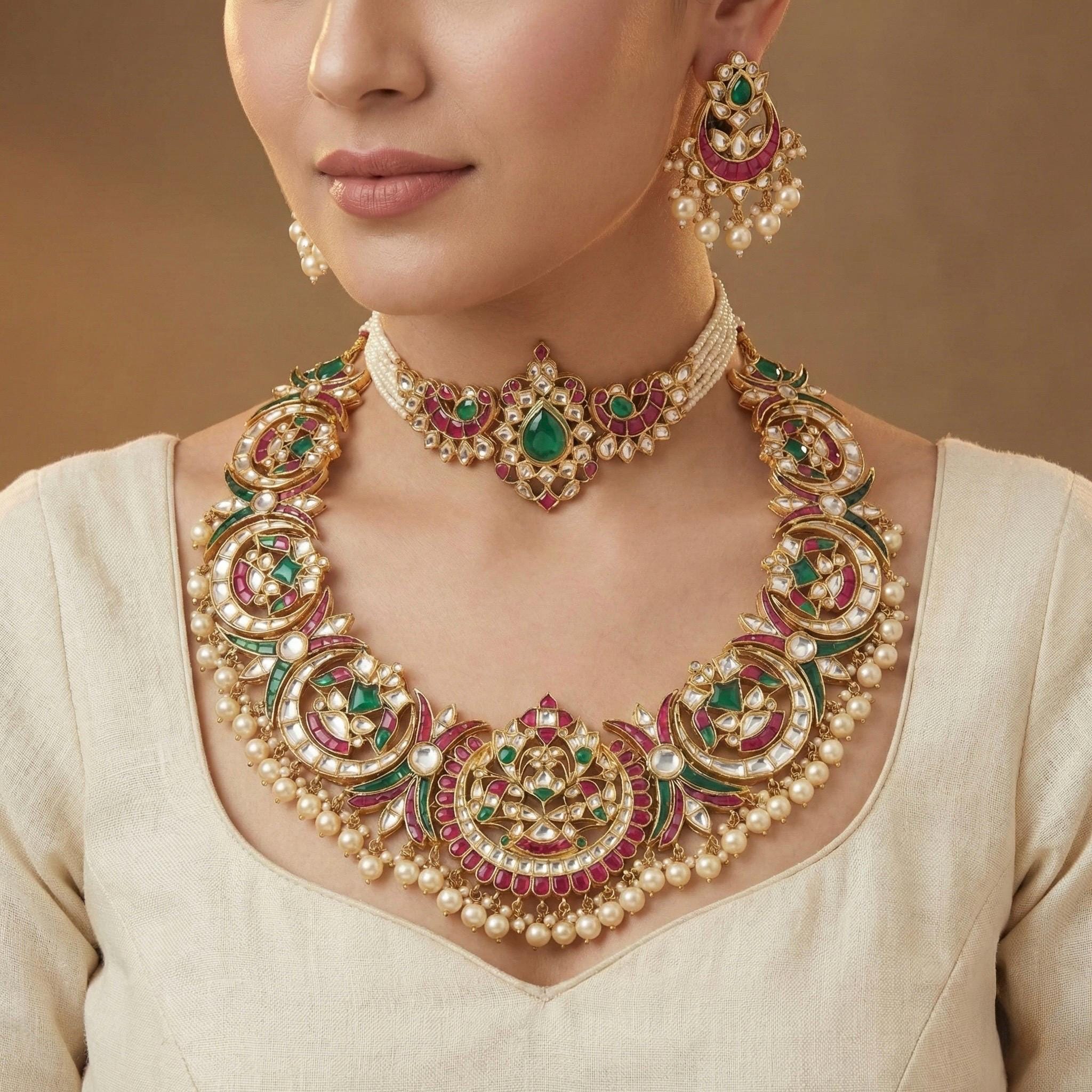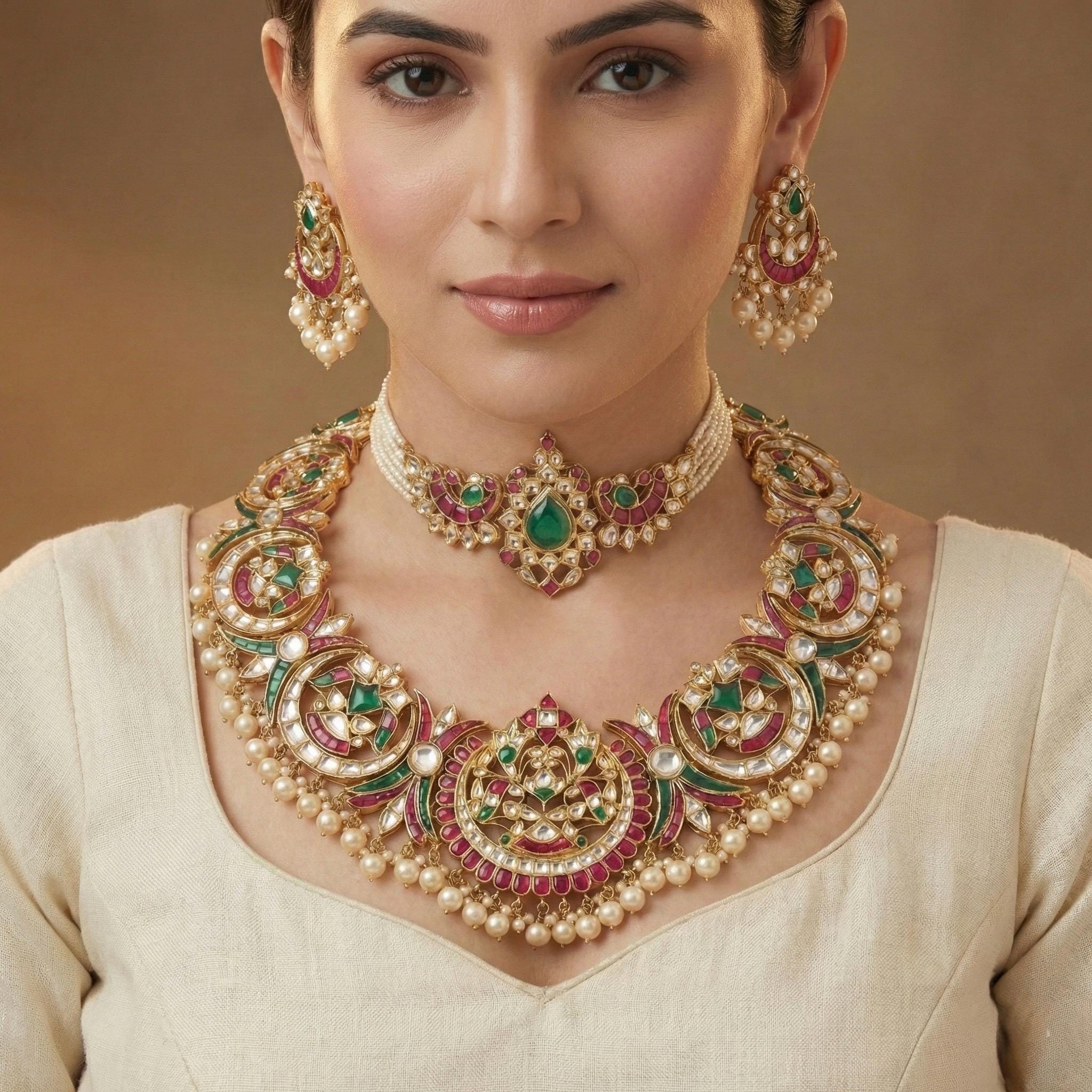 • 22 K Gold Plated 925 Silver One of a kind Bridal Necklace with set of Beautiful Collar Choker in Multiolor Kundan combination.