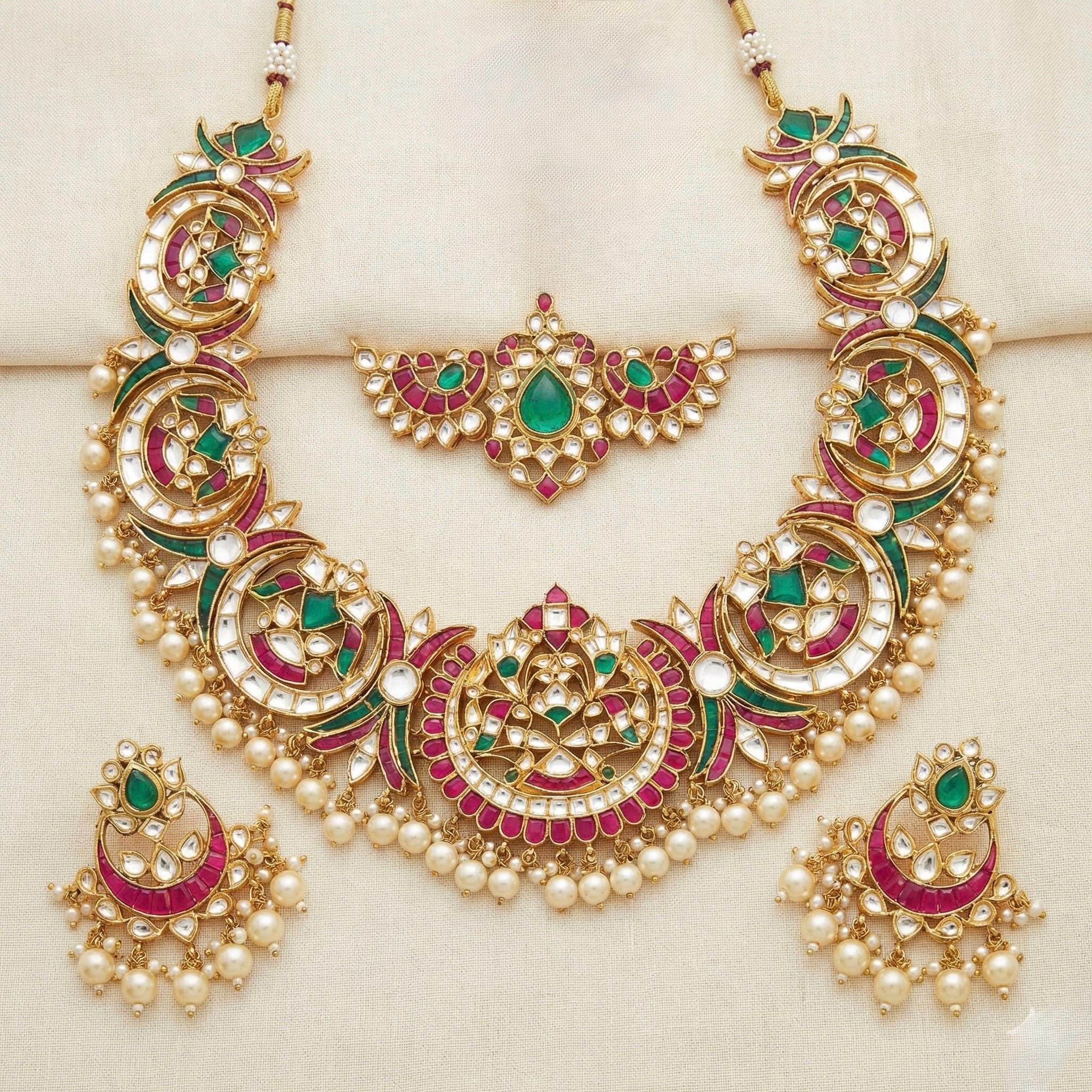 Handmade 22K Gold Plated Kundan Bridal Jewelry Set with matching choker necklace and chandabli earrings.Indian Bridal jewellery set for Indian aa well as south asian brides.