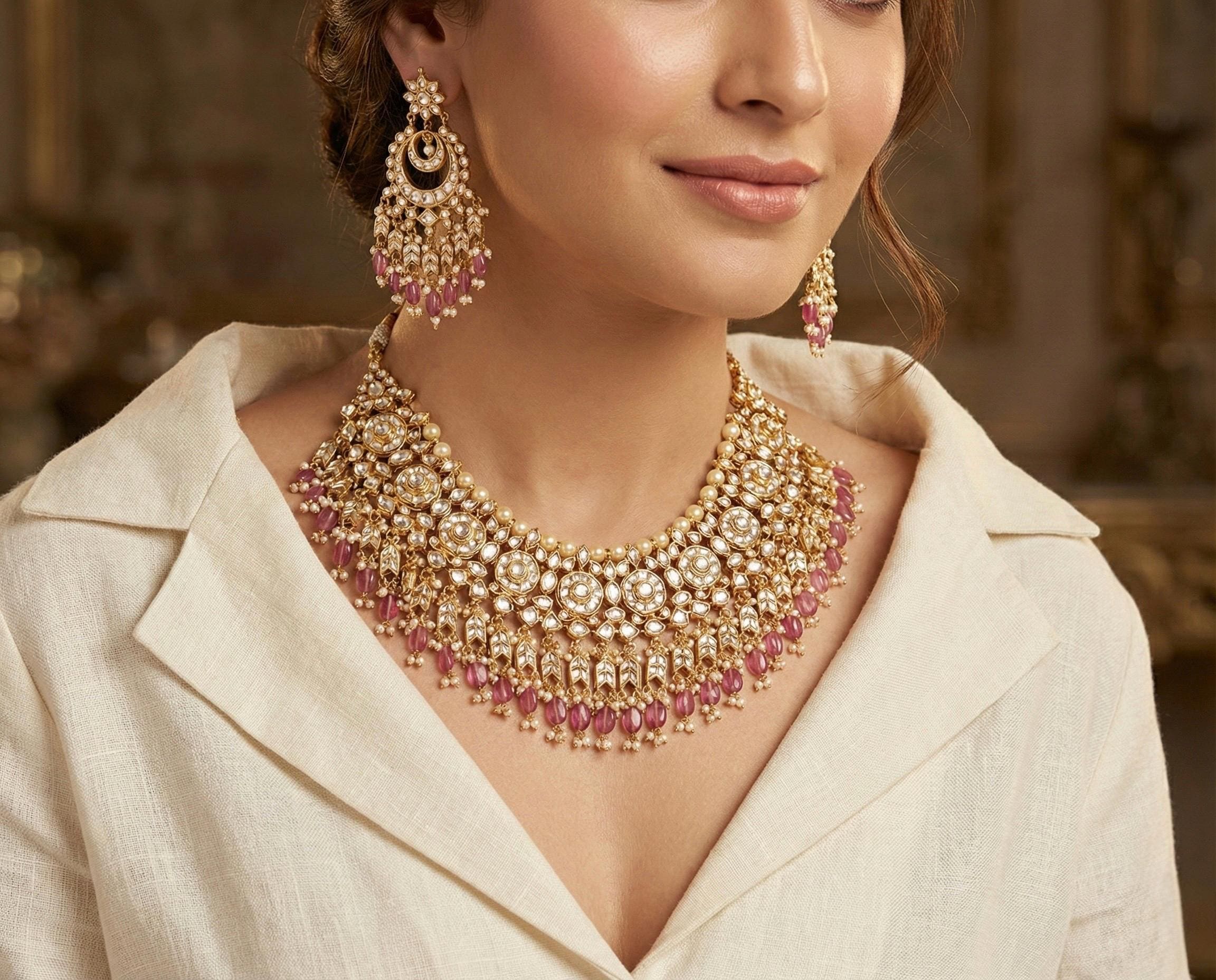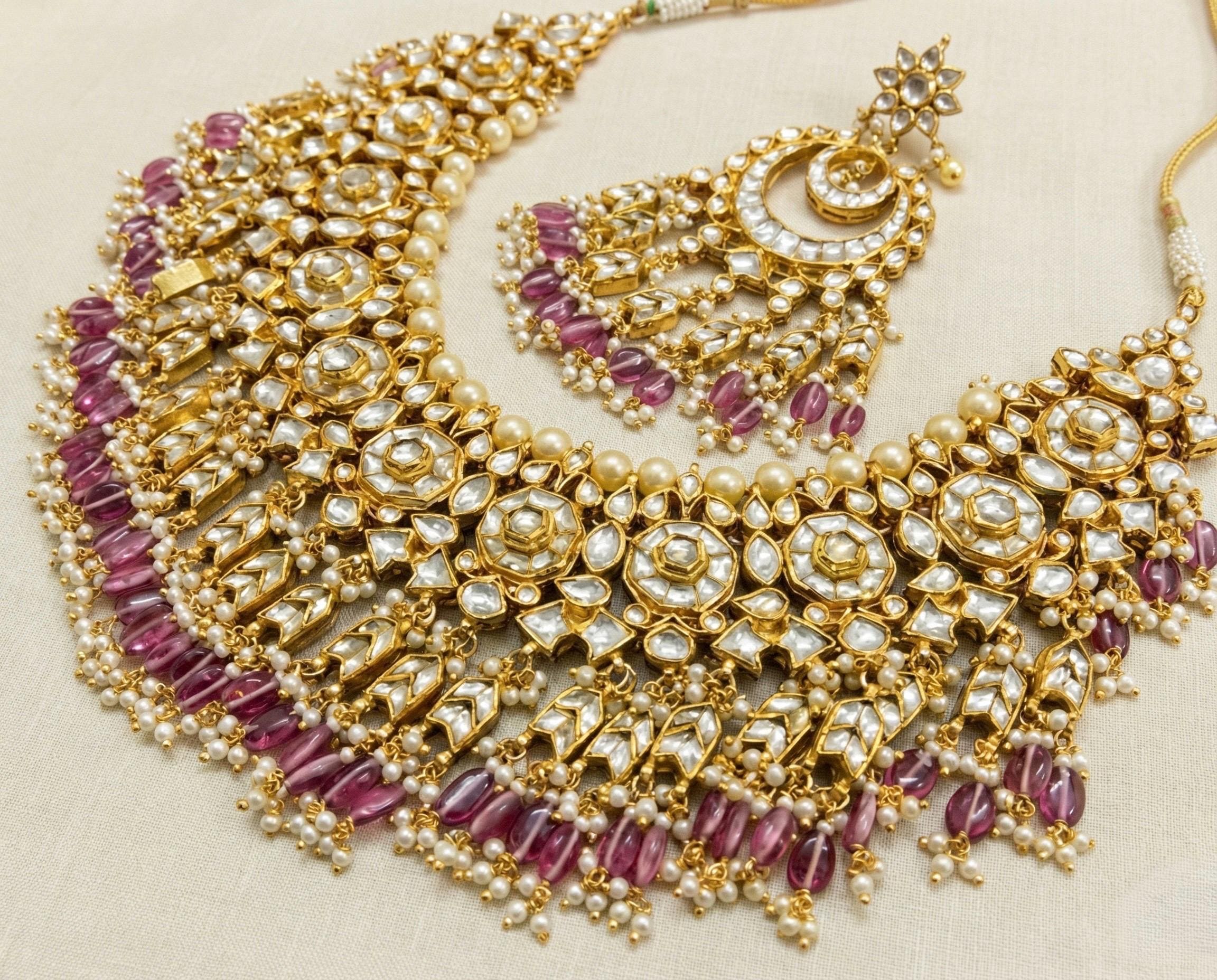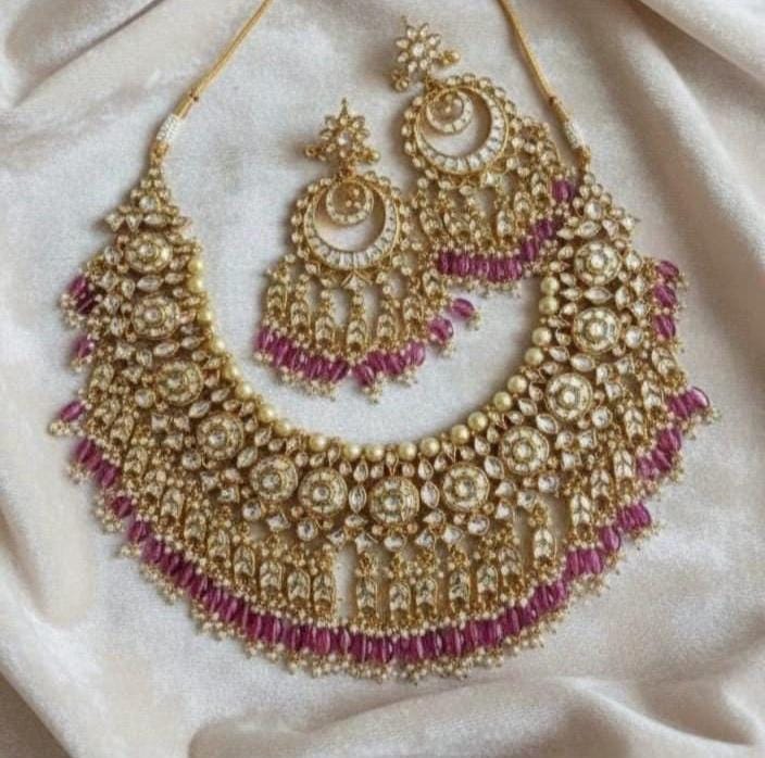 • Indian Handmade Gold Plated Kundan Jewelry Necklace and Earrings Set.