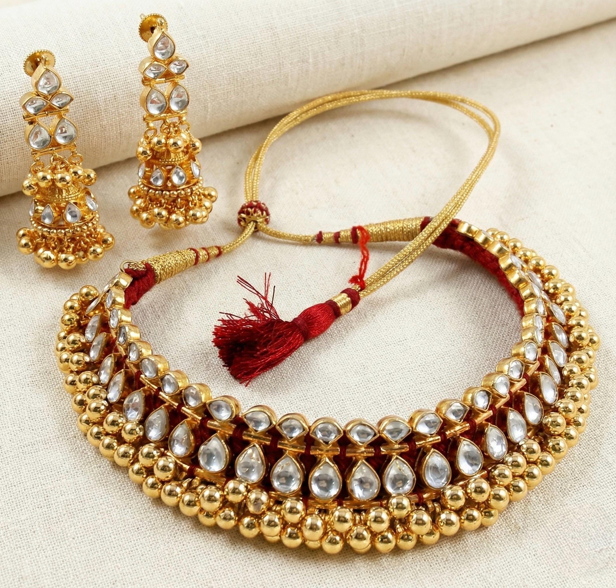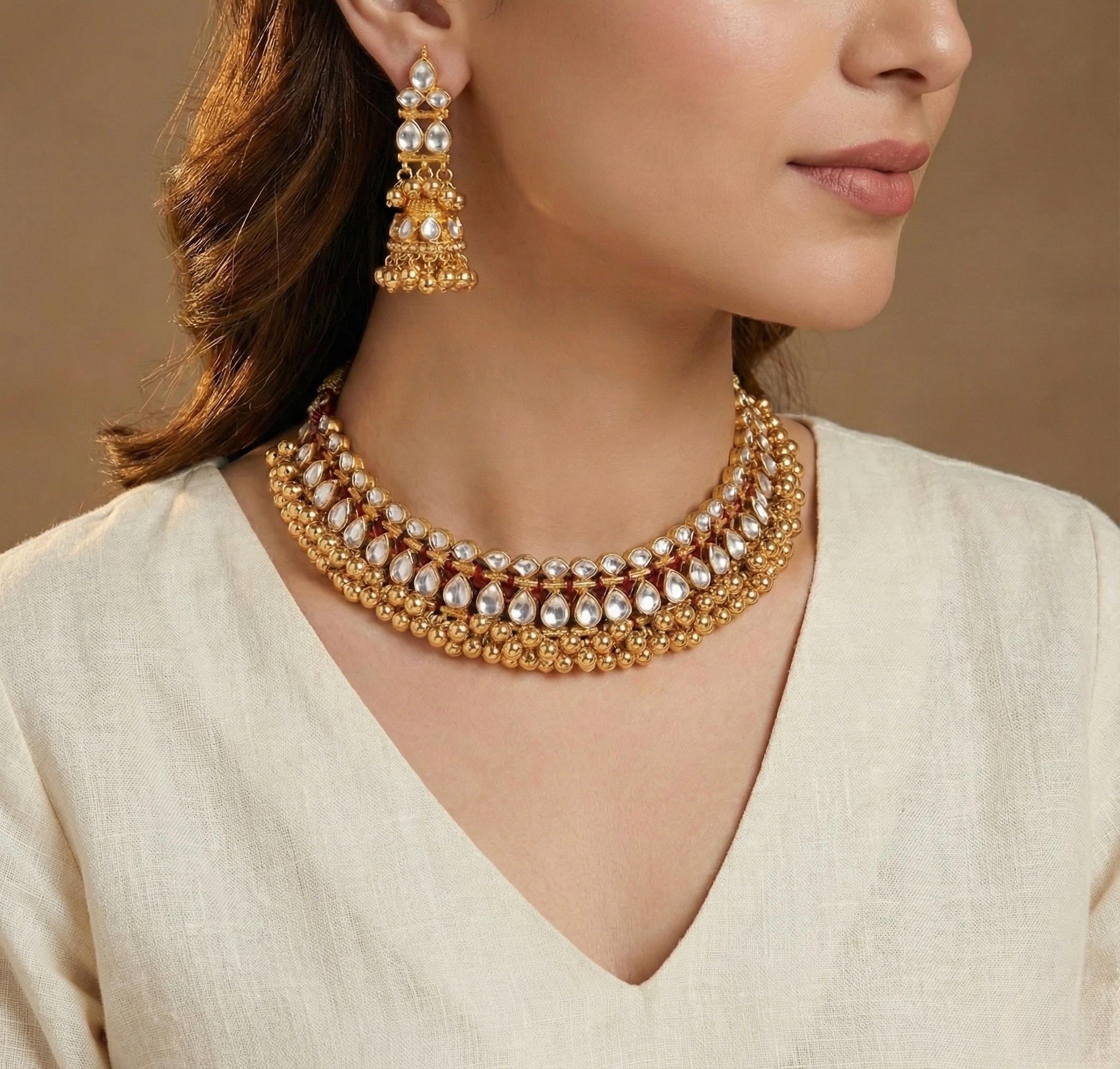 This handmade Kundan choker necklace and earrings set features a 22K gold-plated finish, offering timeless elegance in traditional Indian jewelry.