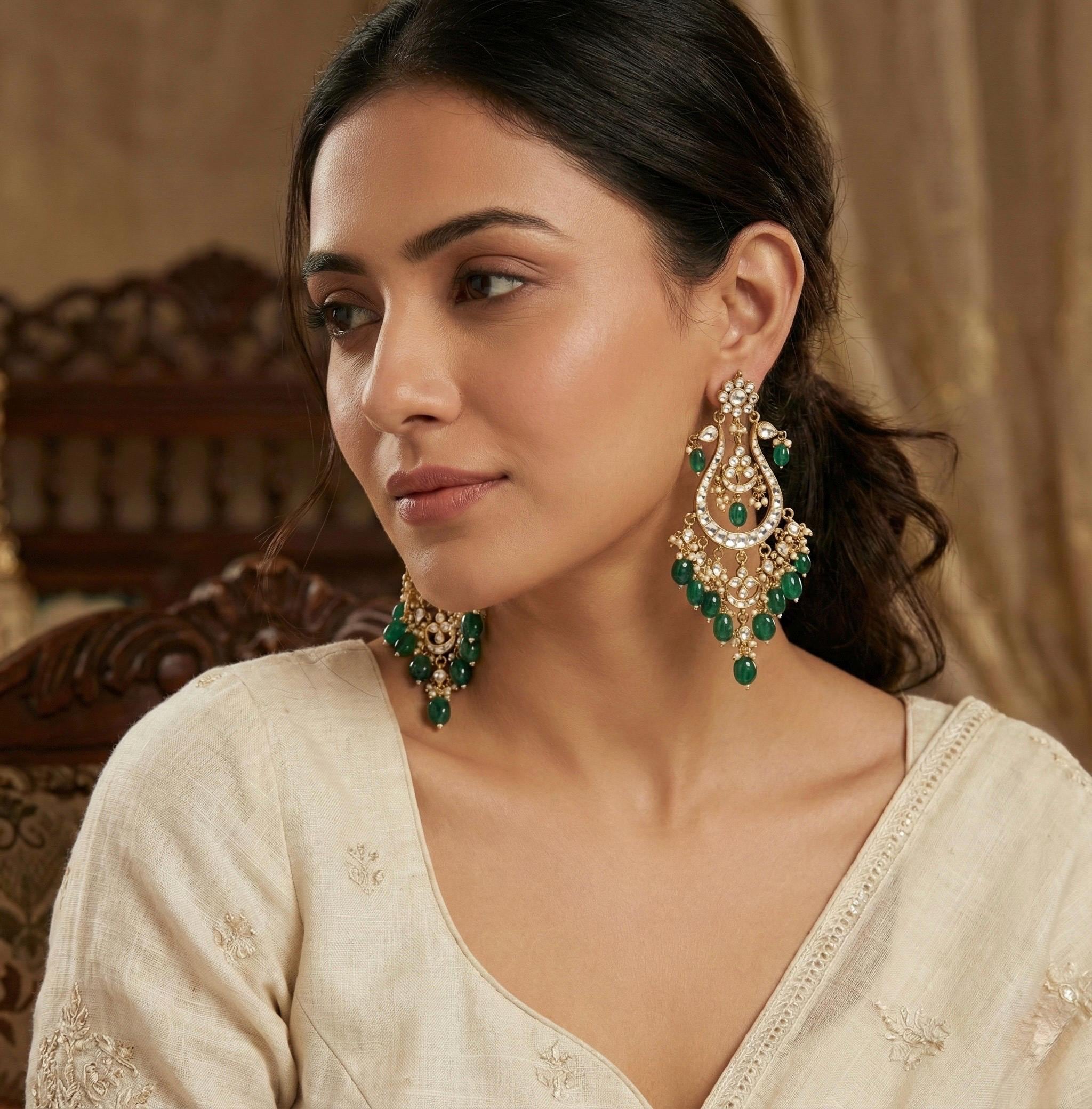 • It’s Handmade Indian Ethnic Kundan Earrings Set with green drops.