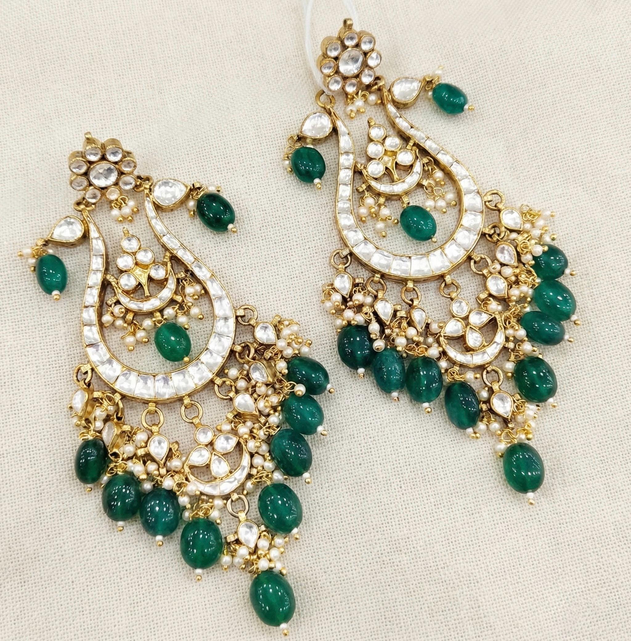 Antique Gold Finish Silver Jewelry Statement Earrings Kundan Bridal Jewelry Earrings for Indian and Pakistani Brides for all Occasions.