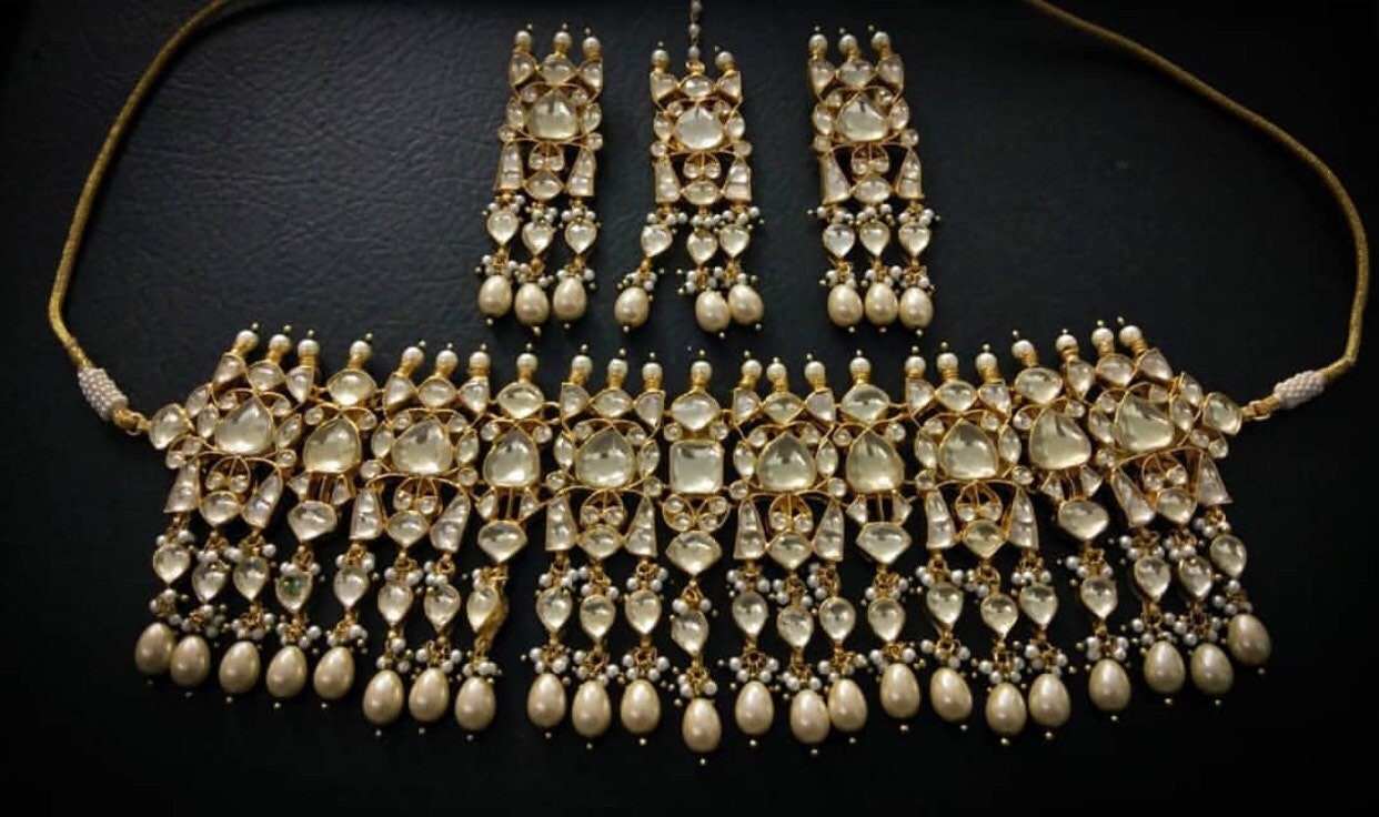 # Its heavy Choker style Bridal Necklace with Long Earrings in White Kundan Beaded with White Pearls like shown in Picture.