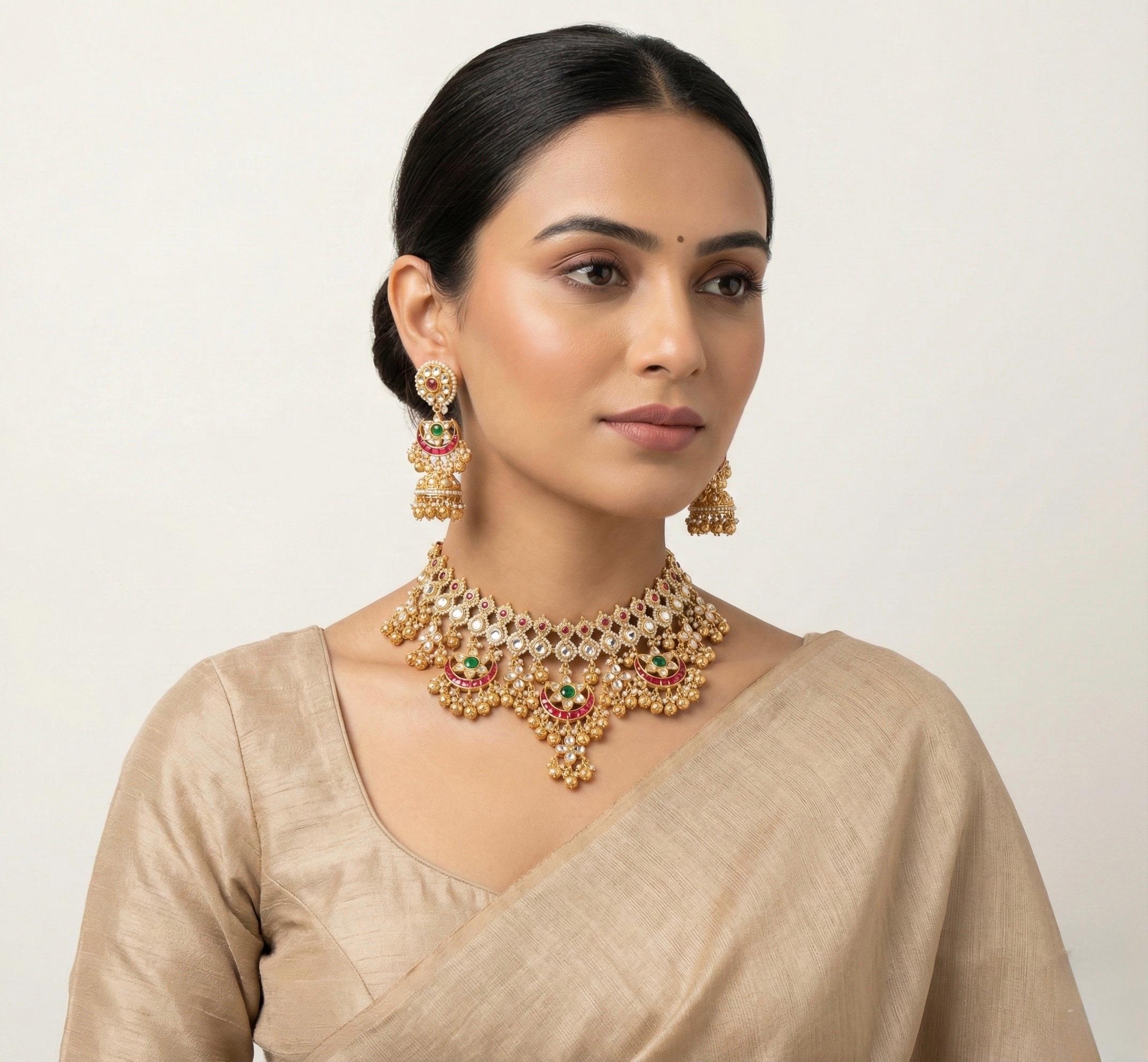 This luxurious handmade Kundan choker necklace set features finely set uncut stones, delicate pearl beading, and rich 22K gold plating, designed to elevate Indian and Pakistani bridal looks. Indian Wedding Jewelry with Handmade Chandbali Earrings