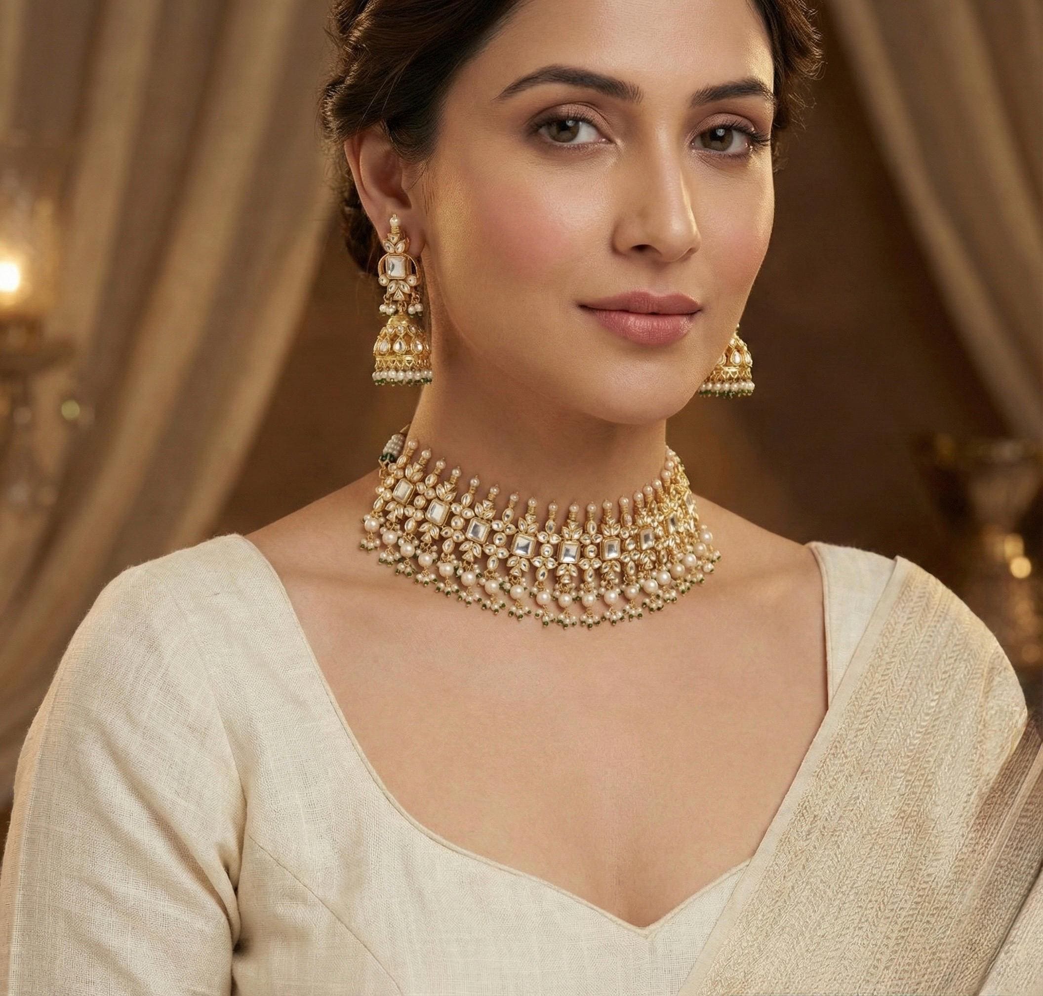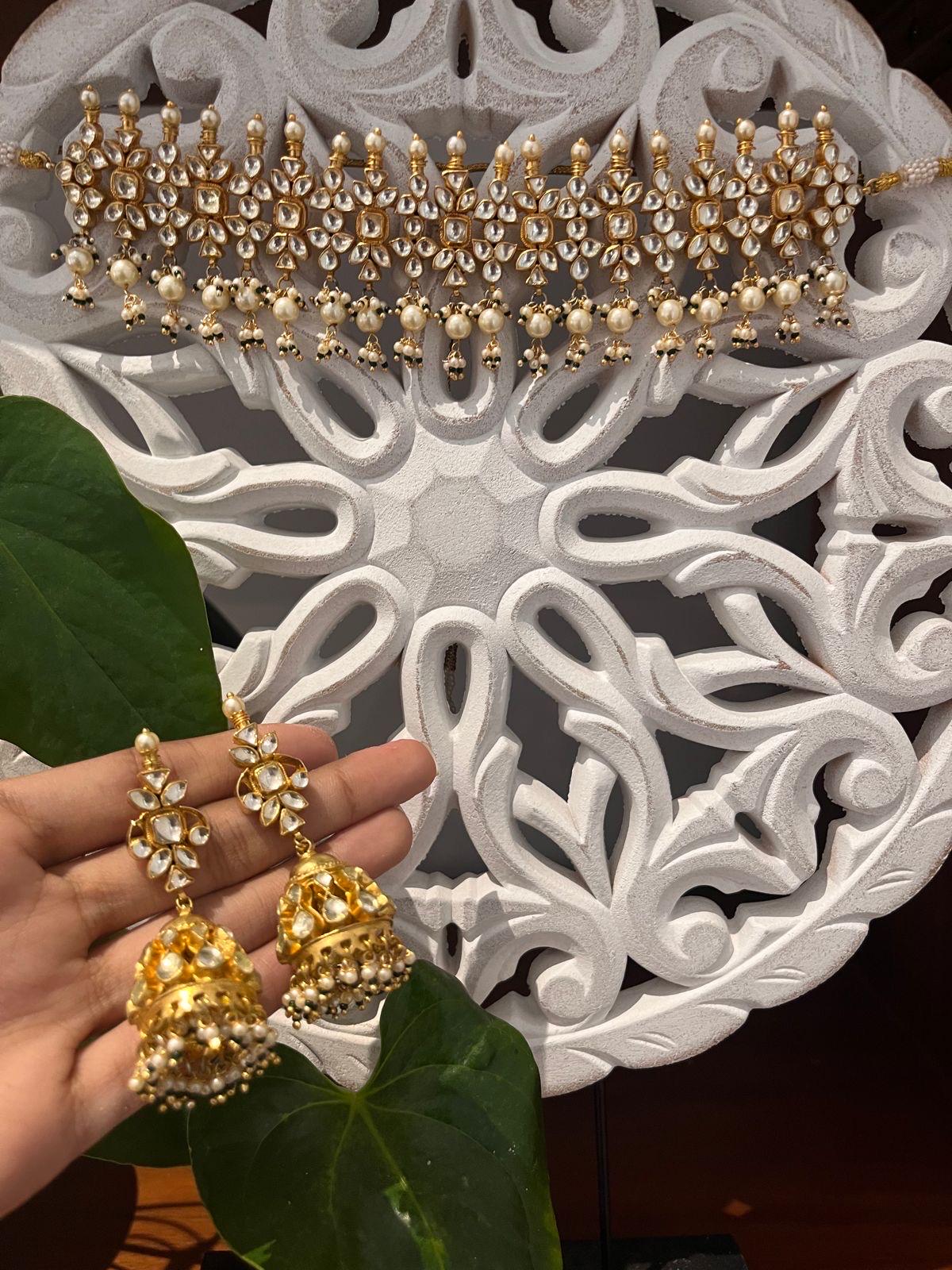 Handmade Kundan choker necklace paired with matching jhumki earrings, beautifully gold plated and crafted in traditional Indian style—perfect for weddings, bridal wear, and festive occasions.