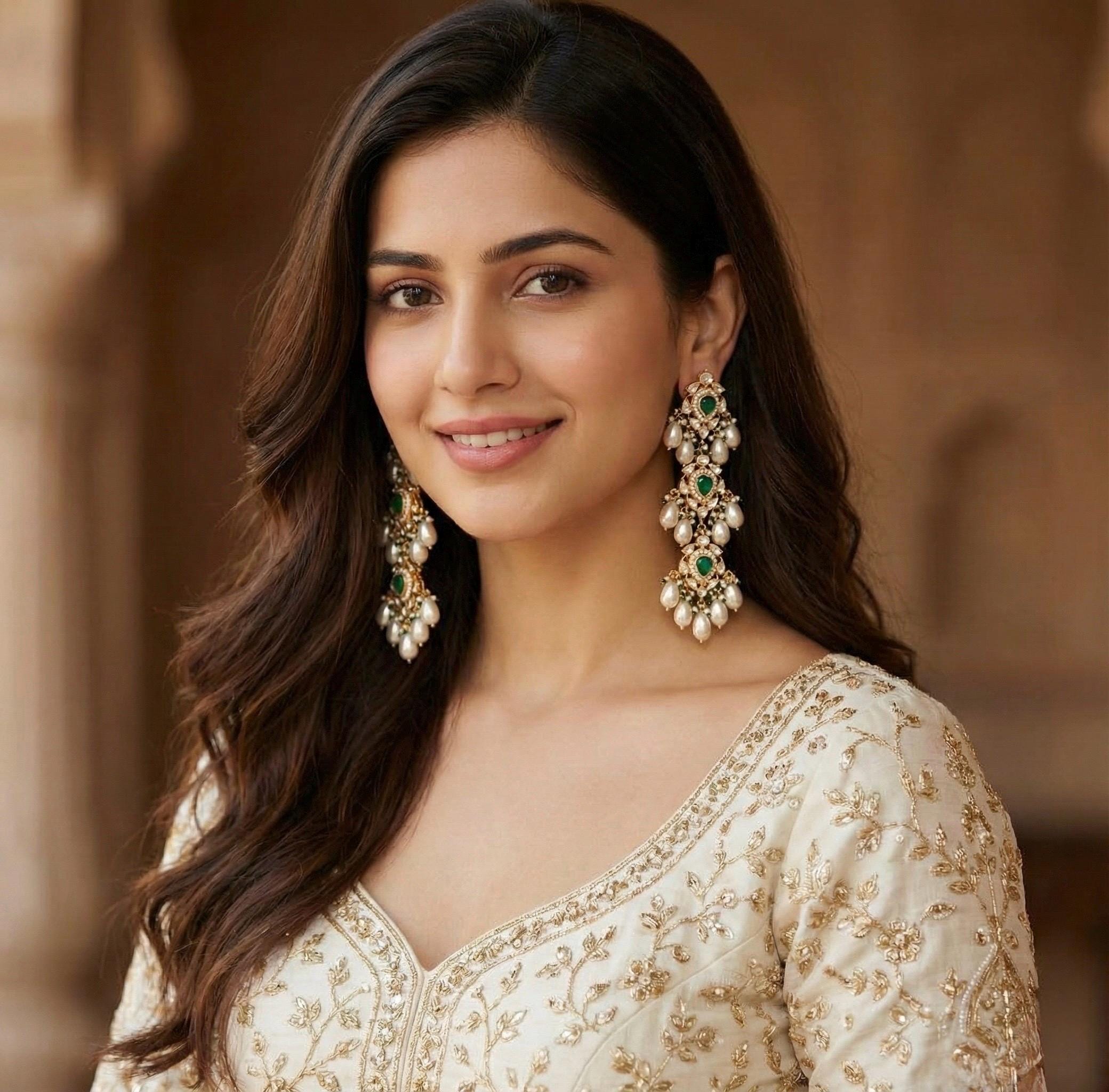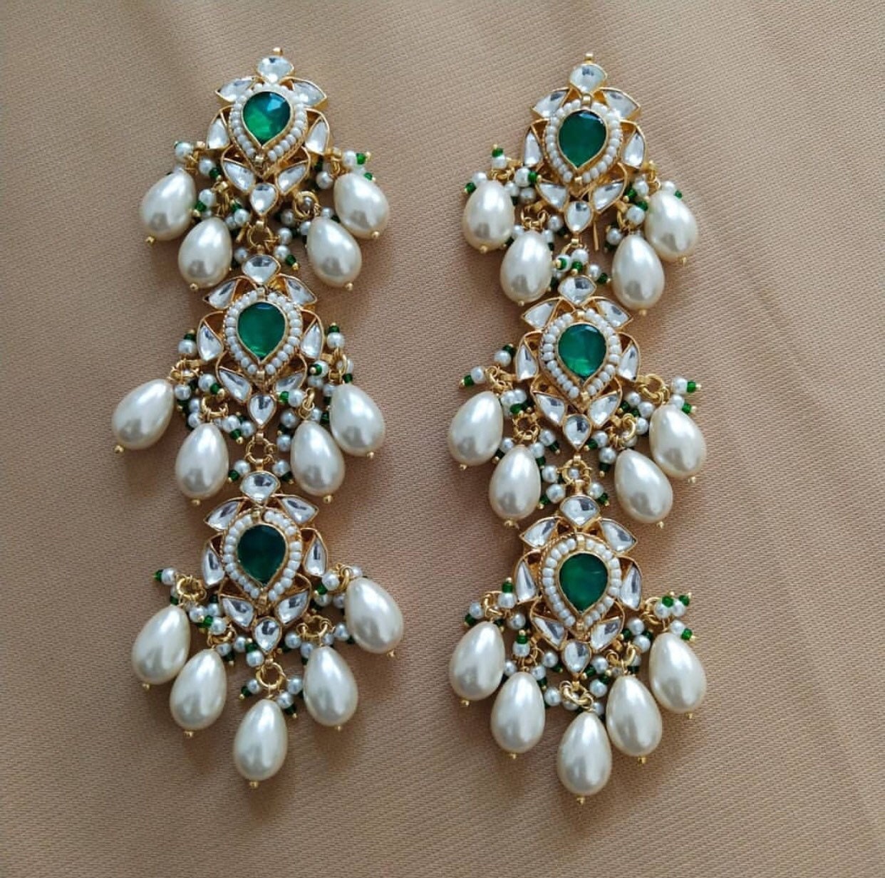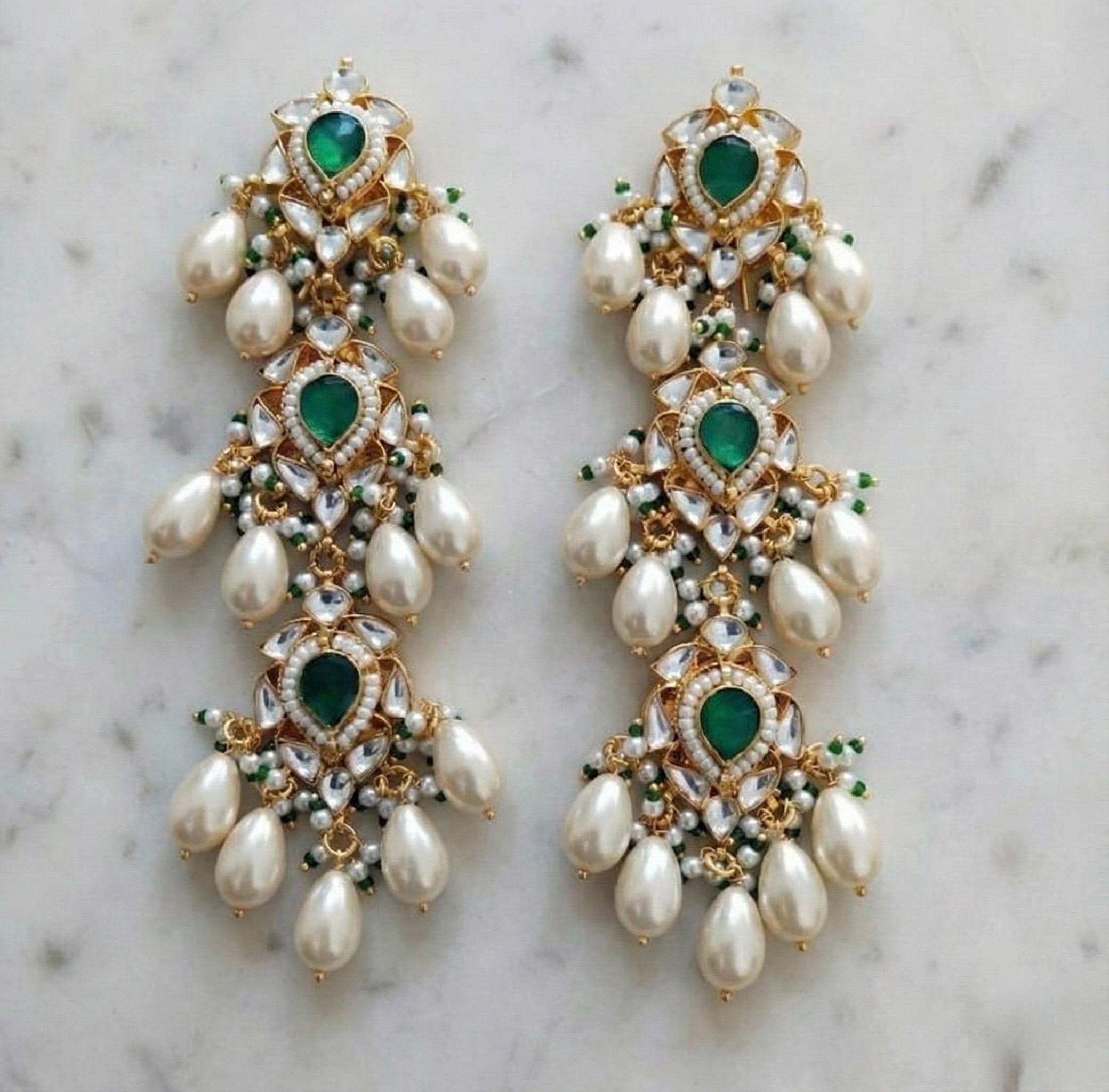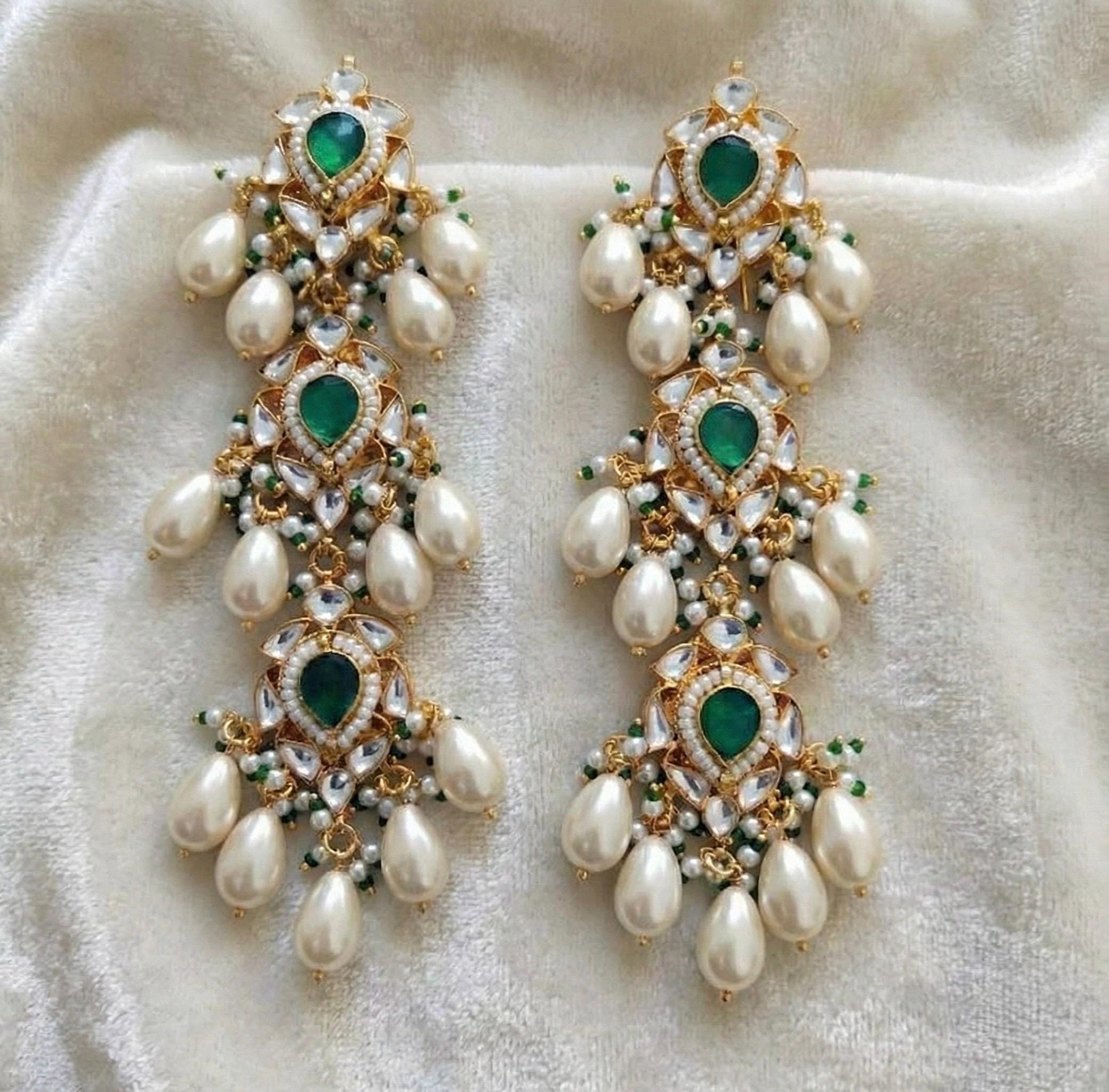 The graceful pearl drops add soft movement and a timeless charm, making these earrings ideal for weddings, receptions, festivals, and special celebrations. Designed to complement sarees, lehengas, and anarkalis, they bring a refined royal touch to both bridal and occasion wear.