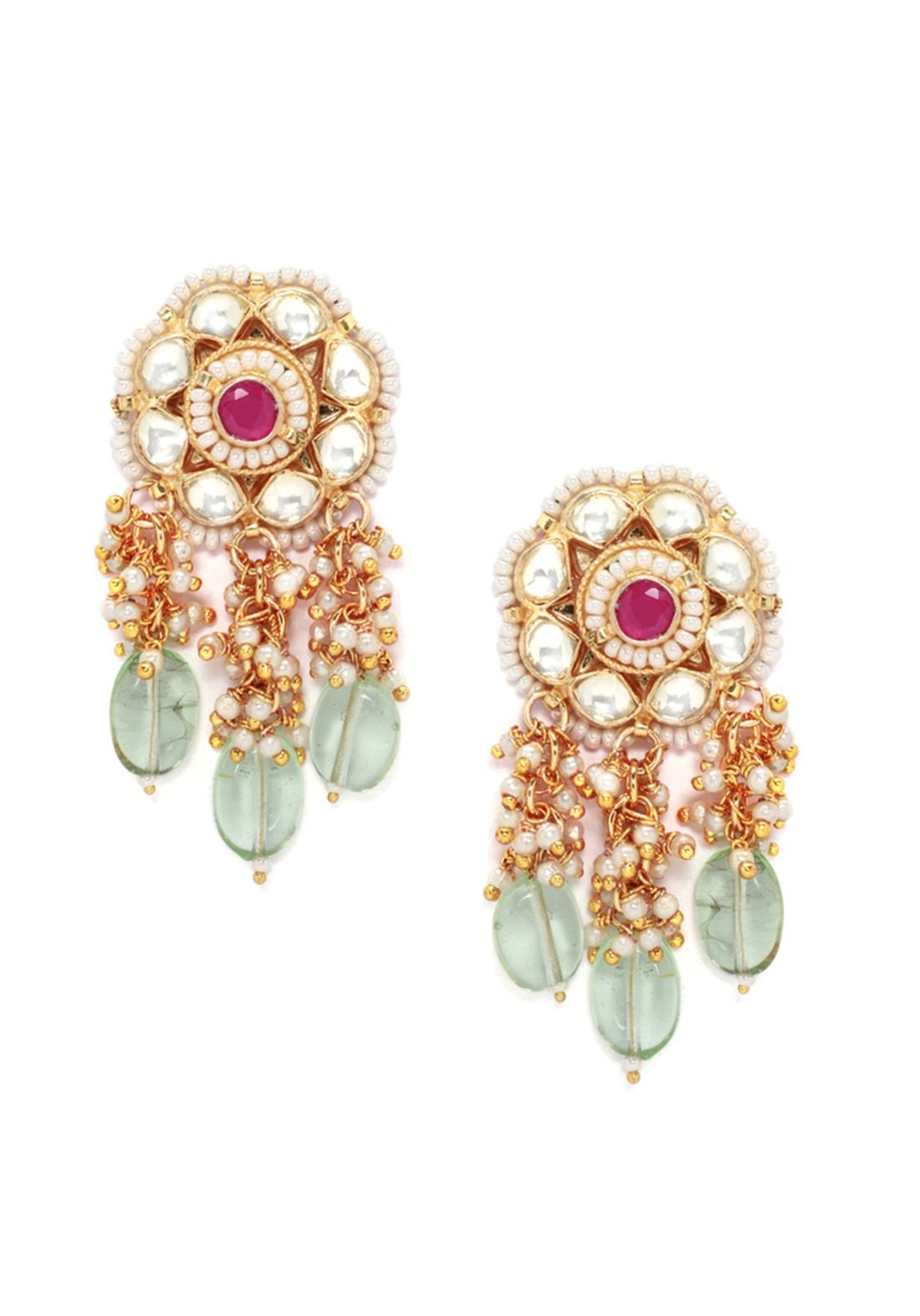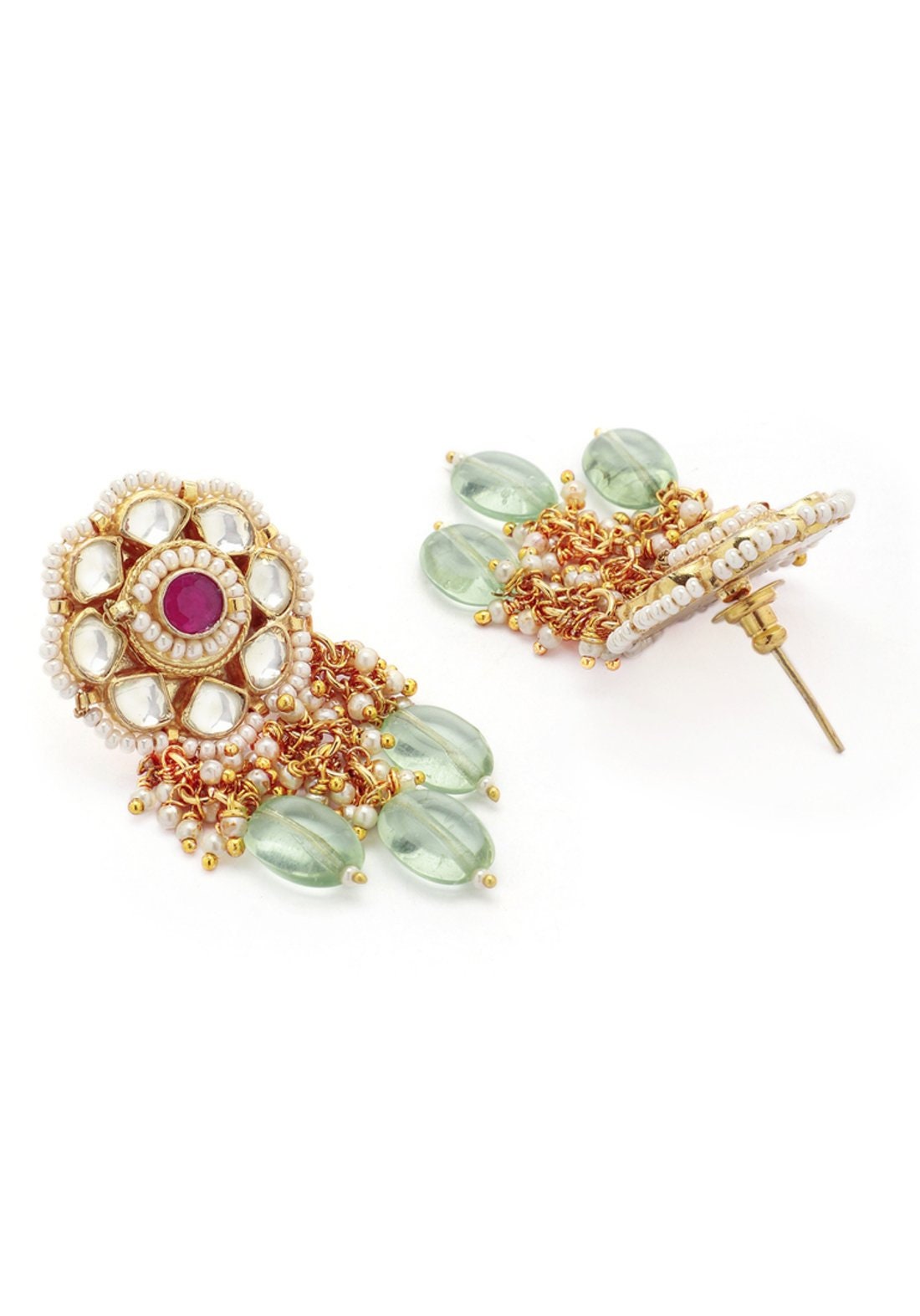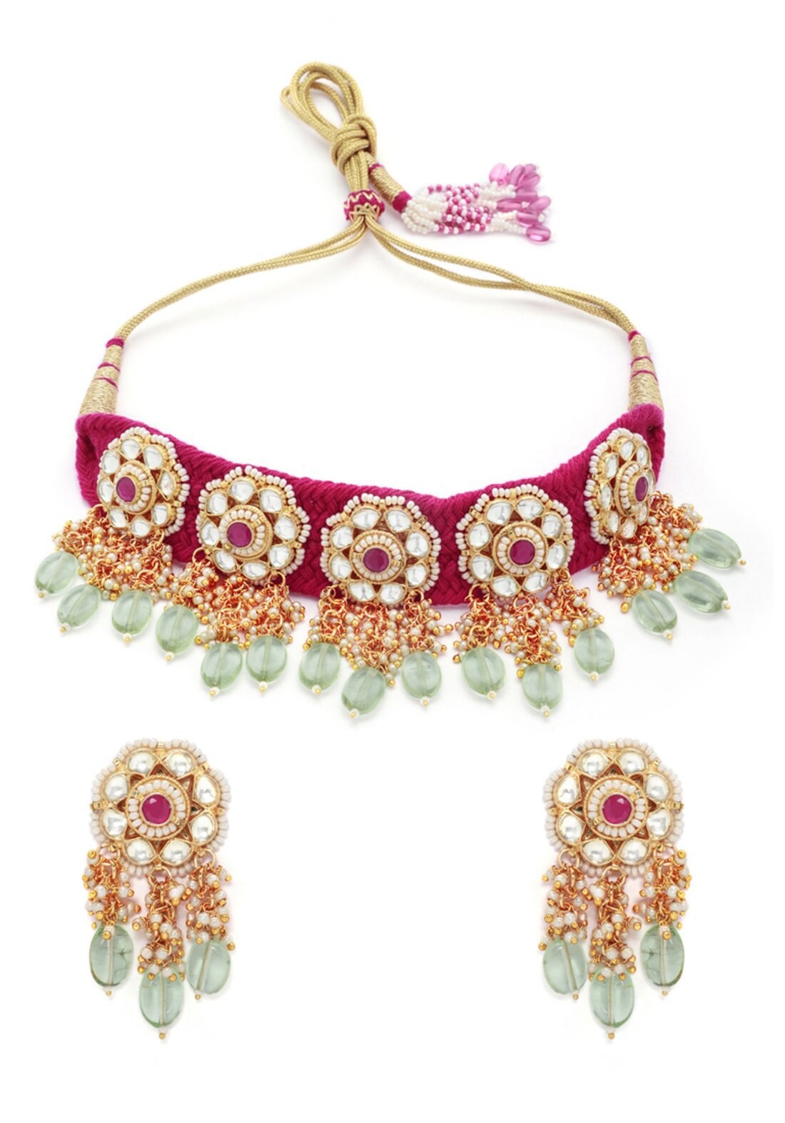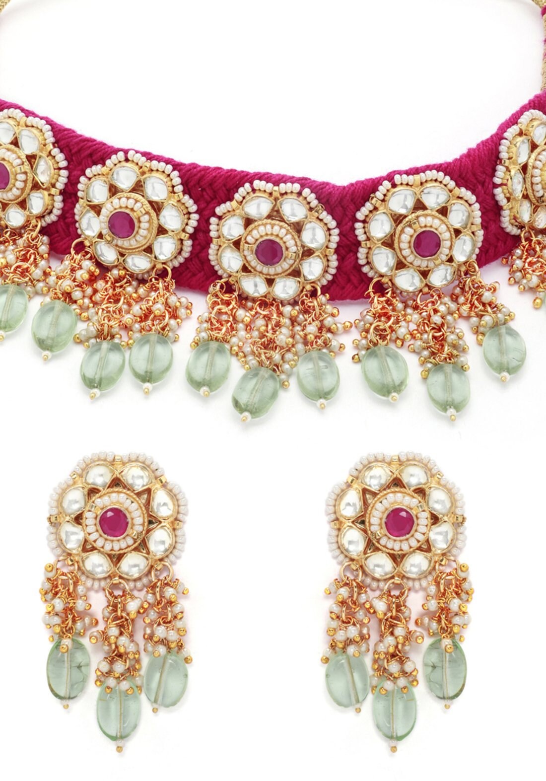 This is Beautiful Pink Threaded Pink and Green Kundan Choker Necklace with Earrings.