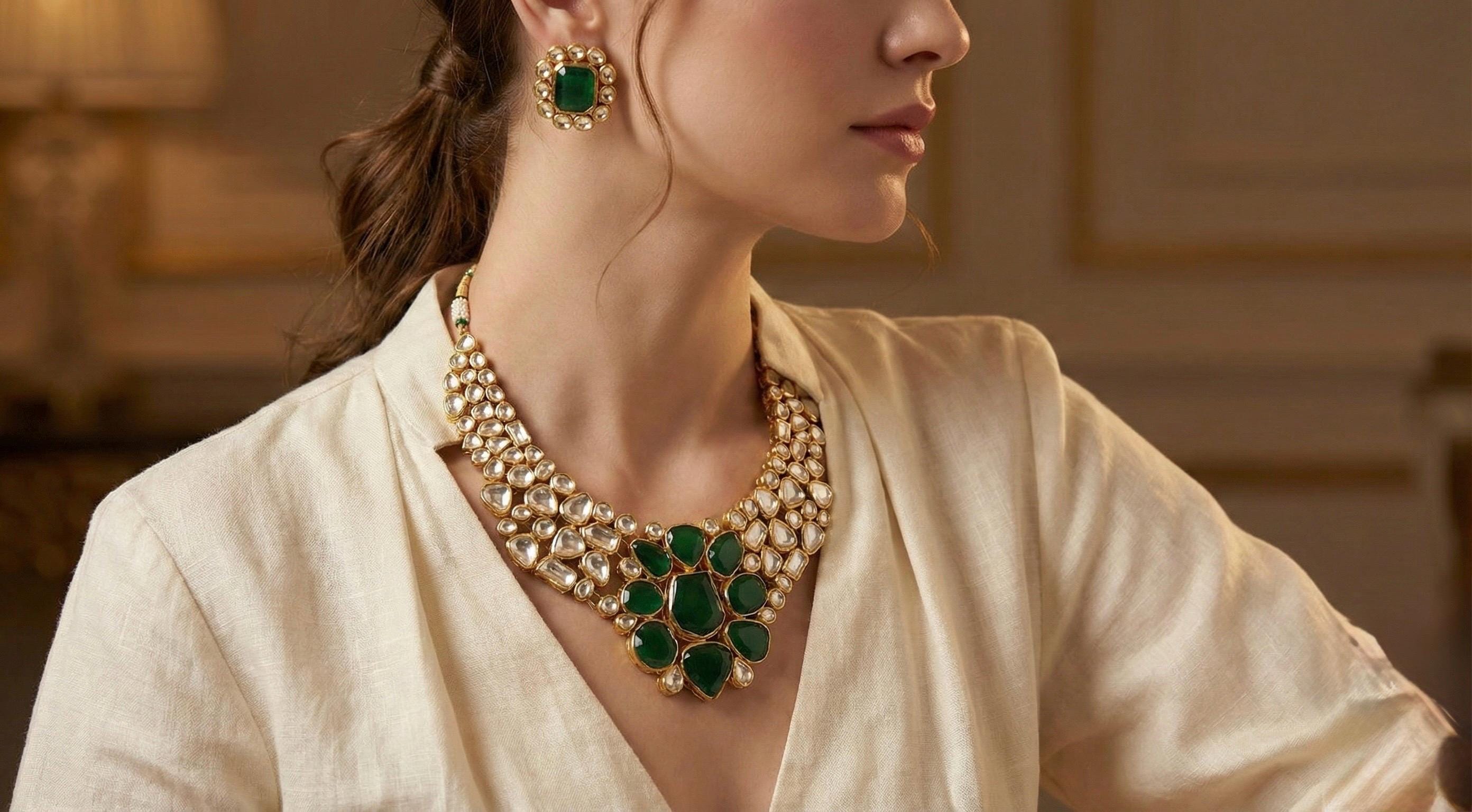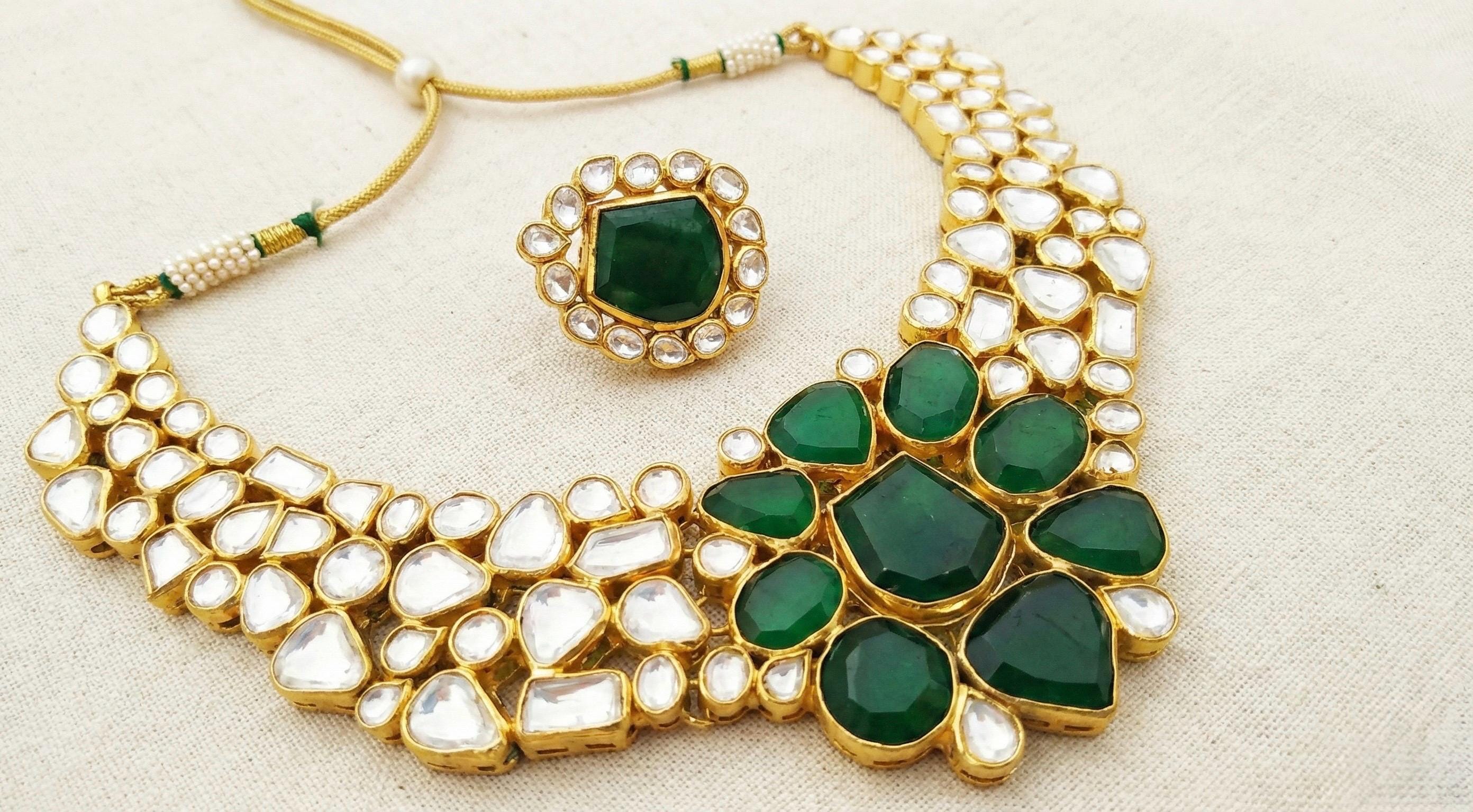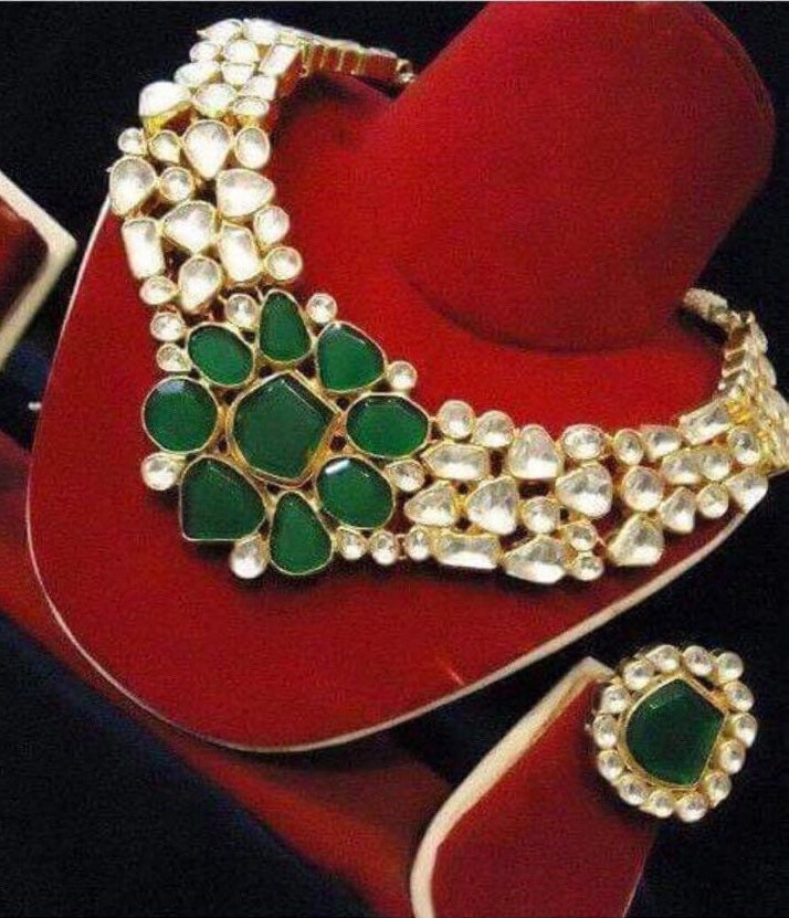 • Beautiful Ethnic Indian Wedding Choker with Statement Earrings and emerald green cut stones.