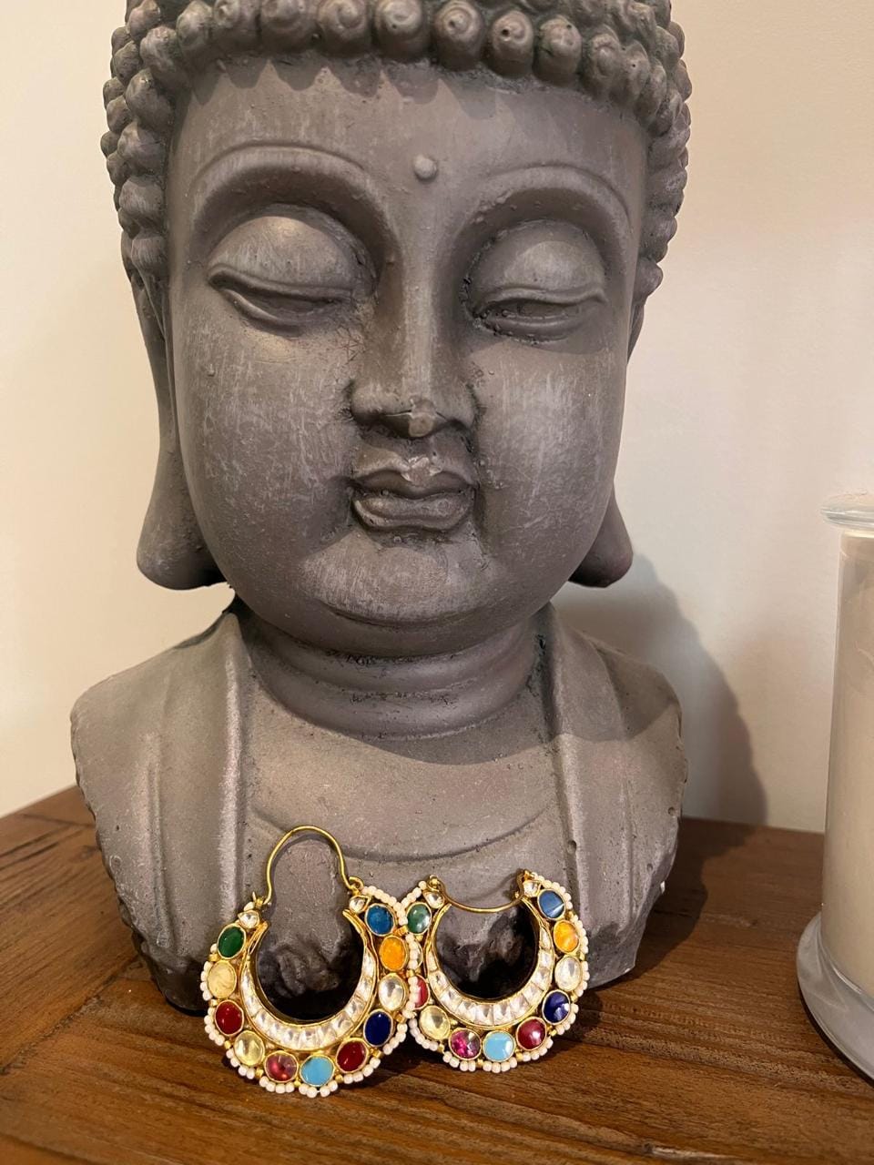 Designer Chandbali Kundan Earrings with Chand Sitara theme having Navratna Kundan Stones with 22k Gold Plating.