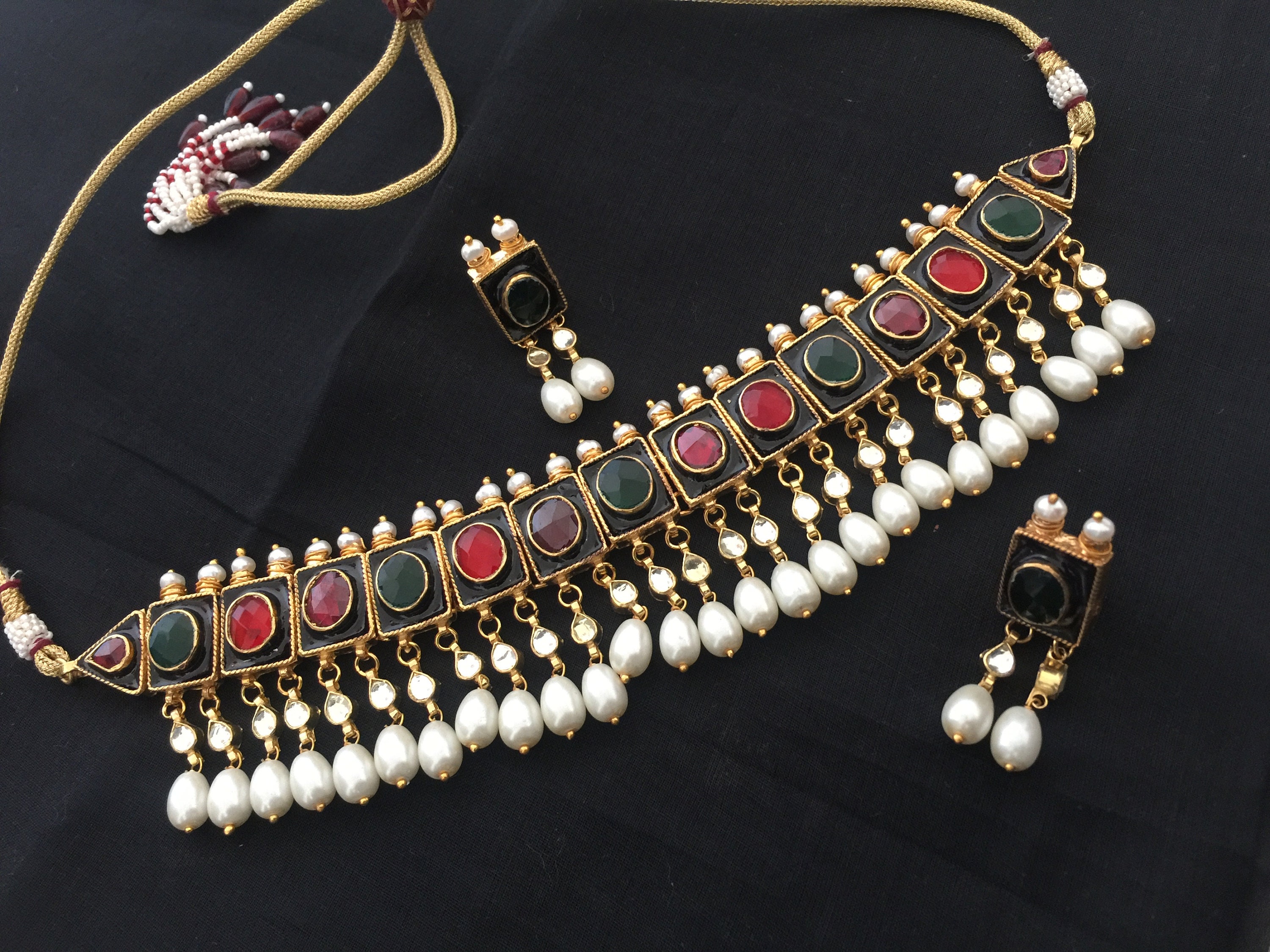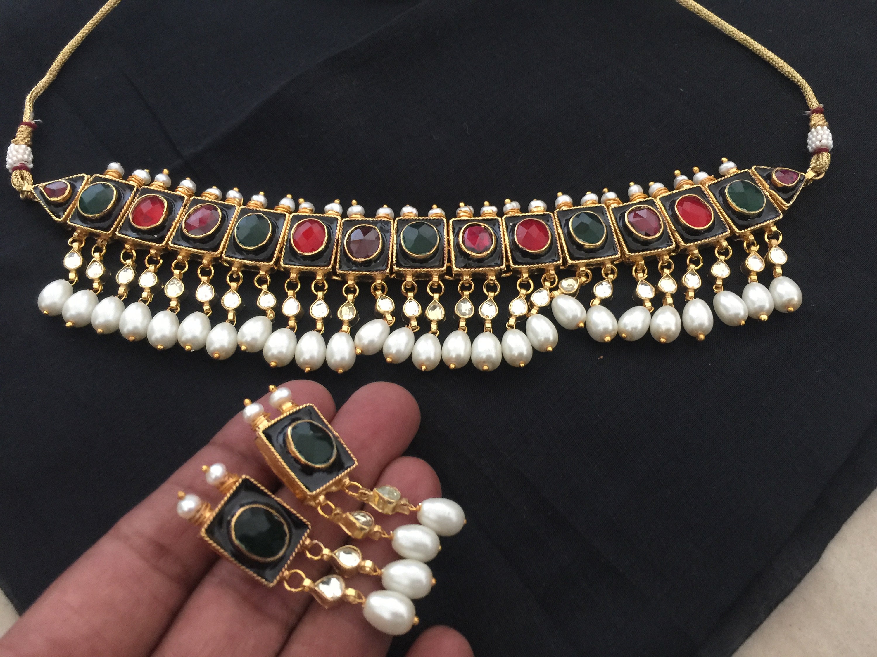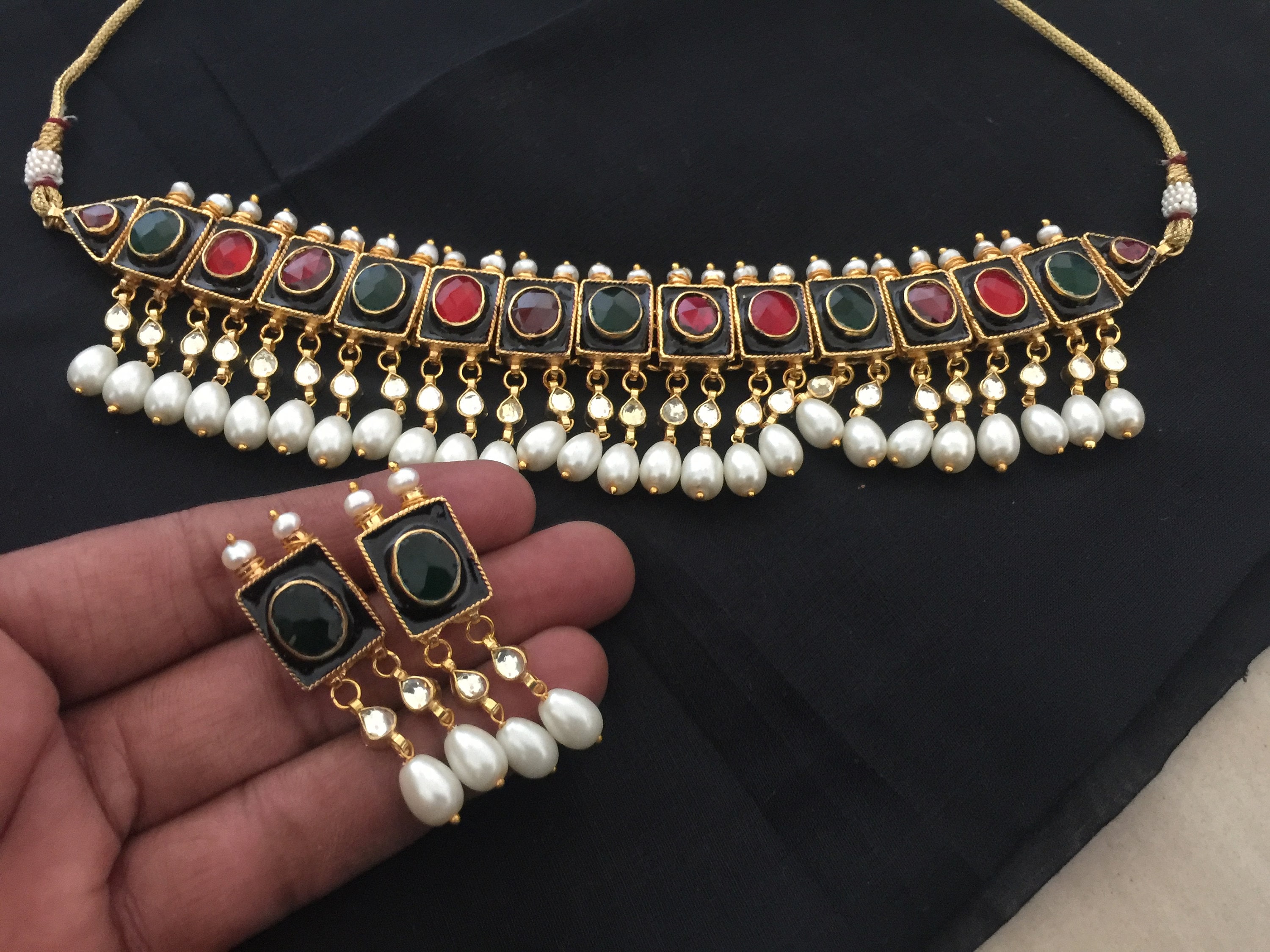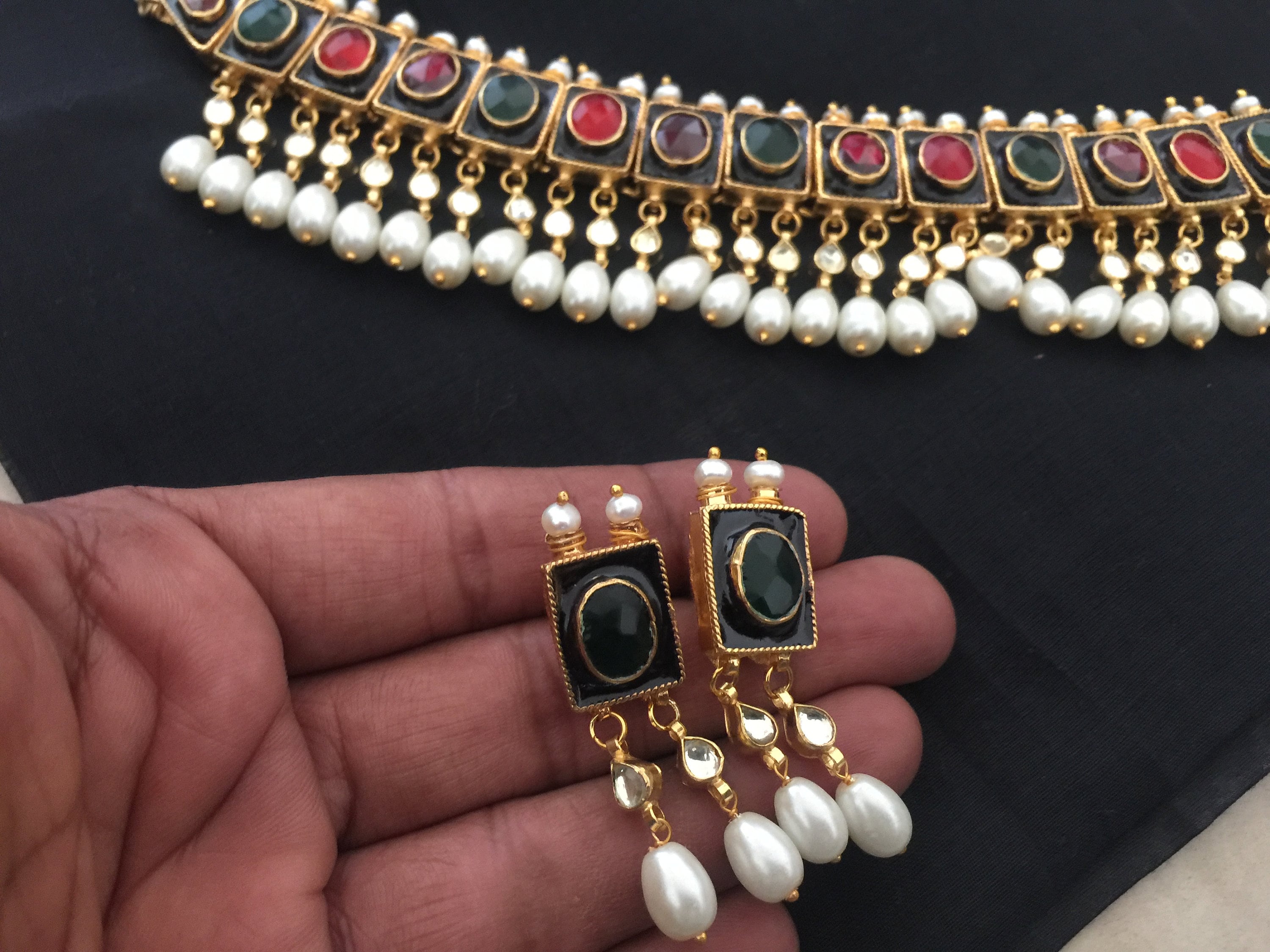 • It is a beautiful Ethnic Multi Color Wedding Choker with Black Enamel and Statement Earrings.