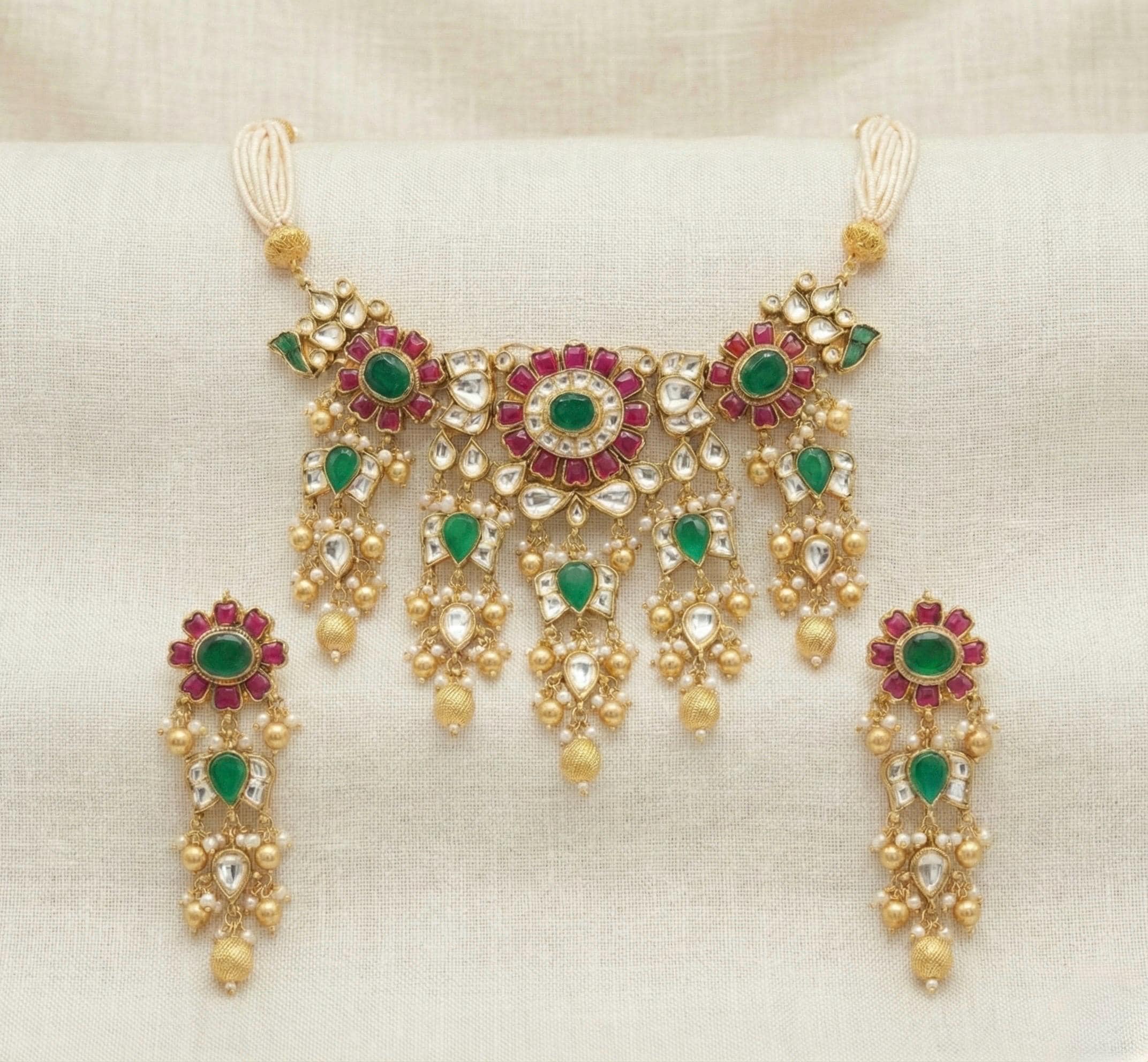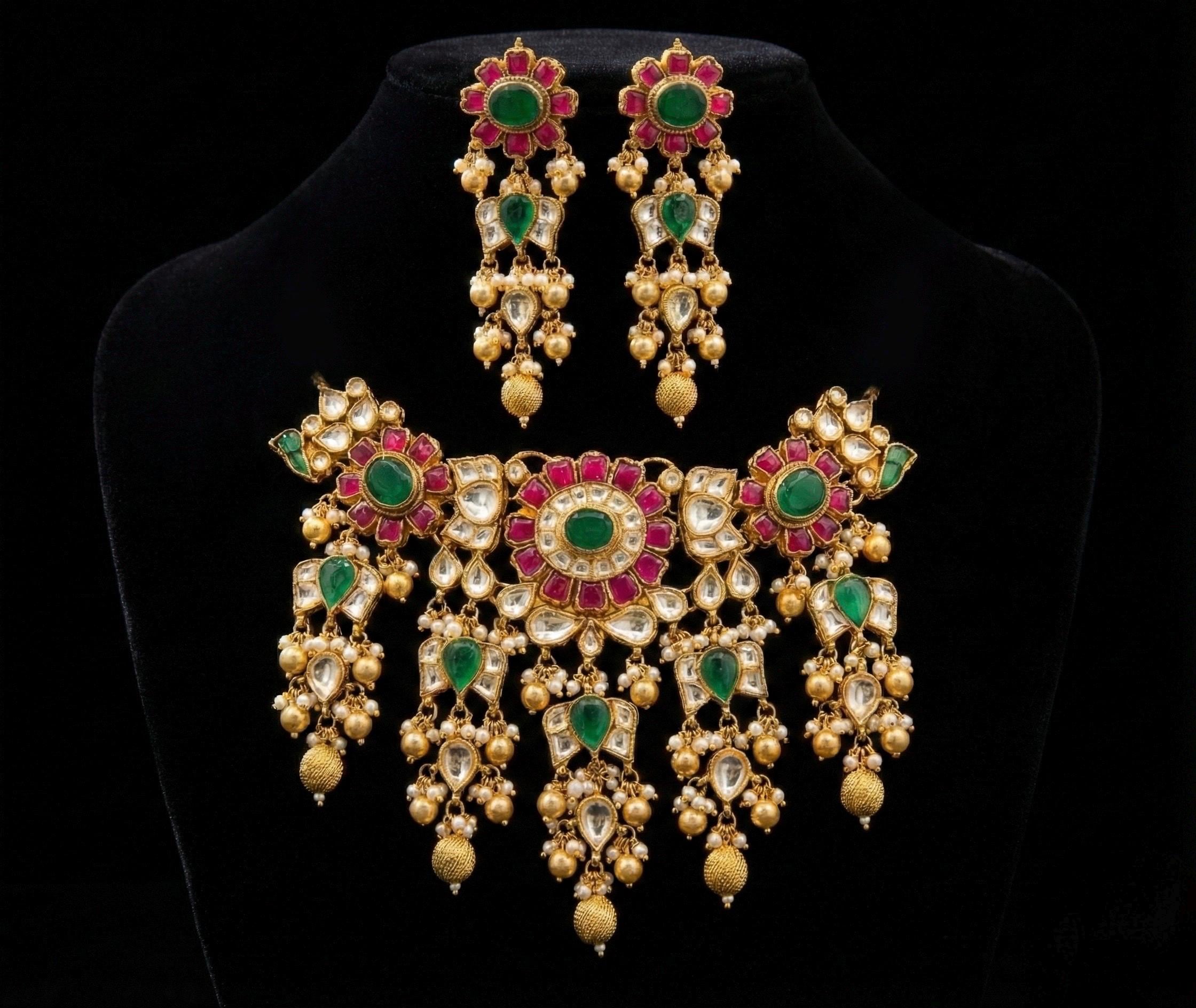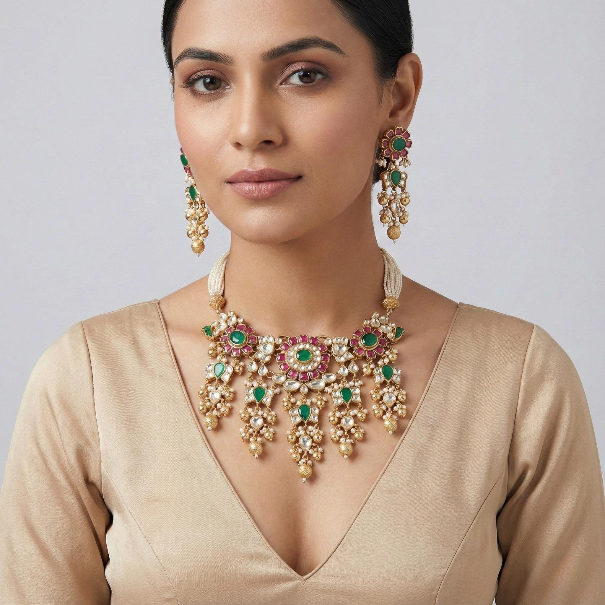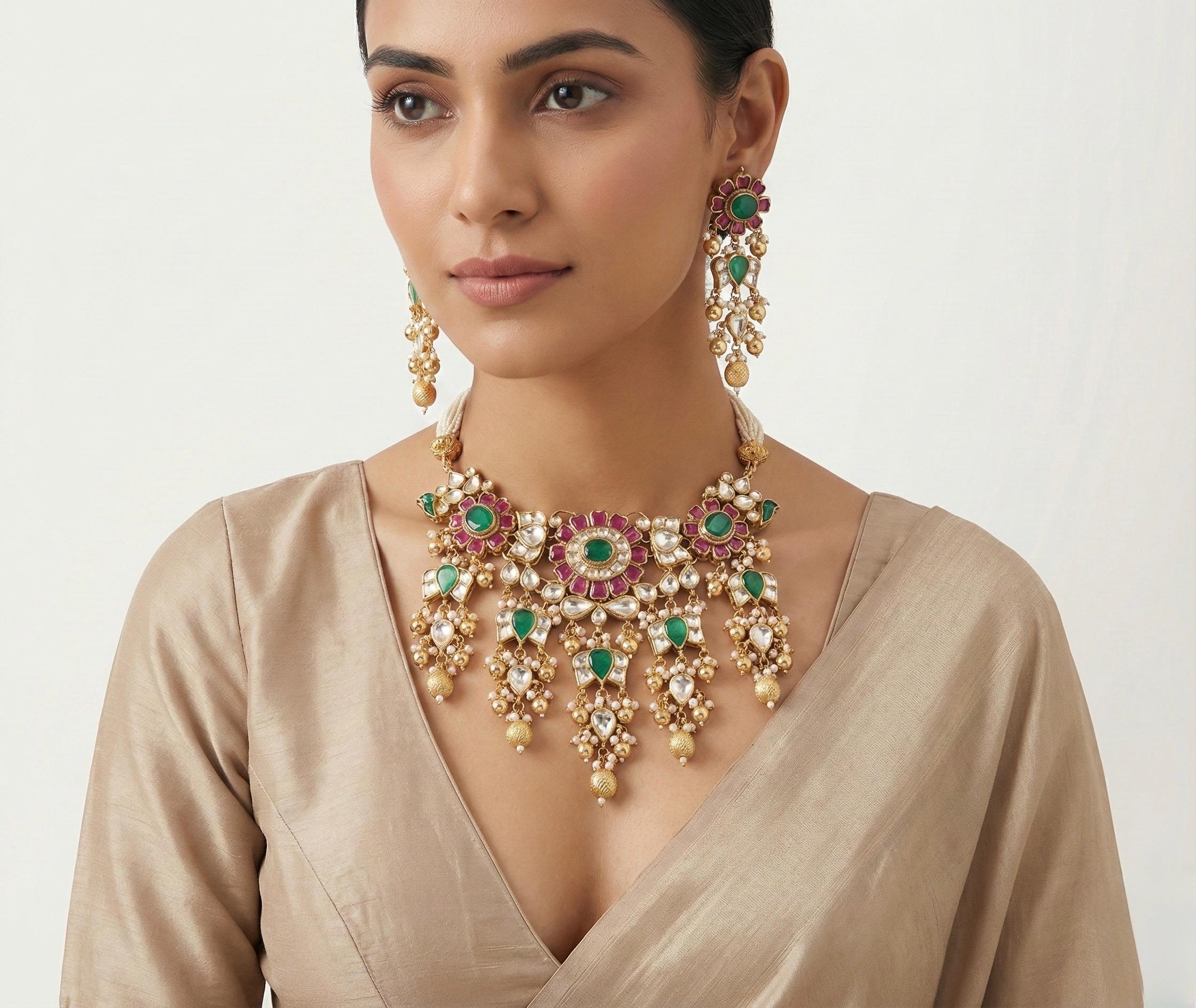 The choker necklace rests beautifully along the neckline, creating a regal and sophisticated silhouette, while the matching pieces complete the look with harmonious balance. Perfect for weddings, bridal wear, festive occasions, and cultural celebrations, this heritage-inspired set pairs effortlessly with sarees, lehengas, and classic ethnic ensembles.