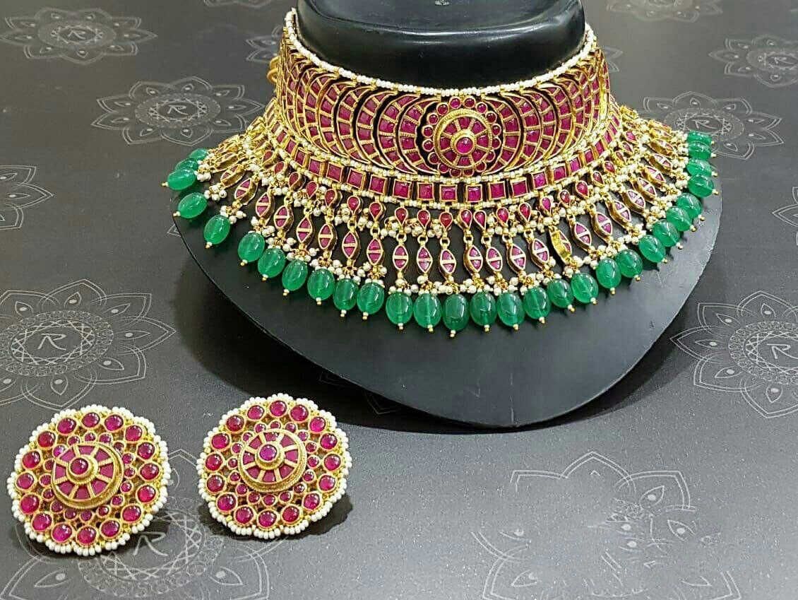• Its beautiful Ethnic Indian Wedding Choker with Statement Earrings beaded with emerald green beads.