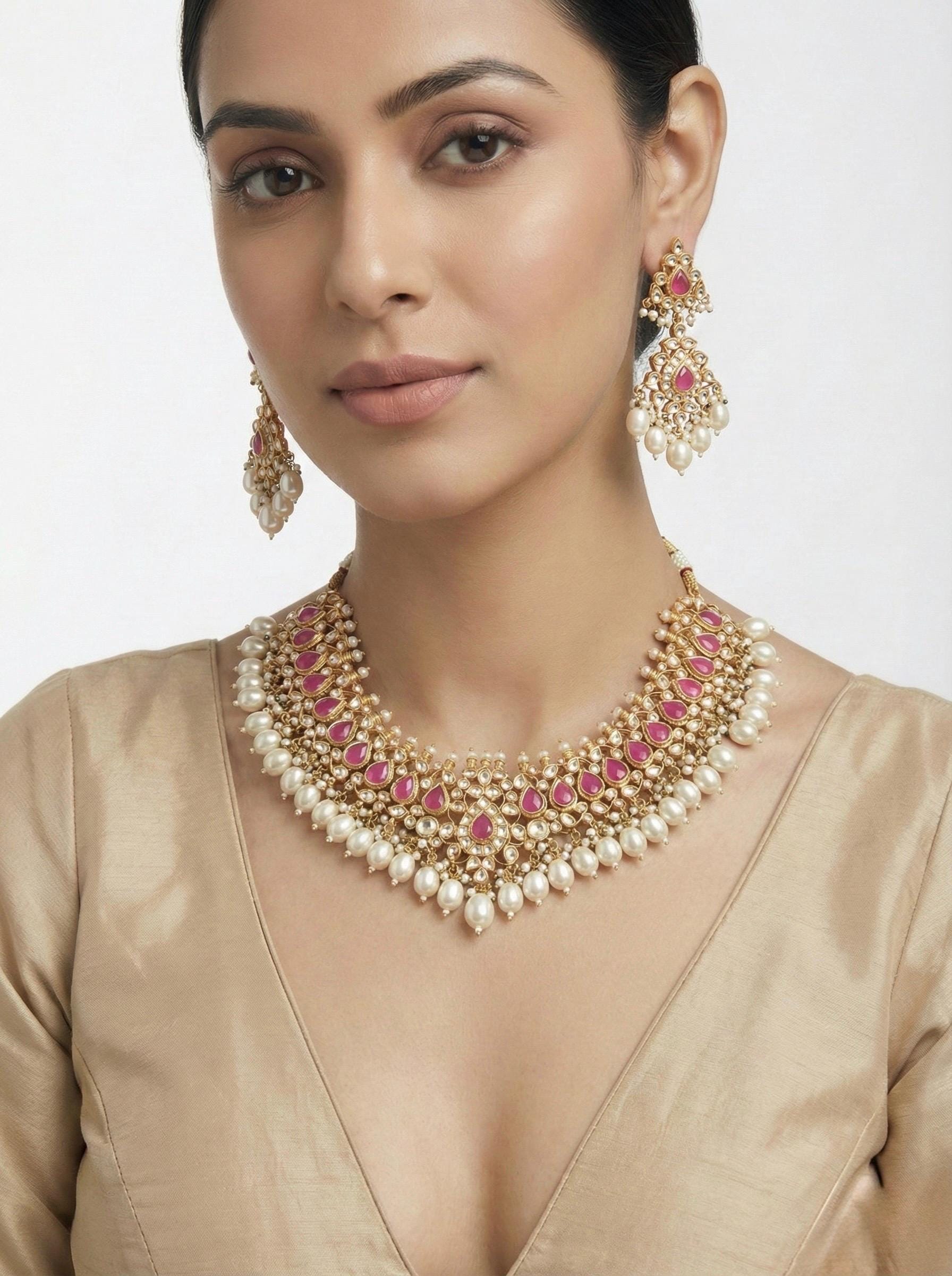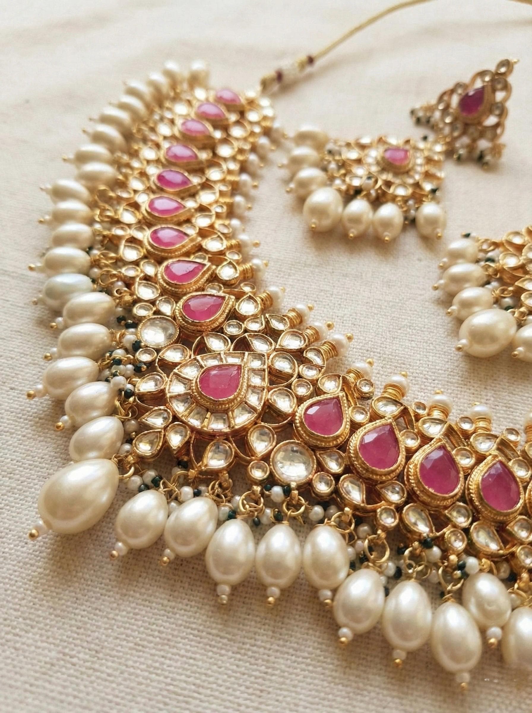 This luxurious handmade Kundan bridal necklace set features finely set uncut stones, delicate pearl beading, and rich 22K gold plating, designed to elevate Indian and Pakistani bridal looks.