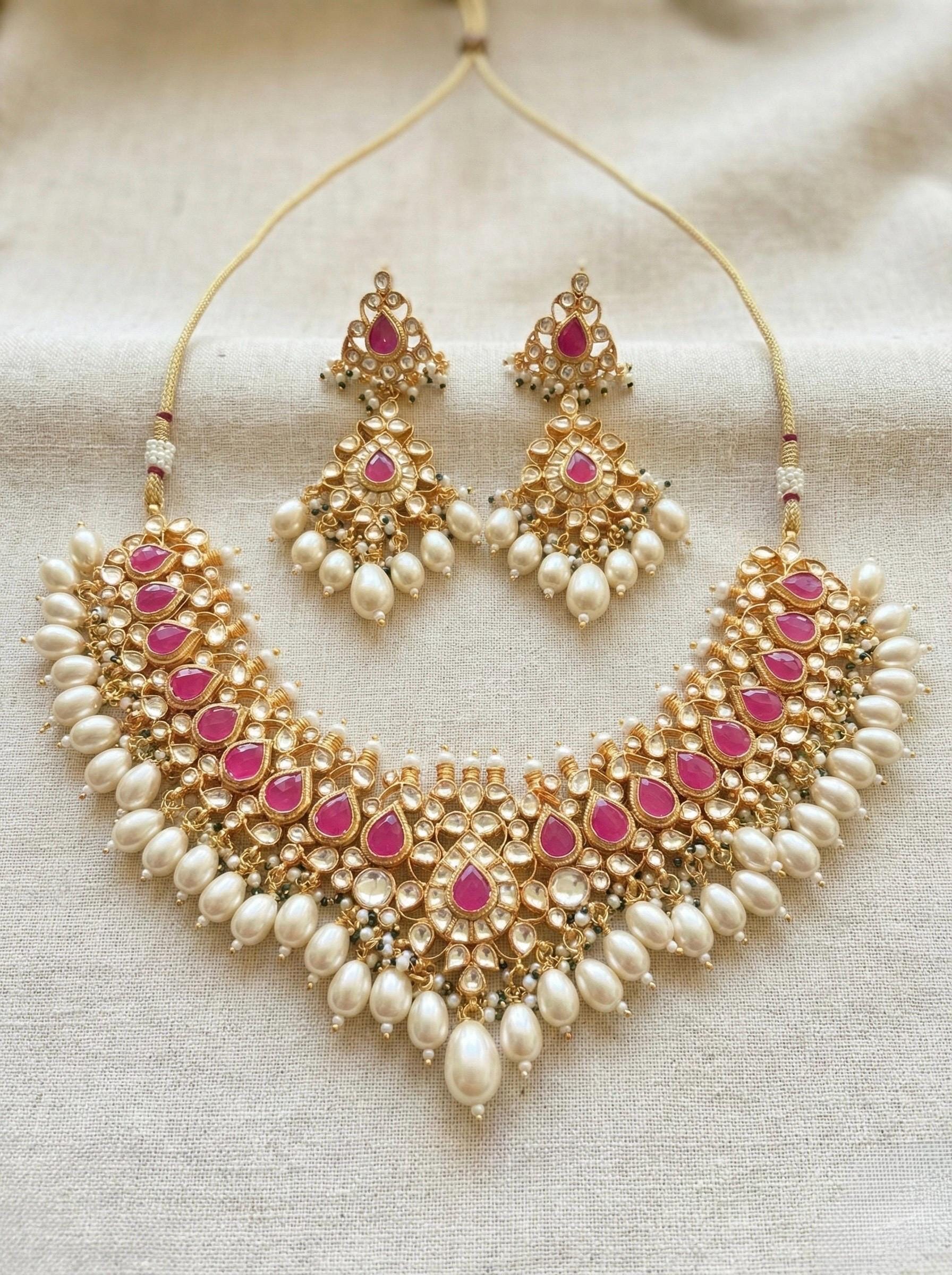 • Handmade Gold Plated Indian Kundan Jewelry Necklace and Earrings Set.