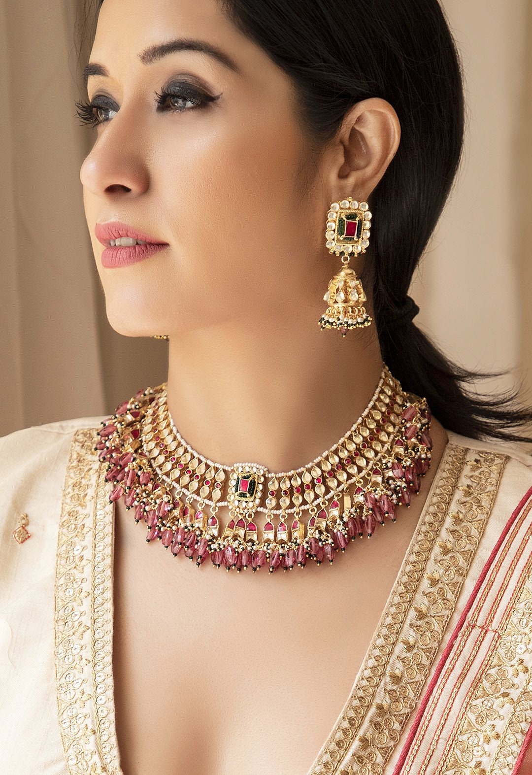 This is Beautiful Clear Golden Kundan Choker Necklace with Earrings.