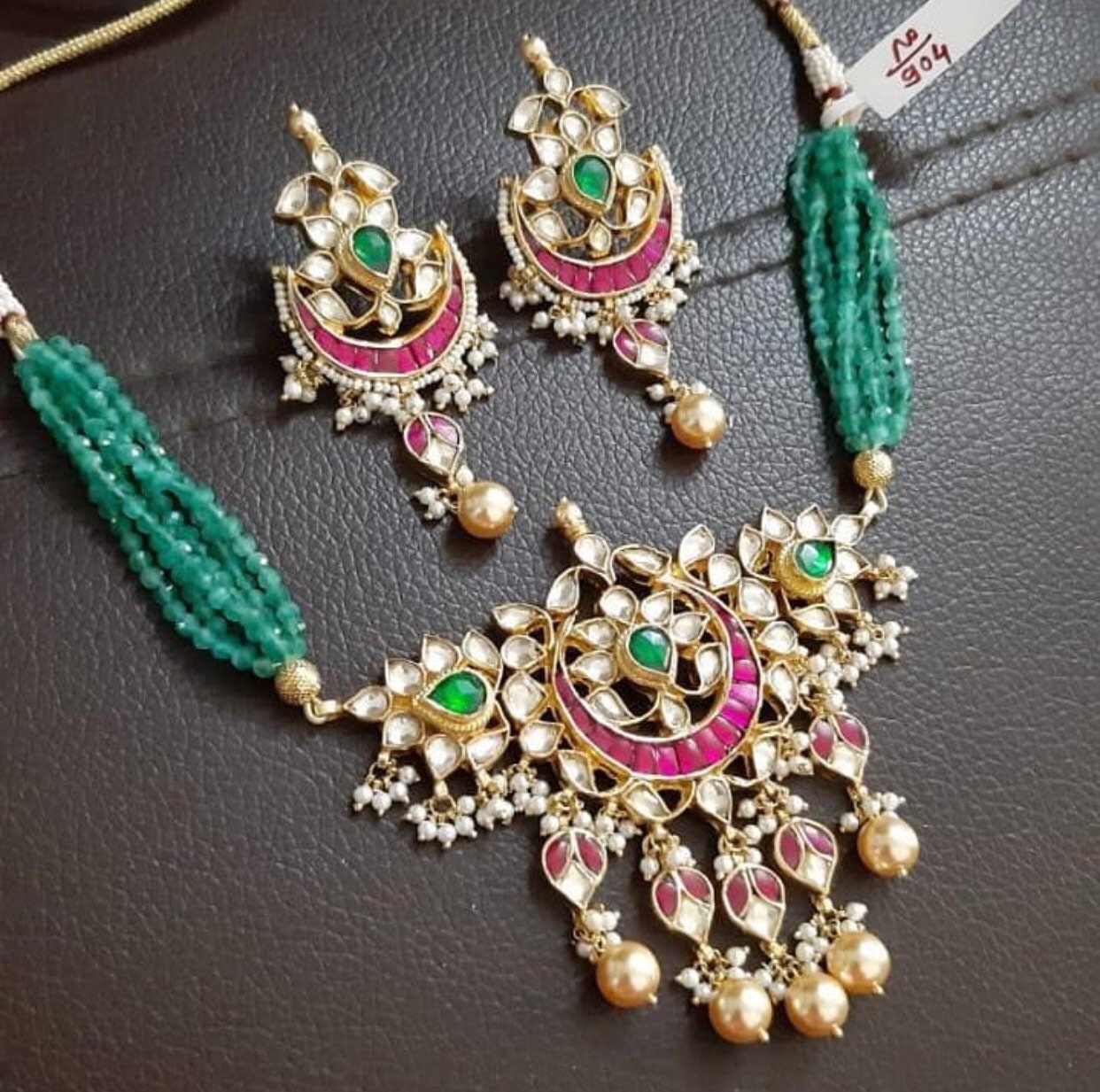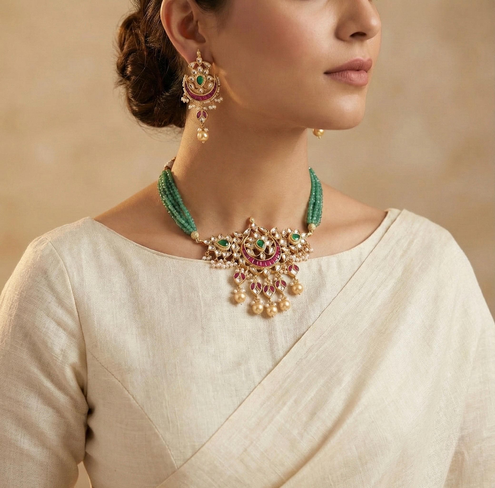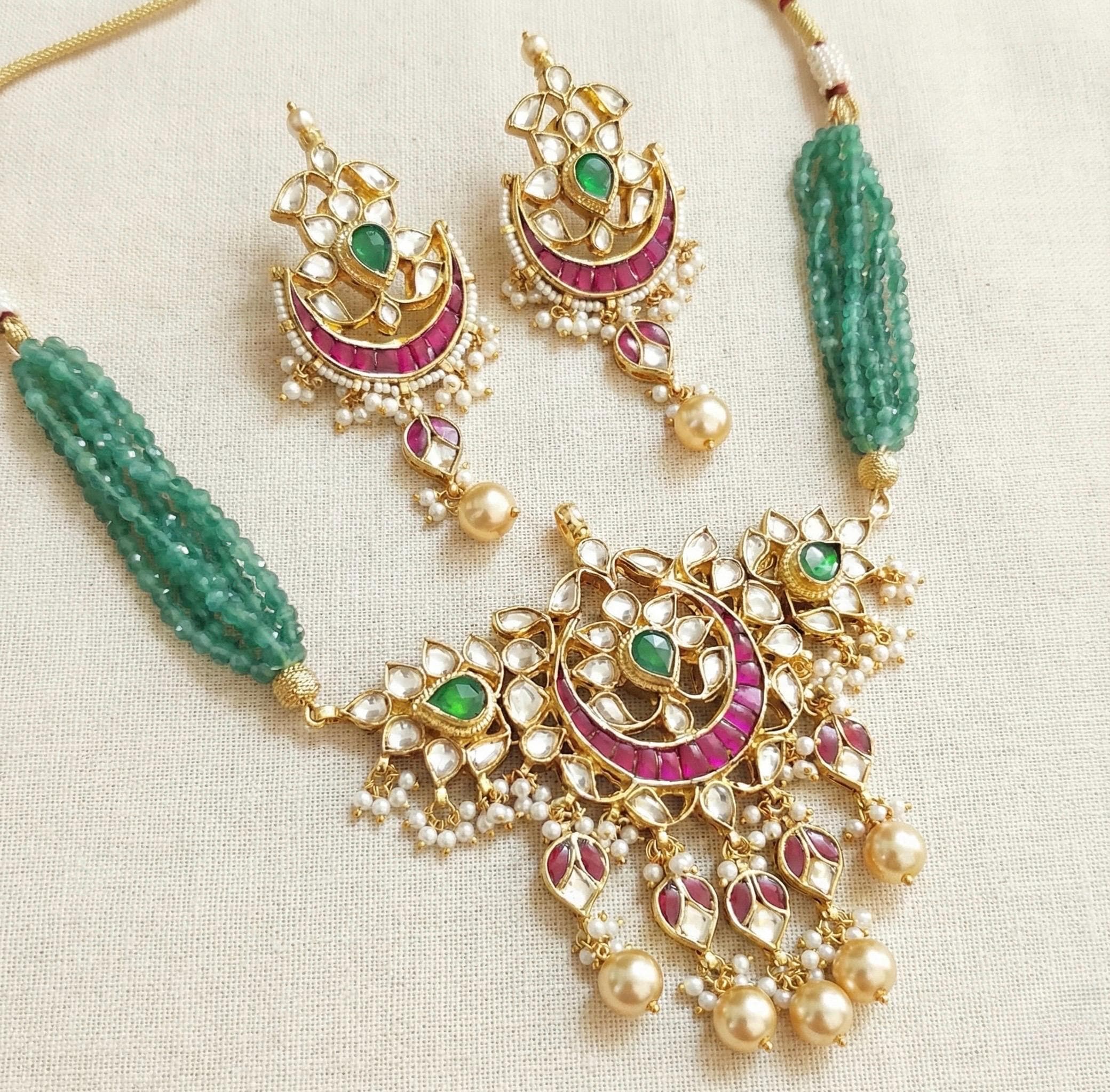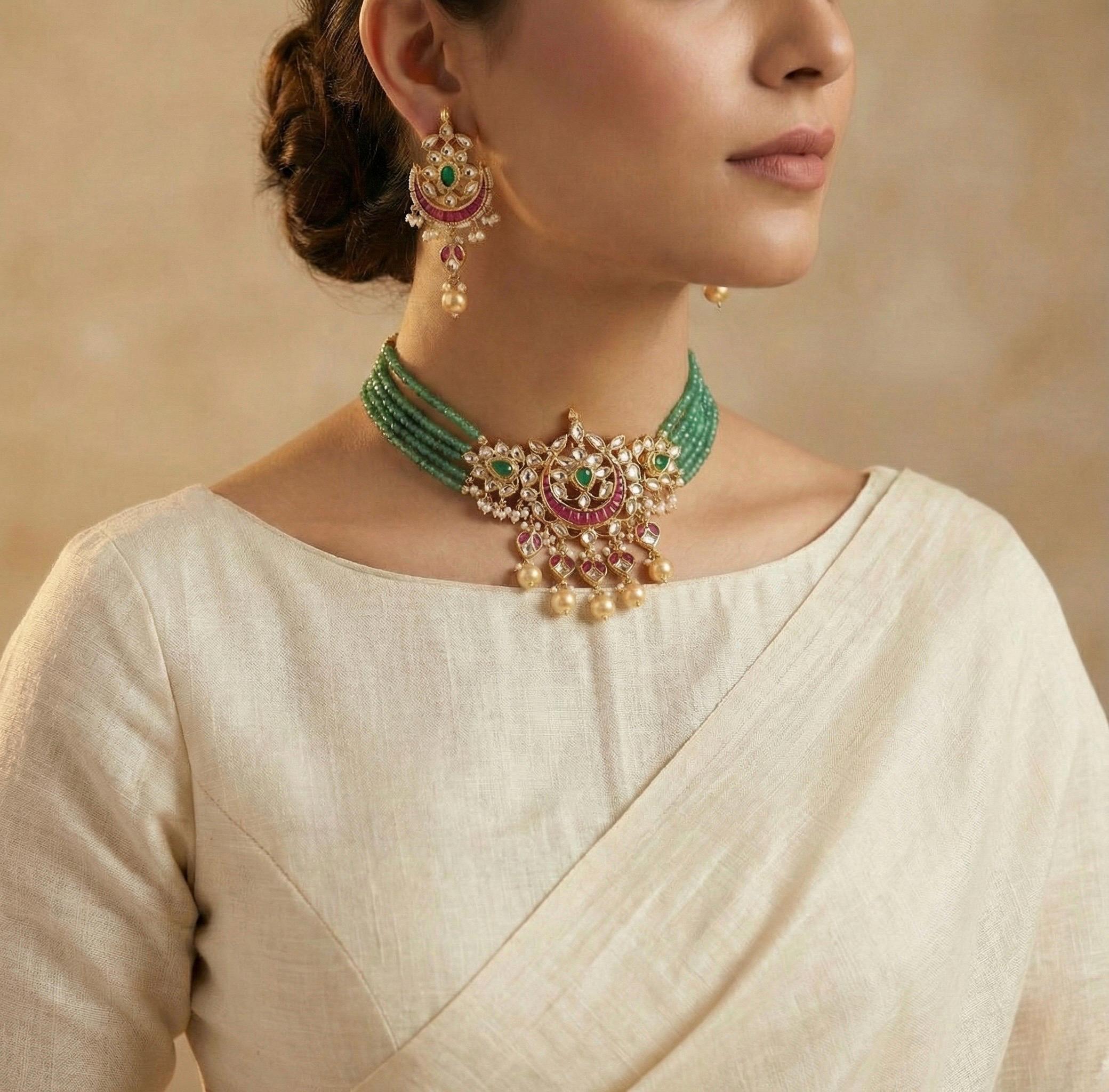 This Kundan choker set features an emerald green beaded necklace paired with elegant chandbali earrings, perfect for weddings and festive occasions.