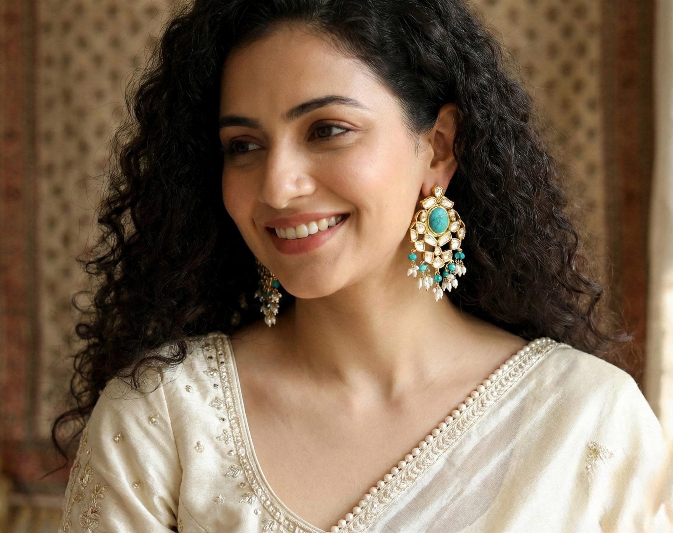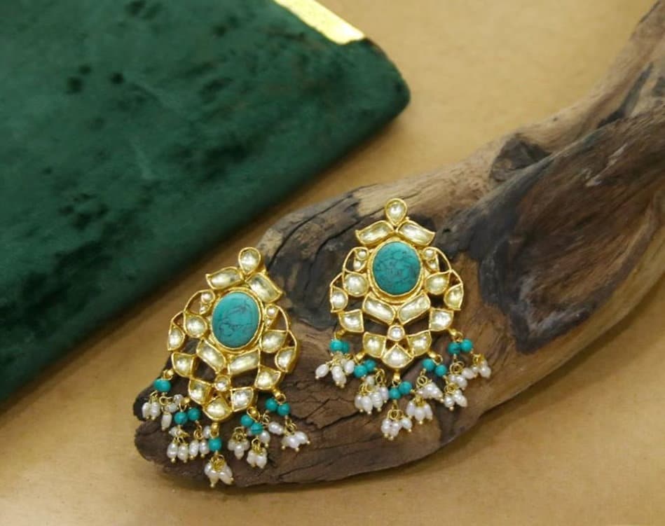 • Handmade Indian Ethnic Kundan Earrings with Turquoise Kundan and Pearl drop.