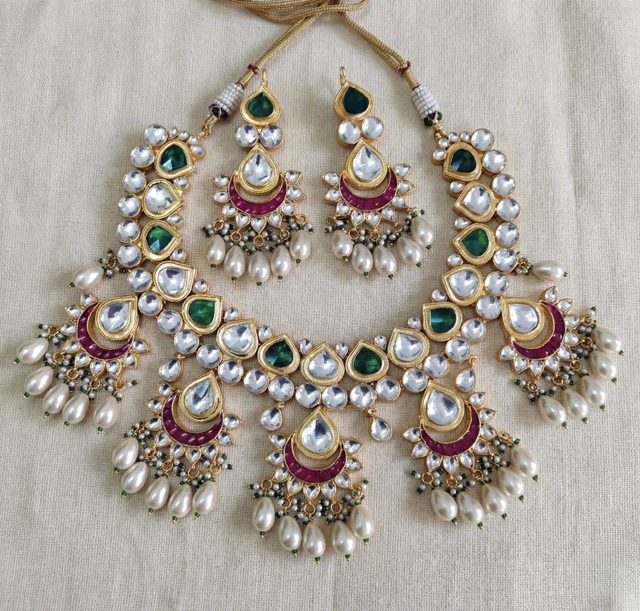 • Handmade Gold Plated south Indian Kundan Jewelry Necklace and Earrings Set.
