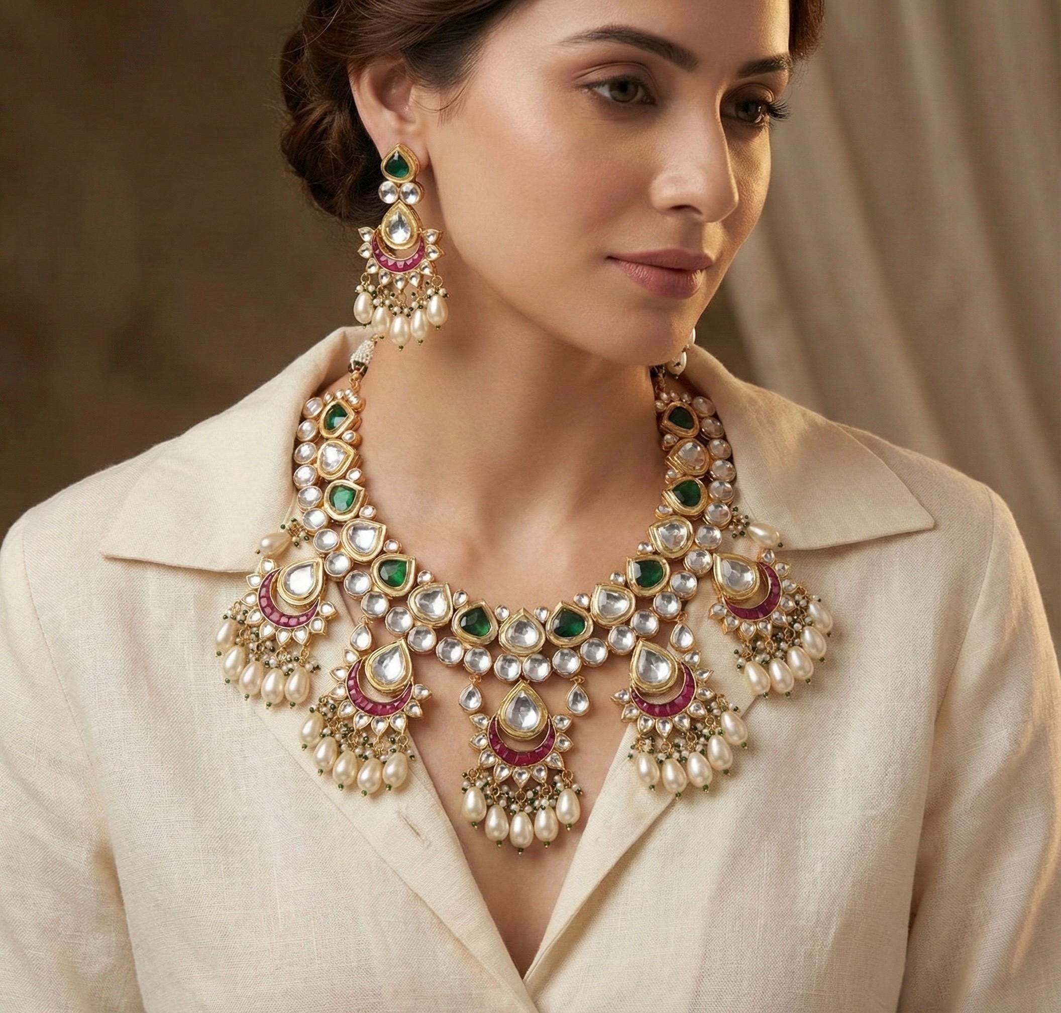 We are also providing custom made jewelry according to dress color and wedding requirements including designer pieces replication of custom design. You can contact us for custom requirement by providing your designs for Kundan Jewelry. We will be happy to replicate it according to customer demand.